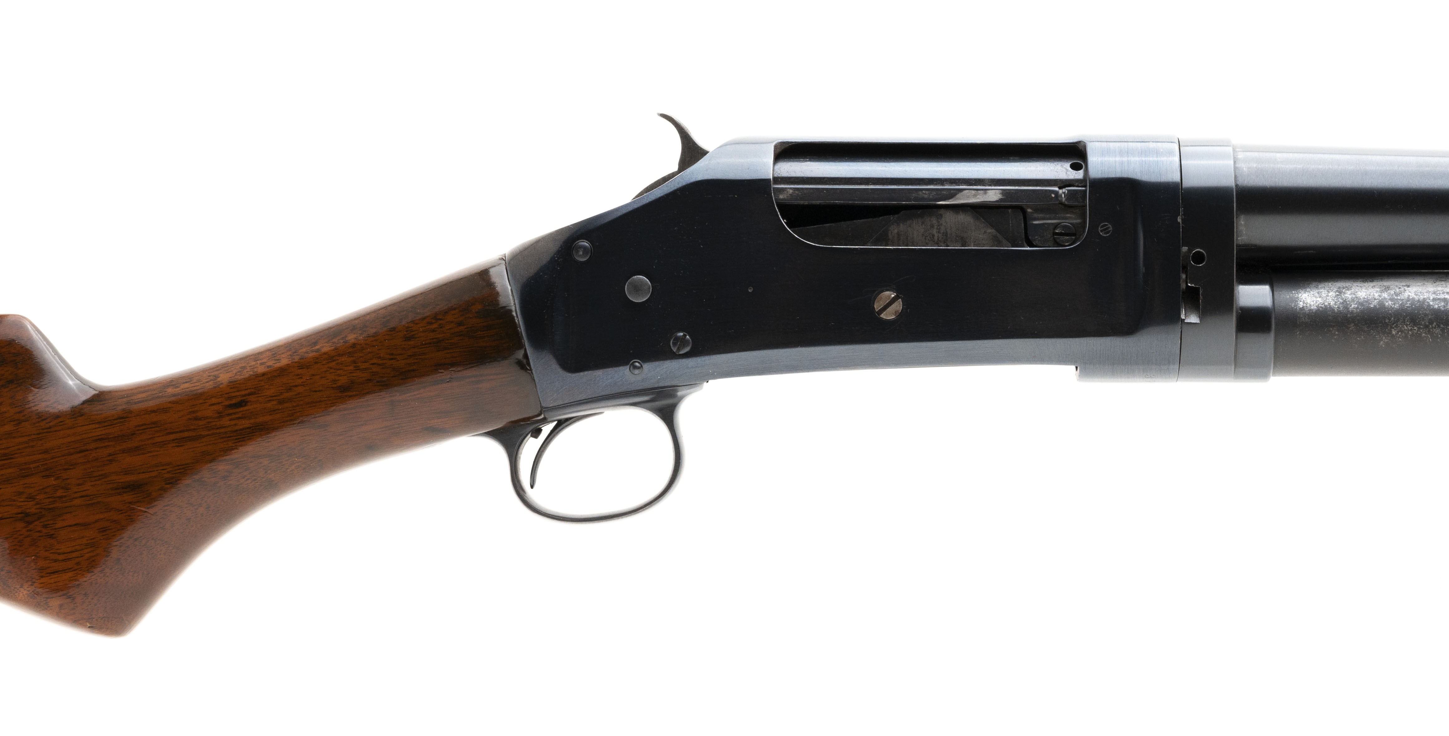 Slide action hammer field gun made in 1909. The receiver has been refinished. Stock and forend have been refinished, there are sparse handling marks. Barrel has been cut and is 23.5" barrel. Length of pull is 13.5" over a recoil pad. Very good overall condition.