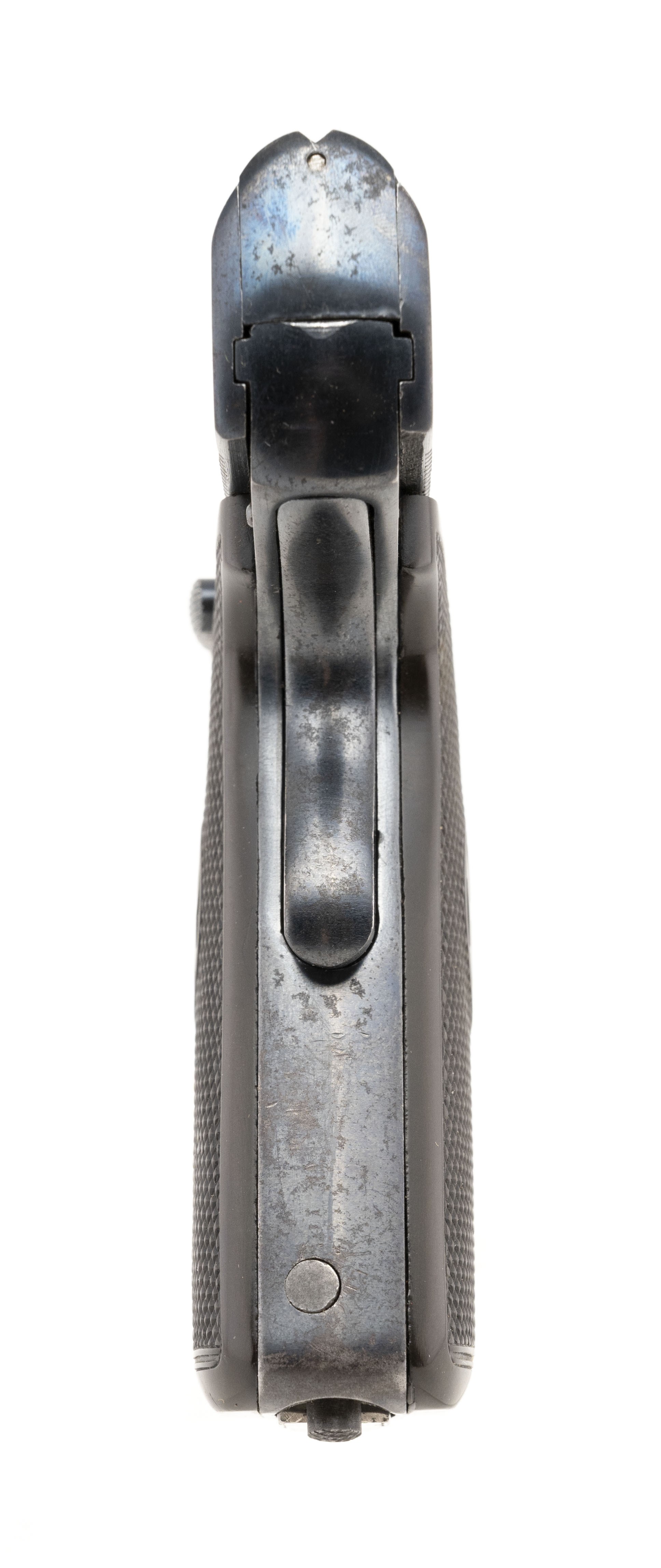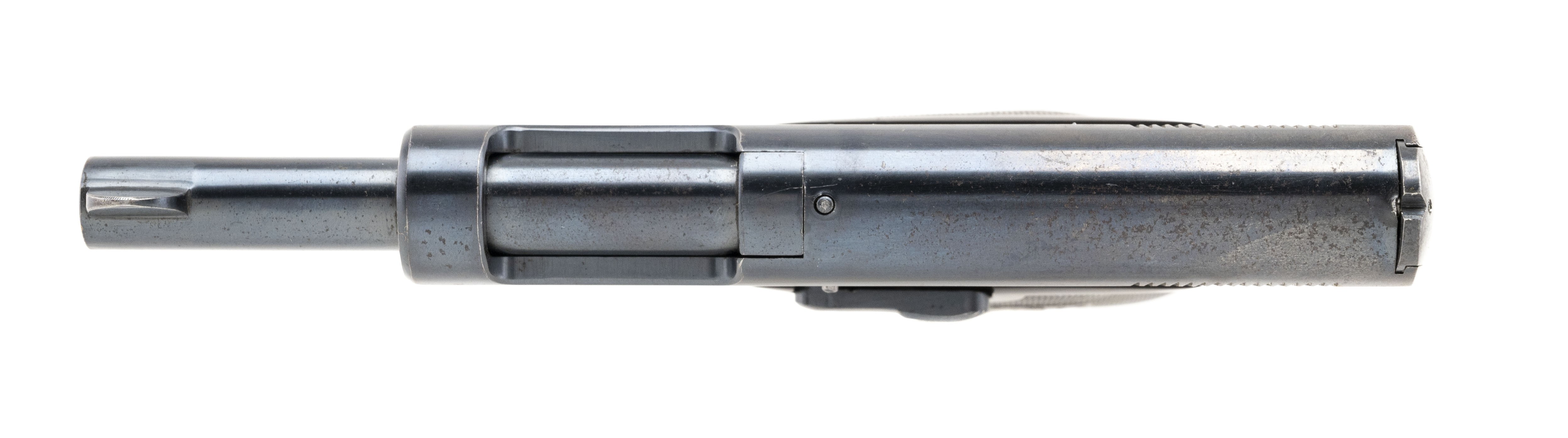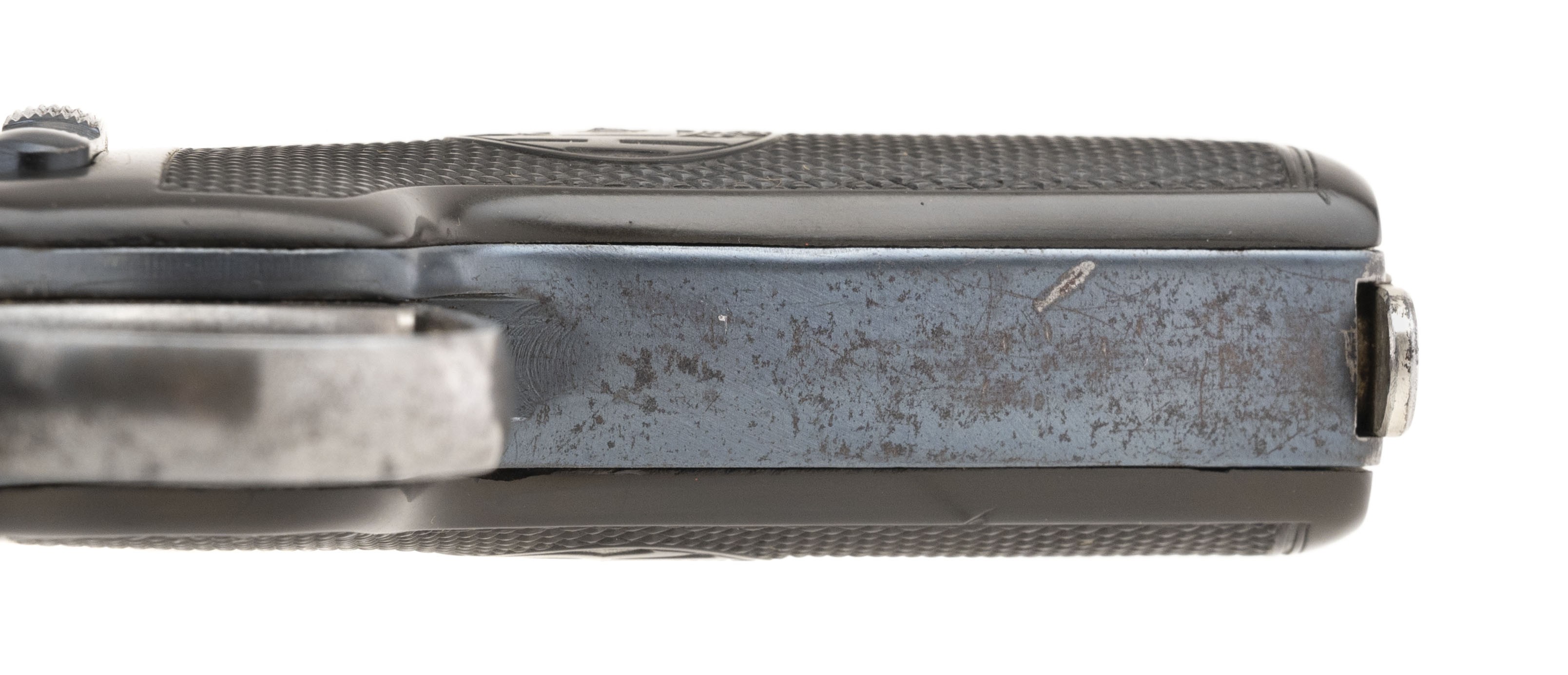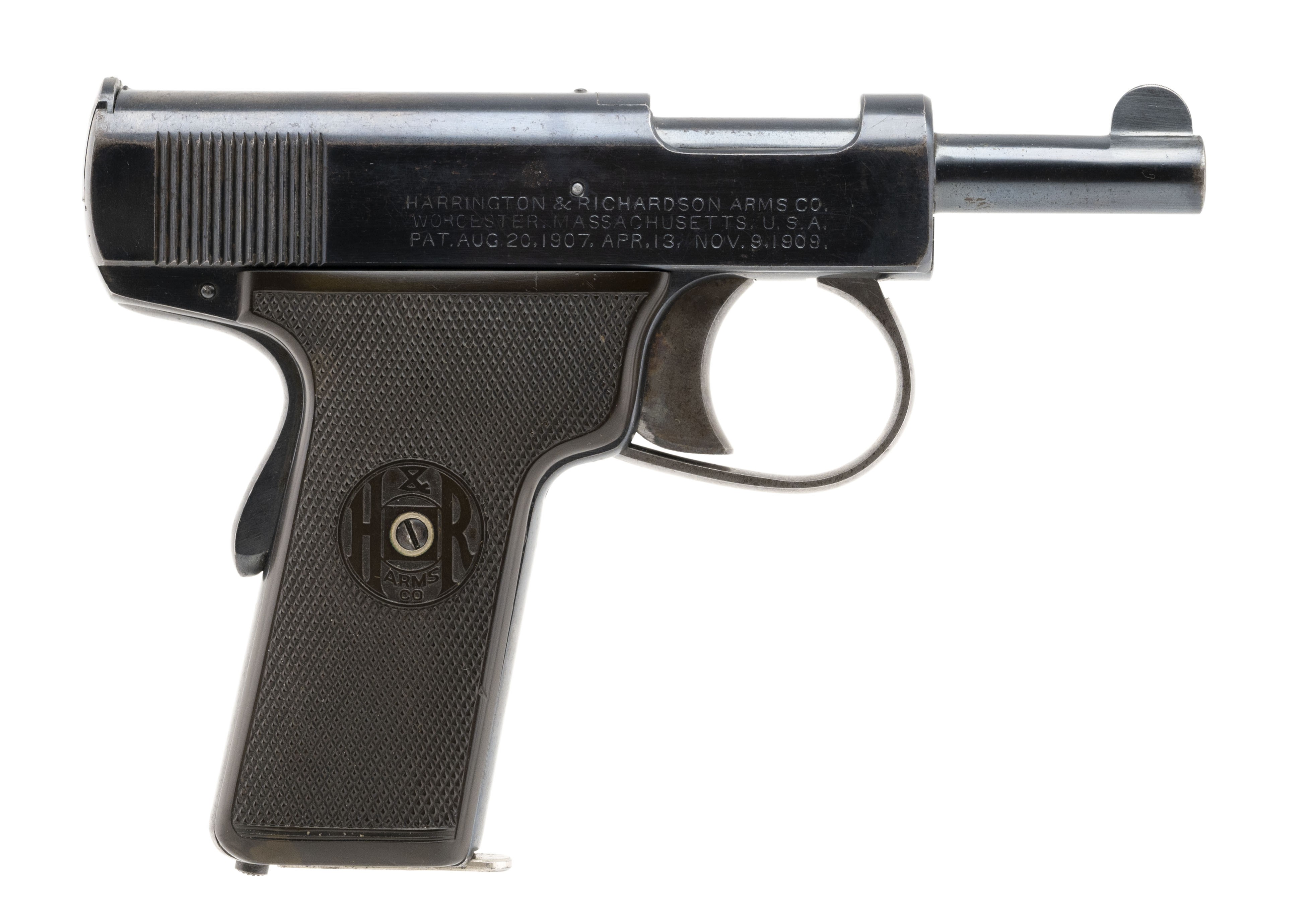 The 8 shot Harrington & Richardson self loading 32ACP pistol was manufactured from 1914 to 1924. The 3.5" barrel has an excellent bore and the gun has approx. 98% blue. The trigger shows its case colors. The right side of the slide is marked HARRINGTON & RICHARDSON ARMS CO. over WORCESTER, MASS. U.S.A. over PAT. AUG.20.'07. APRIL 13, 1909 with the left marked H&R SELF-LOADING CALIBER 32. The checkered plastic grips are excellent with no cracks of chips. The action functions correctly. This is a top notch H&R 32 self loading pistol.