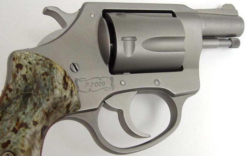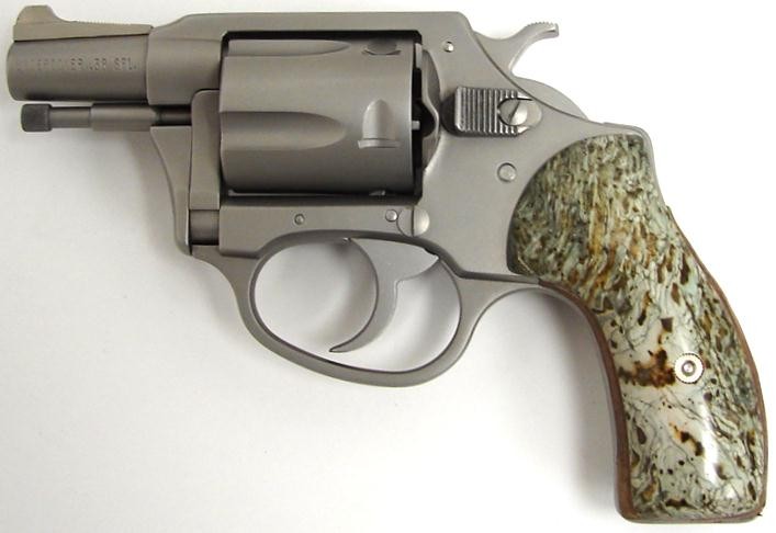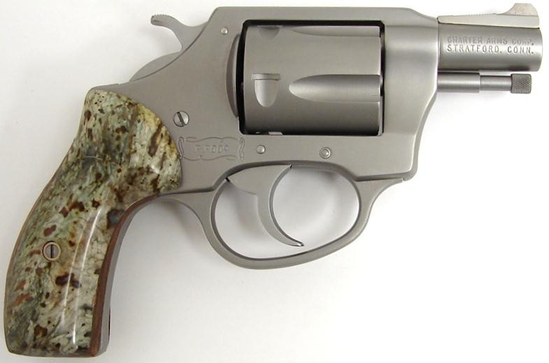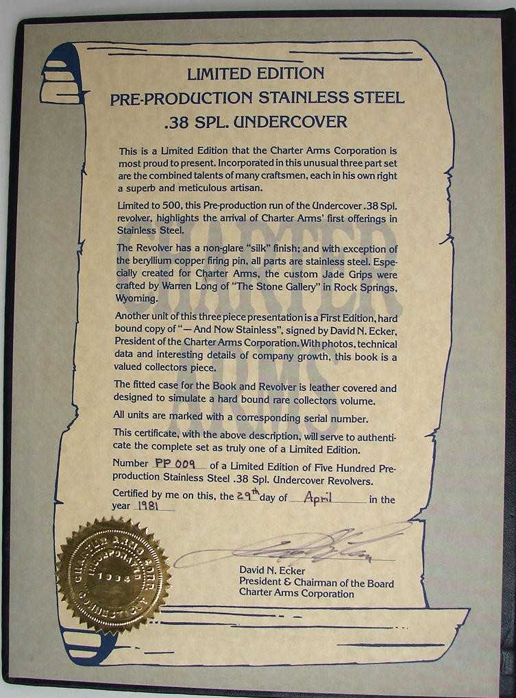 Charter Arms Undercover .38 Special caliber revolver. Limited edition "pre-production" model stainless steel revolver with custom jade grips. This gun was issued in 1981 to commemorate Charter's first stainless gun. Only 500 made, cased in a leather bound "book" case, with a copy of the Charter Arms book. A neat set.