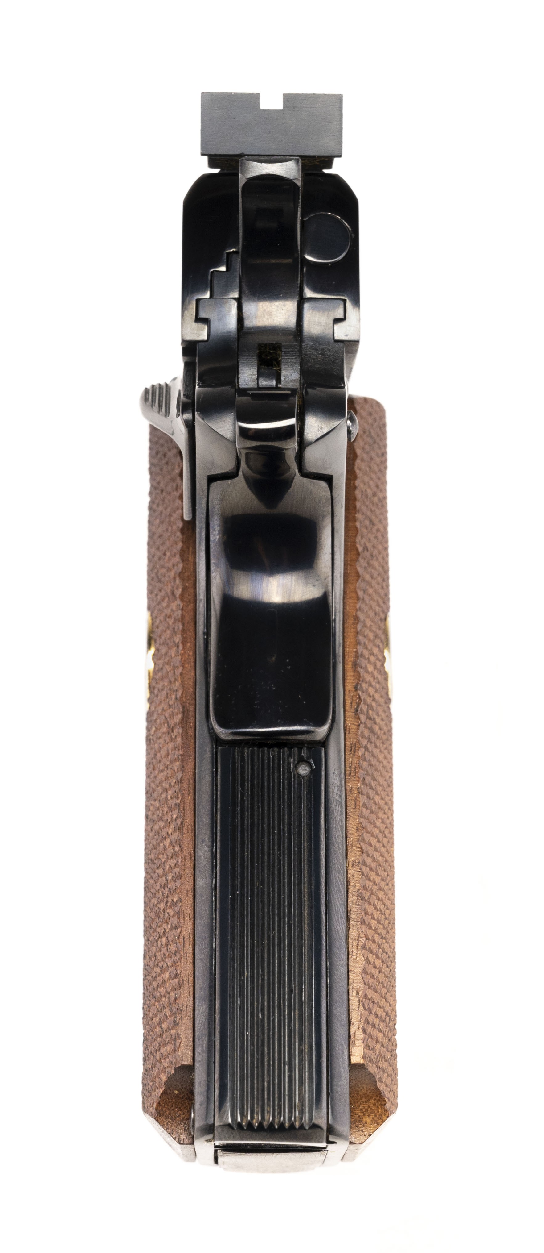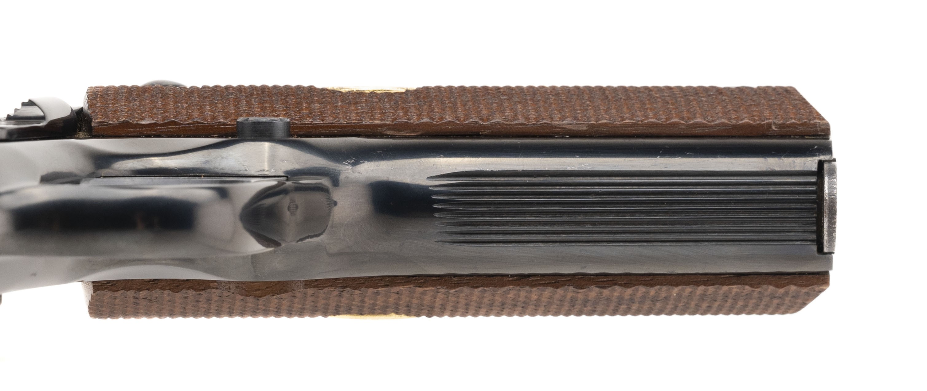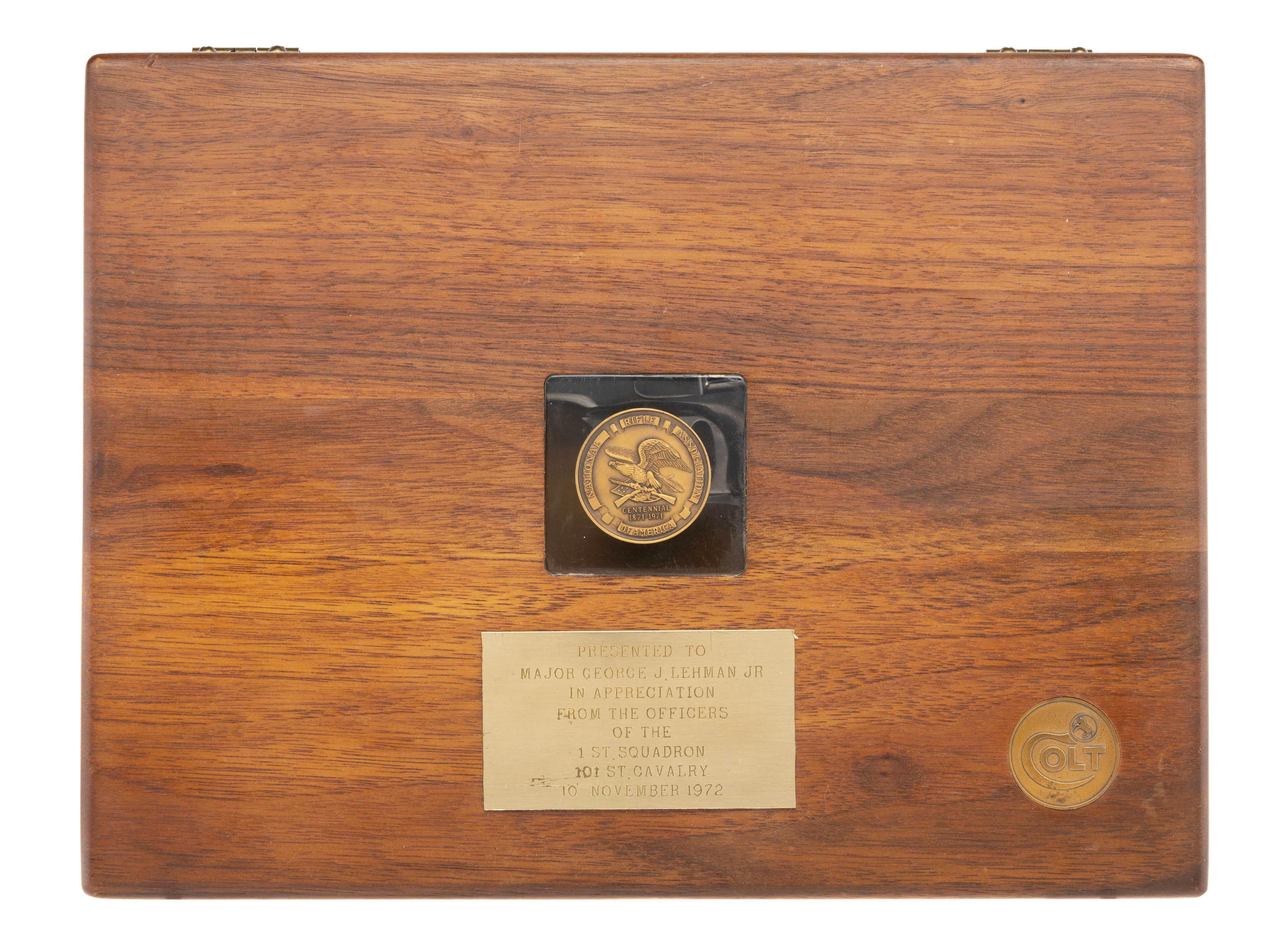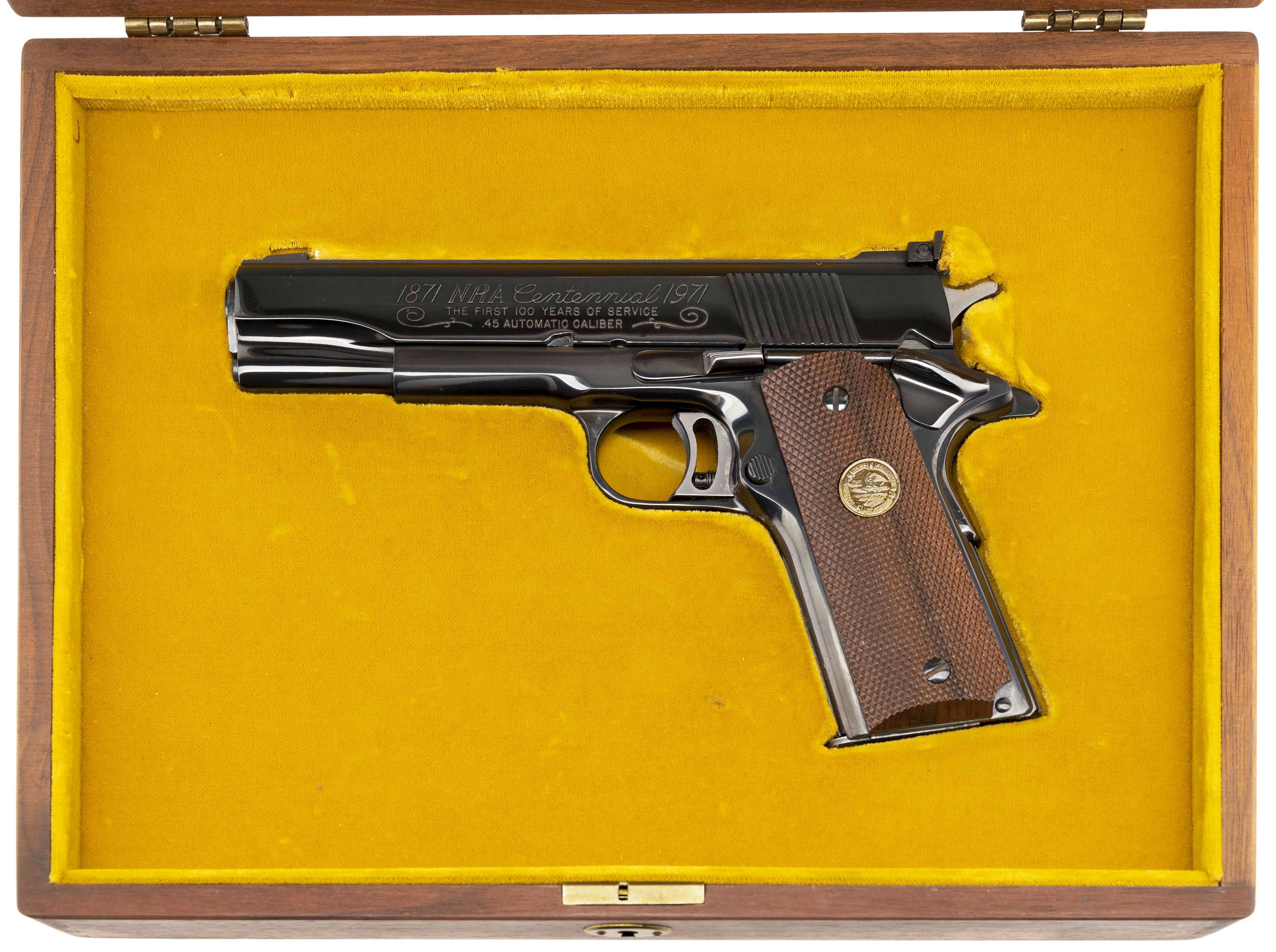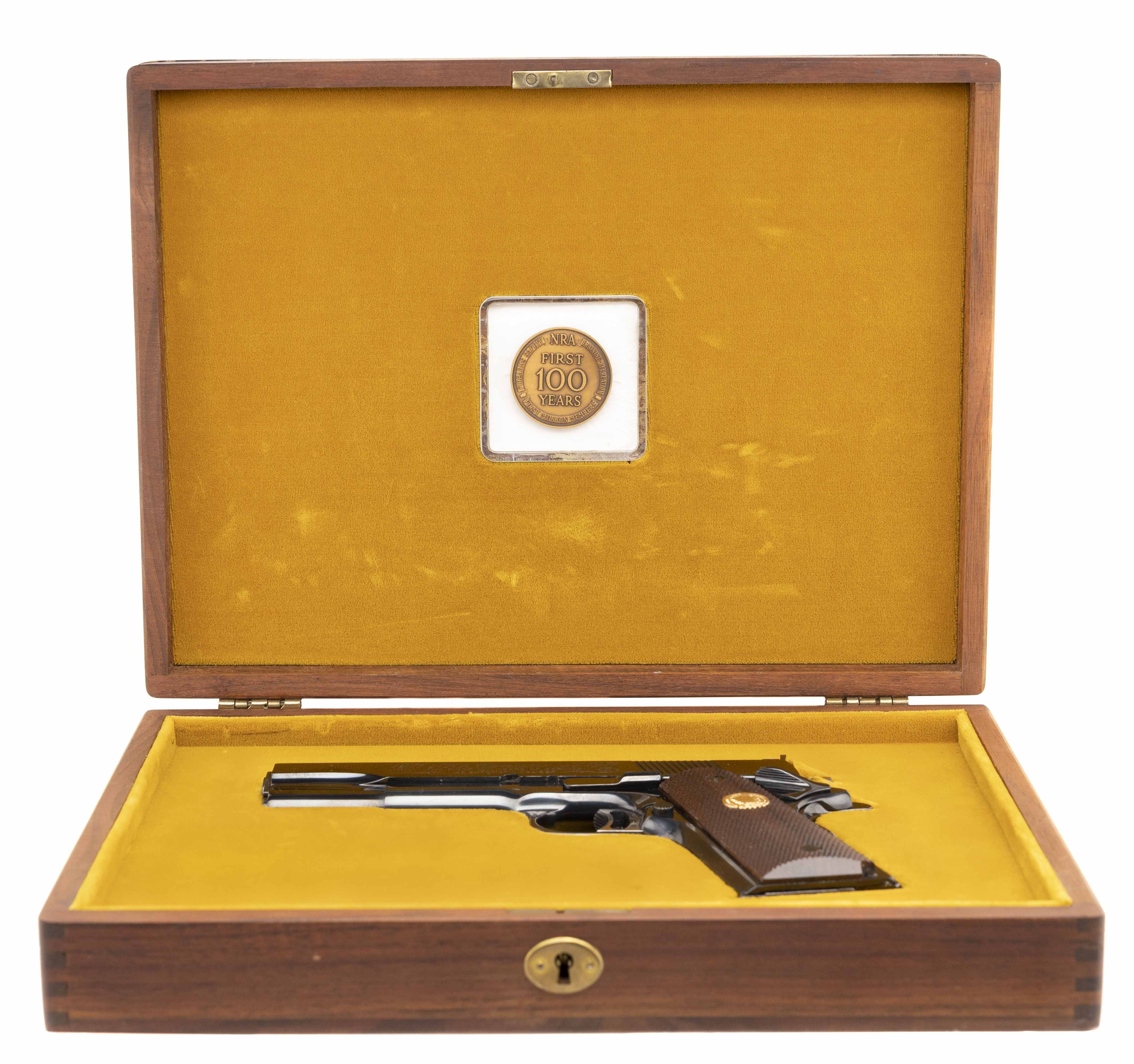 Cased NRA Centennial Colt Gold Cup Commemorative. The pistol is in excellent condition. The box has a plaque on the lid presenting the gun to Major George J. Lehman Jr in 1972. The overall condition of both the gun and its case is excellent.
