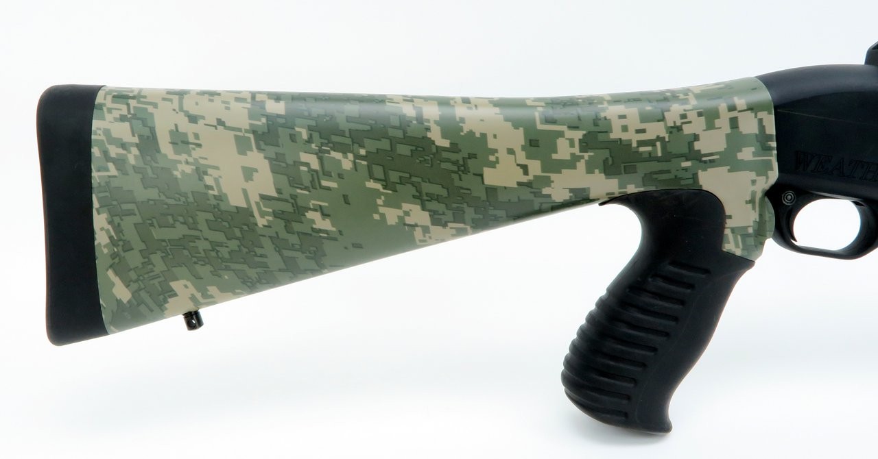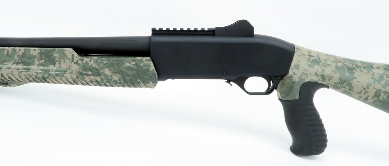 Weatherby PA-459 12 Gauge shotgun. Pump action tactical riot gun with ghost ring sights. Camo pistol grip stock.