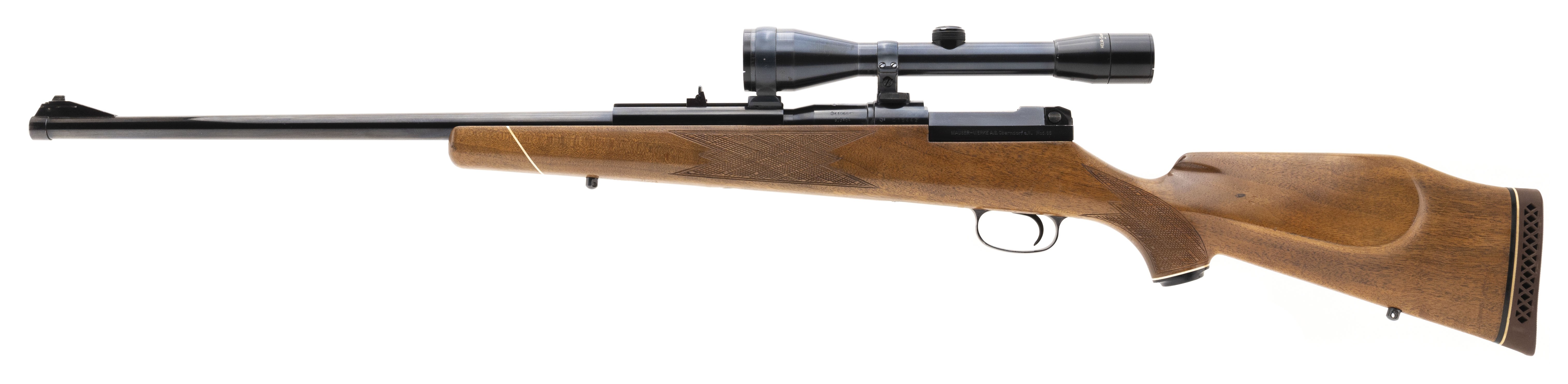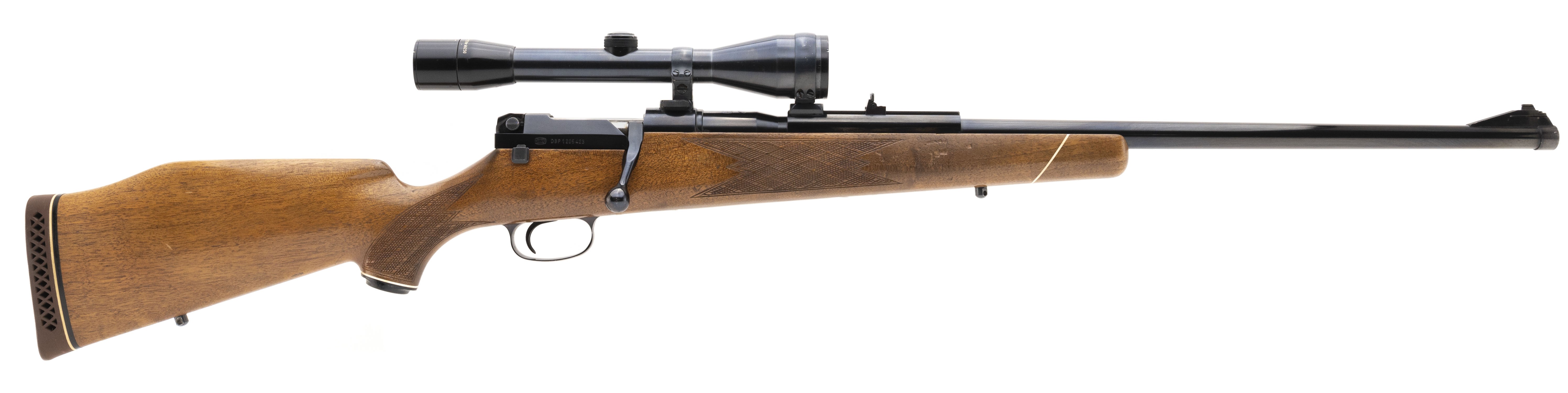 W. German made bolt action sporter in scarce 9.3x64 caliber. Has a Kahles 6X scope on claw mounts. The metal is about excellent and the wood has some marks from hunting. A nice setup.