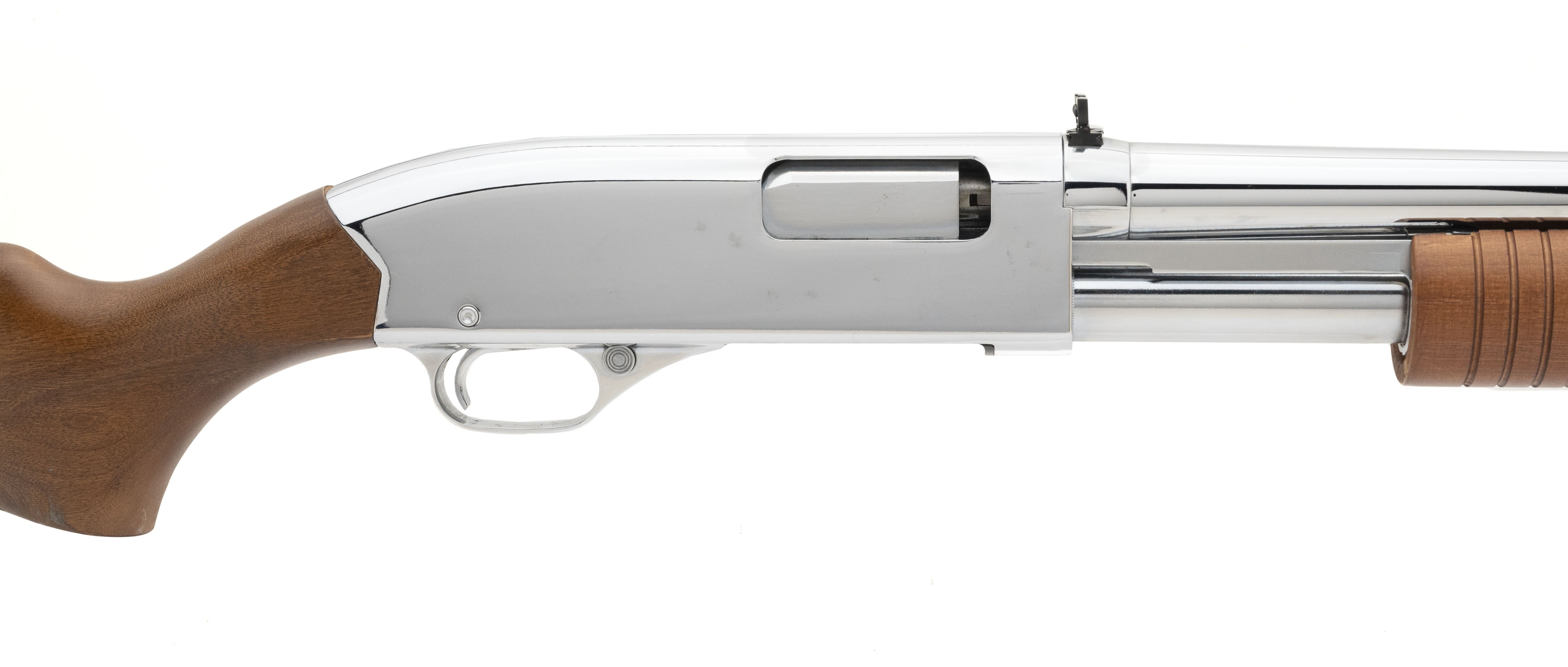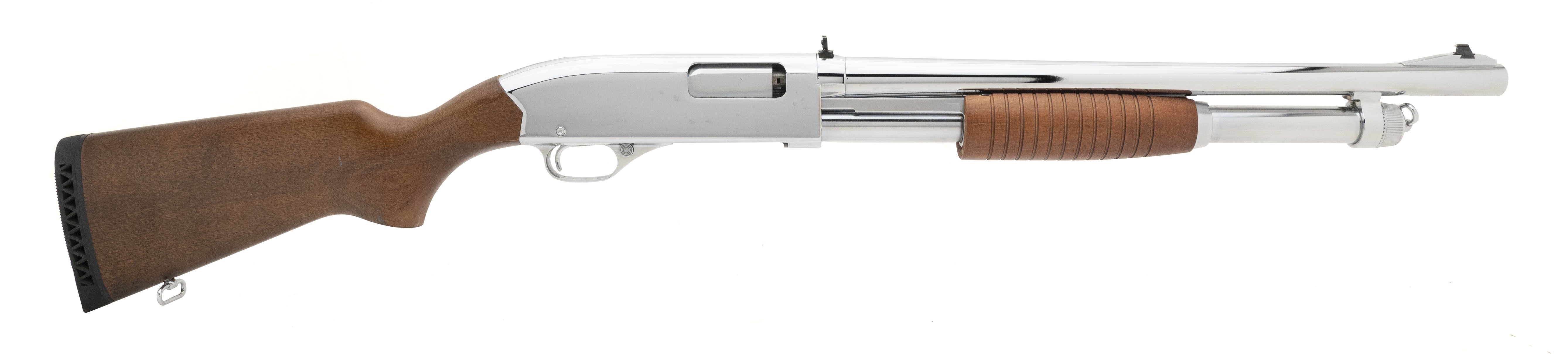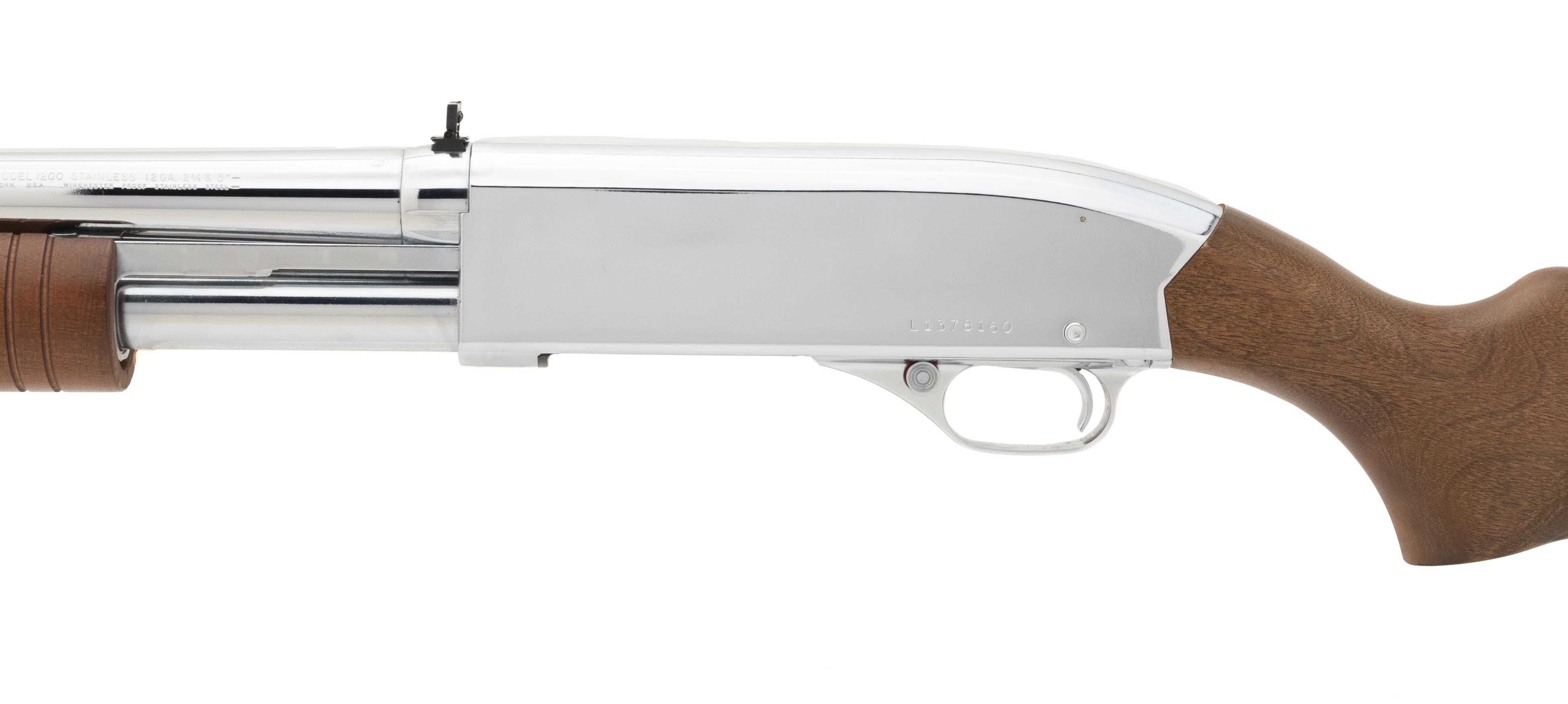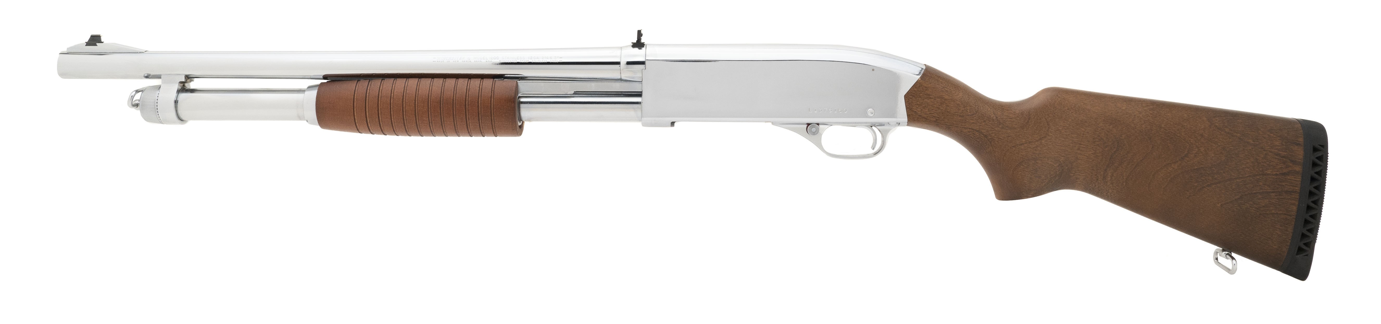 Scarce stainless Marine pump gun with 18" smoothbore barrel with rifle sights, and wooden stock. Excellent condition with light use.