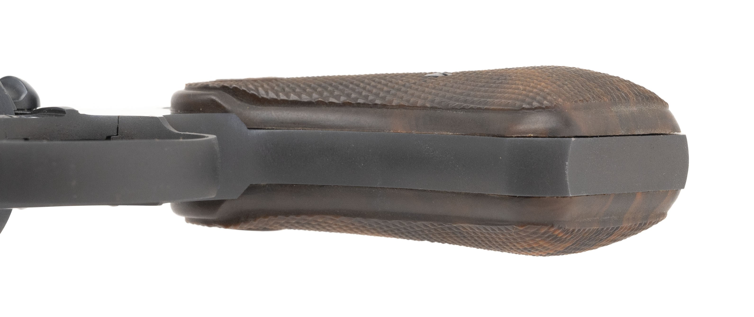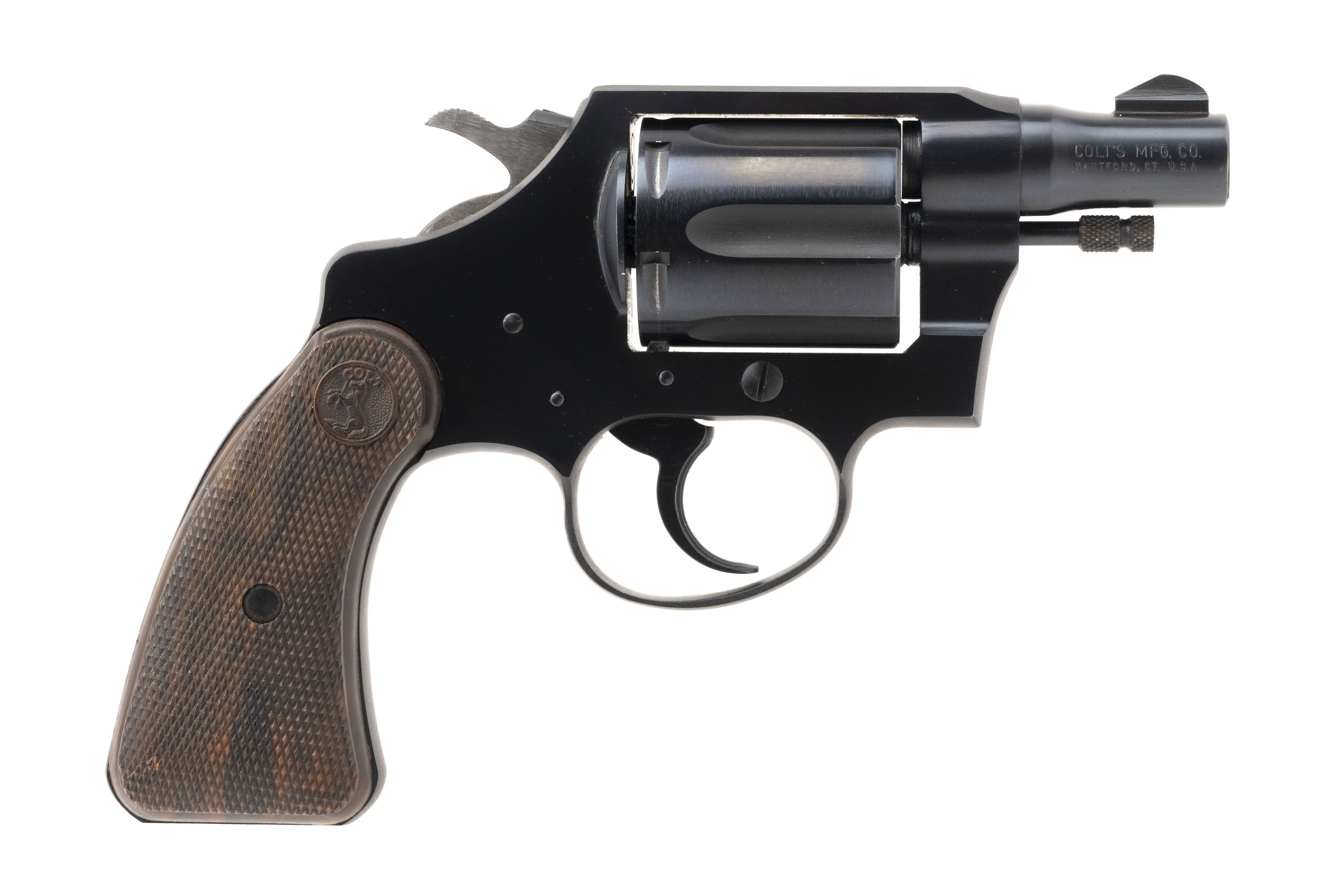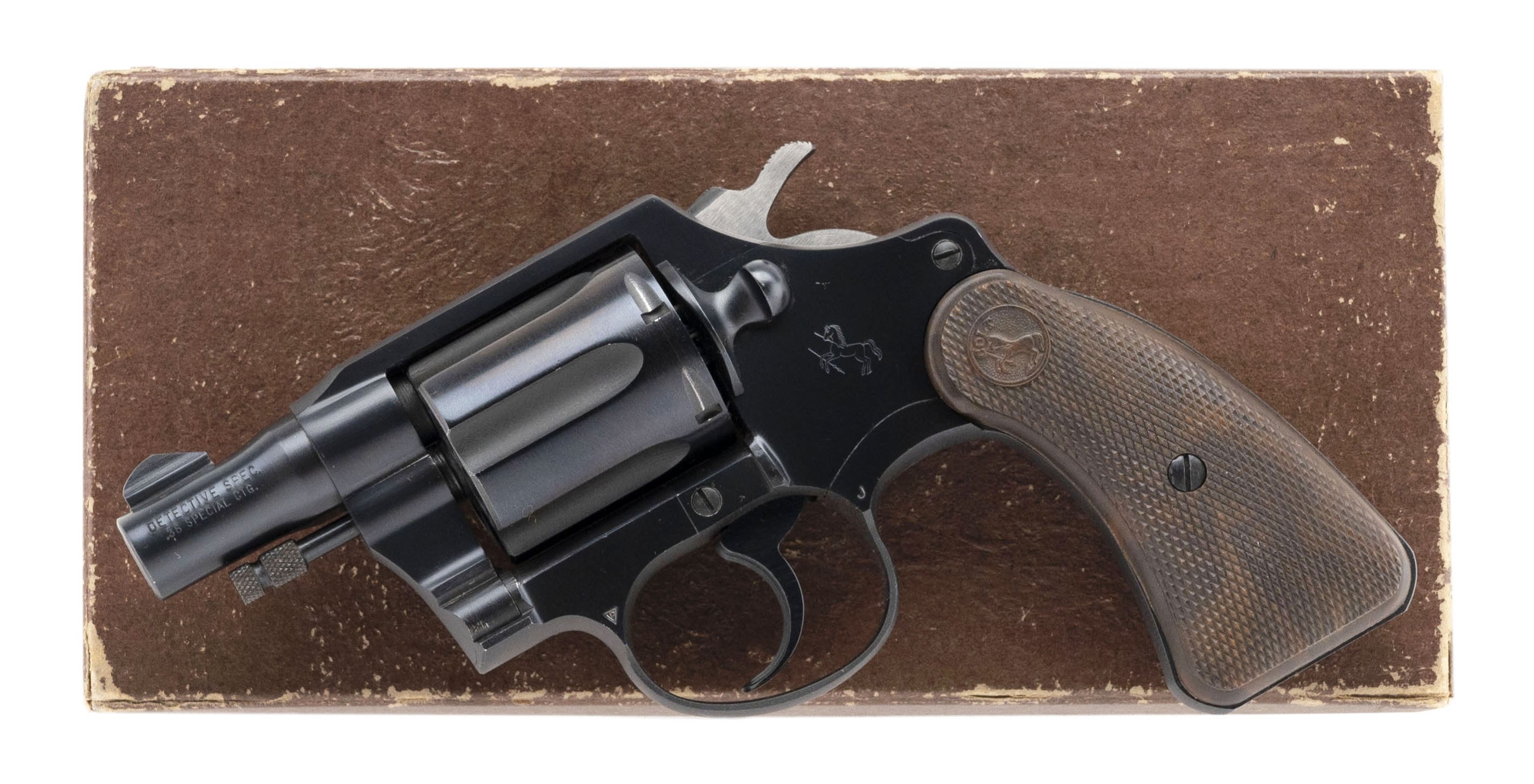 2" blue snubnose revolver made in 1952. The gun is in excellent condition with 100% blue. Has the correct "Coltwood" plastic grips. Comes in the original box numbered to the gun. A nice example.