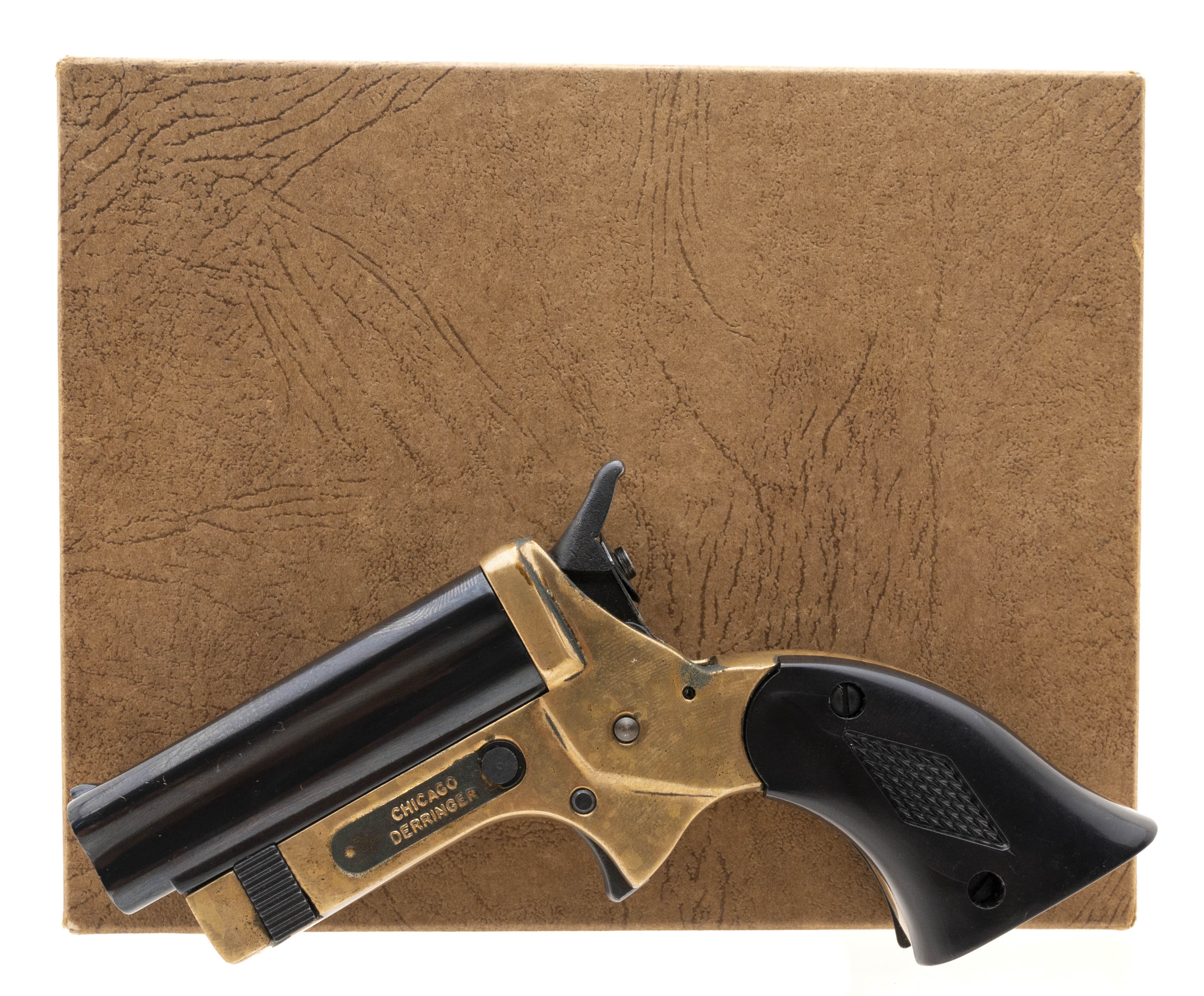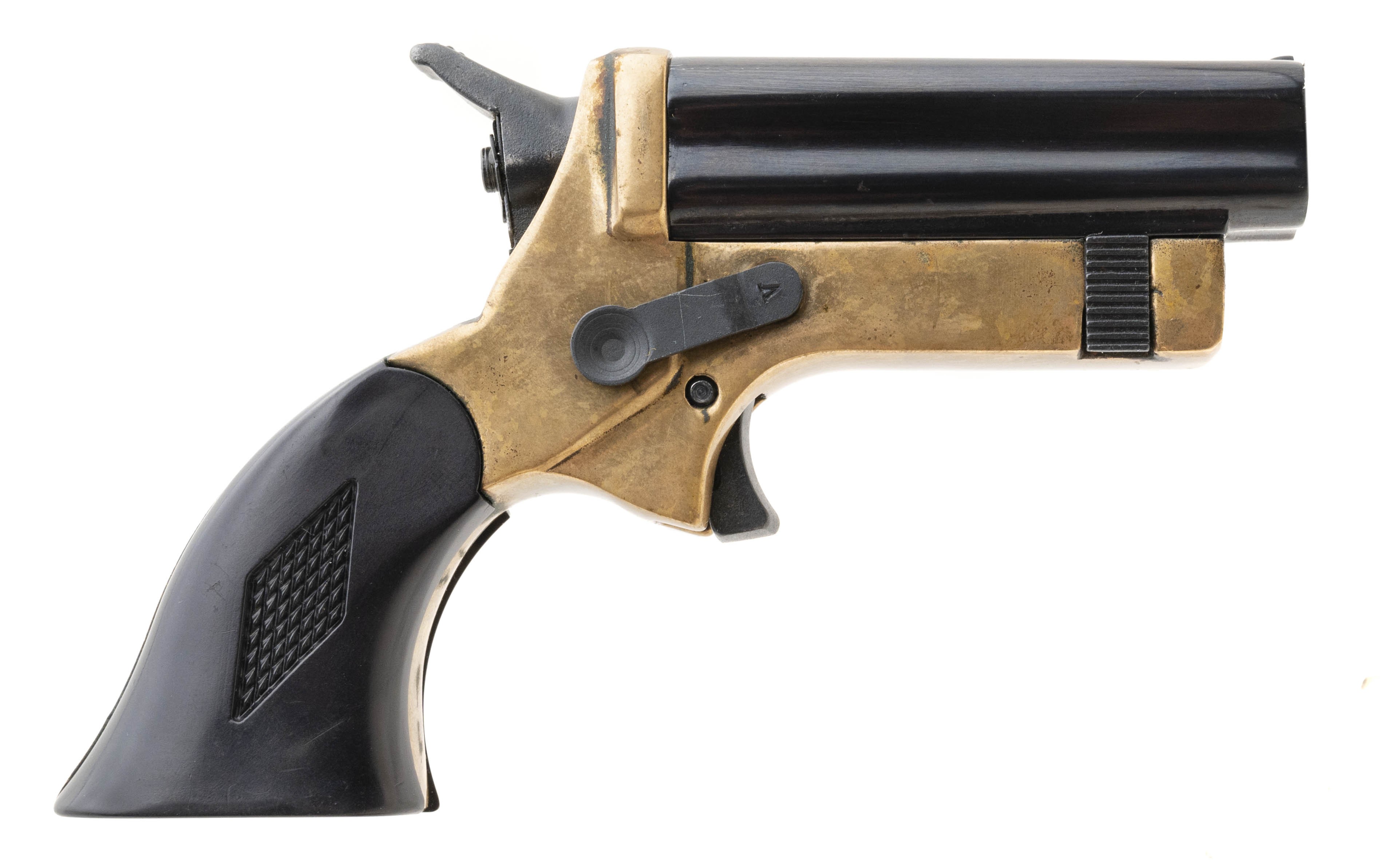 Modern brass frame 4-shot derringer similar to a Sharps derringer. Excellent condition with box.