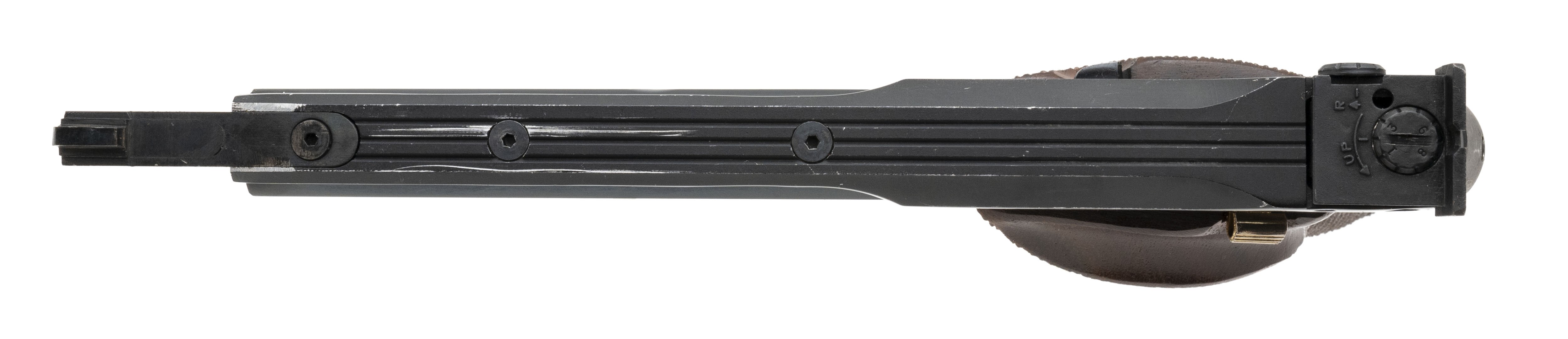 Top of the line target pistol, made in Hamden, Conn. Has a 4.5" barrel and an extended front sight rib. Shows some wear to the finish, overall very good condition.