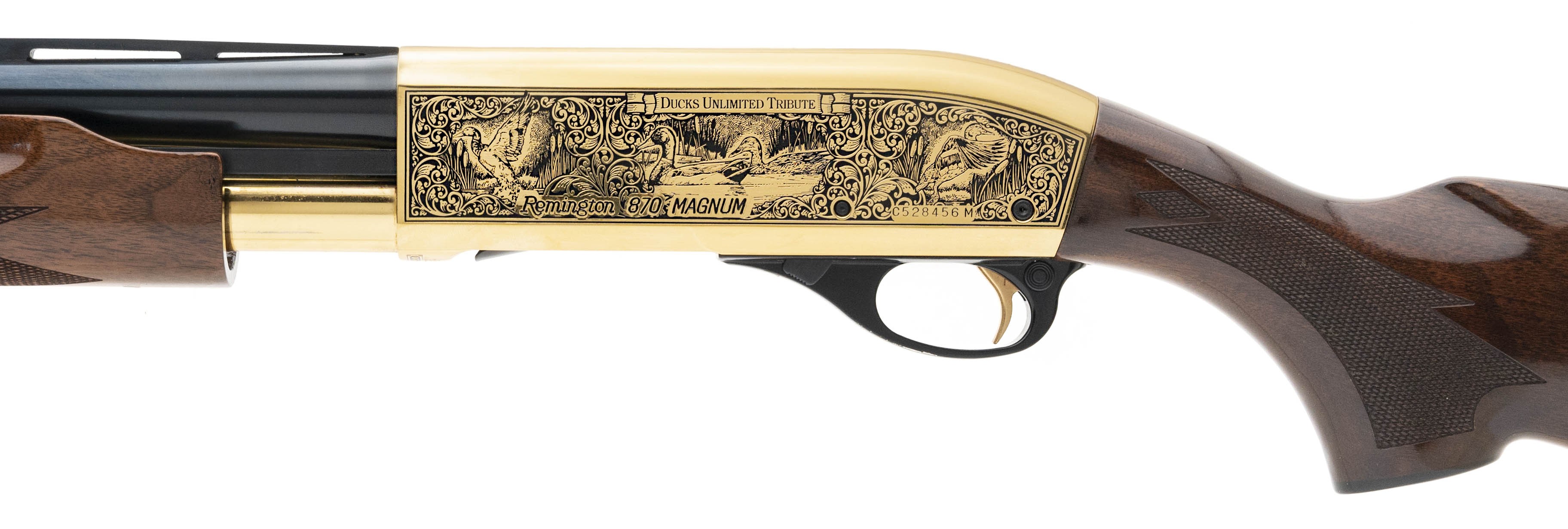 Ducks Unlimited Tribute model with 28" vent rib barrel and screw in choke. Chambered for 3" shells. Has 24k gold engraved receiver and gold magazine tube. The stock and forend are excellent high polish walnut. Overall excellent condition.