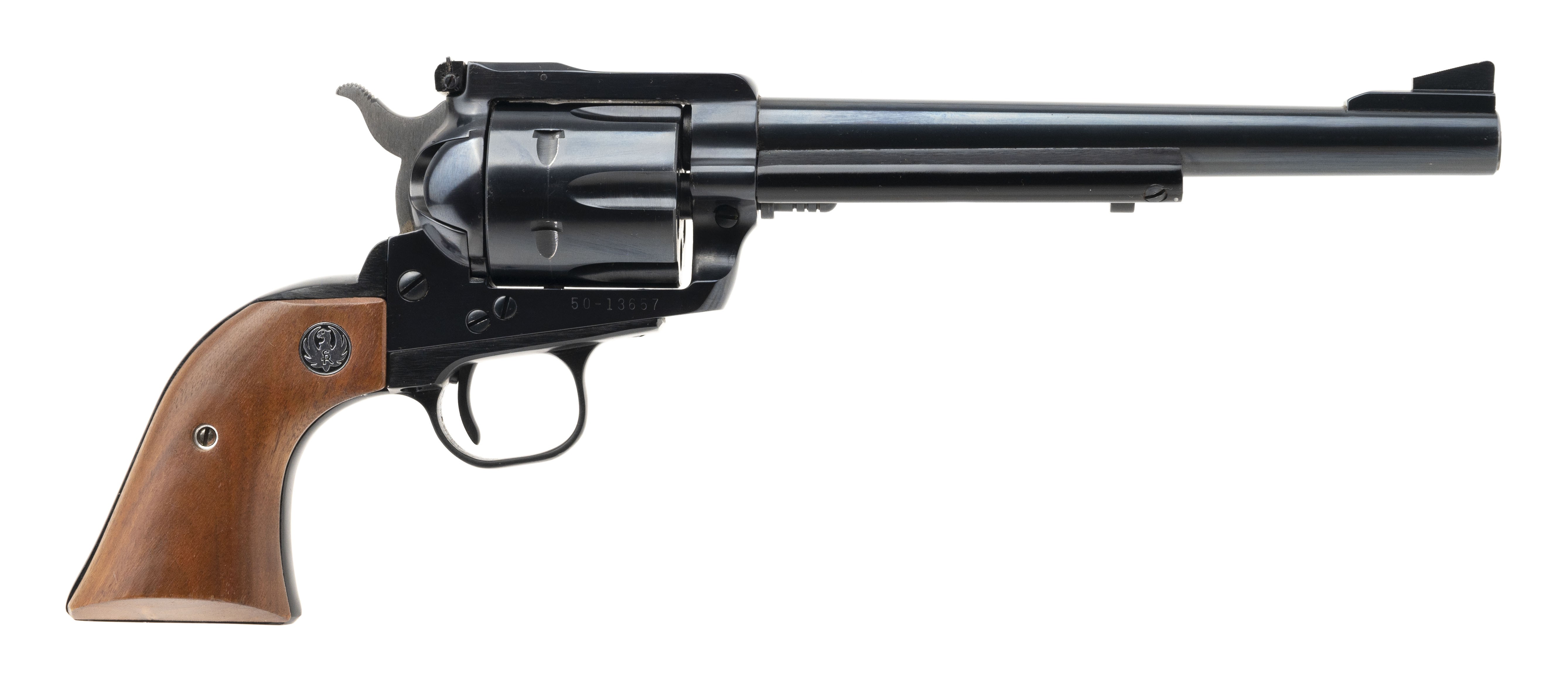 Original 3-screw old model single action revolver in scarce .30 carbine caliber. Has not had the transfer bar alteration. Has a 7.5" barrel and blue finish. Near excellent condition with very light handling wear.