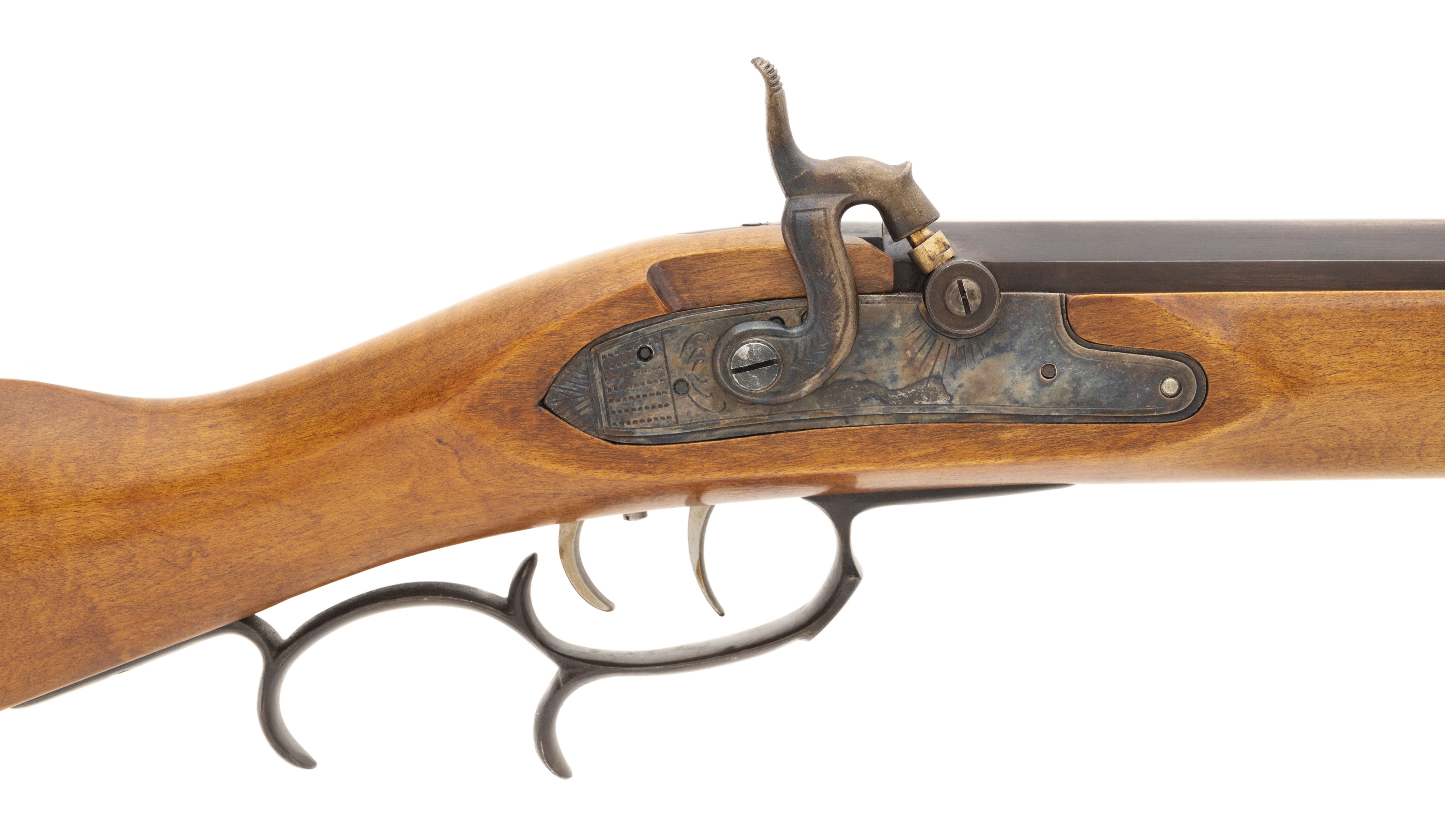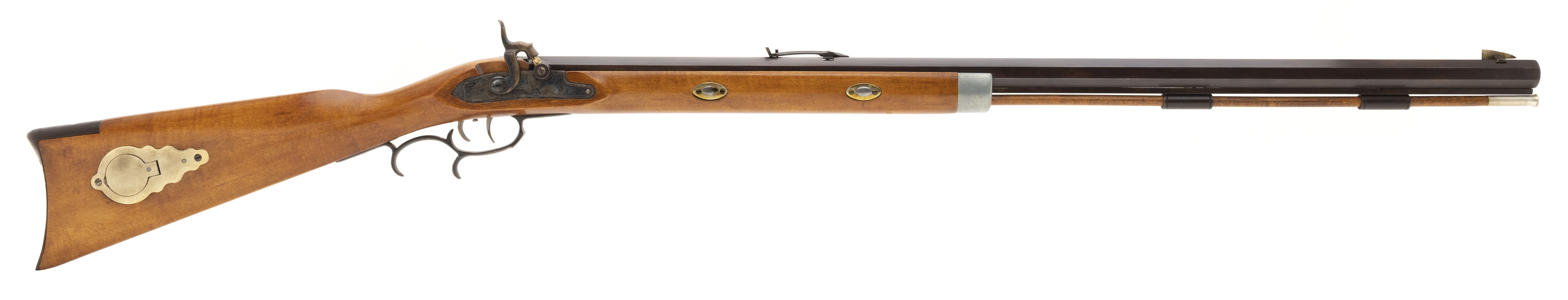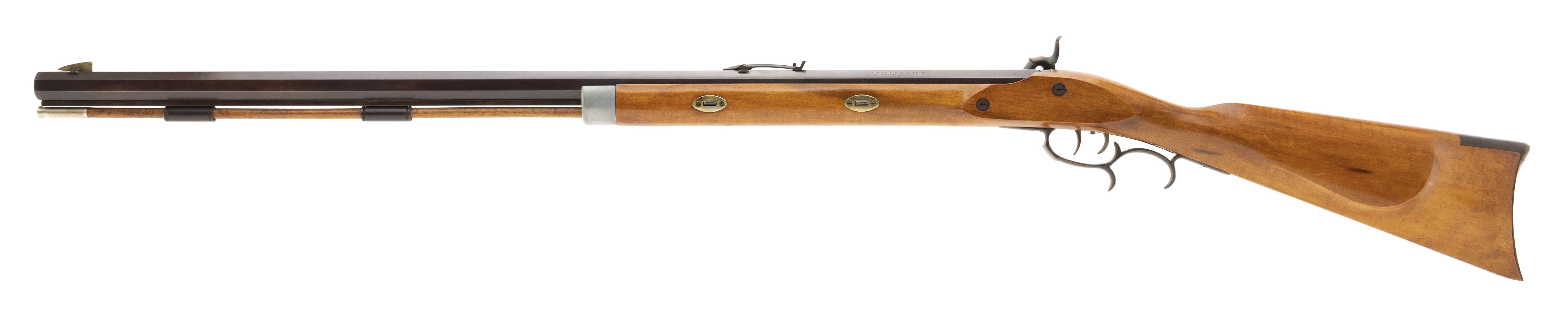Replica black powder .45 caliber percussion rifle. Has a 32" barrel and brass patchbox. Very good condition.