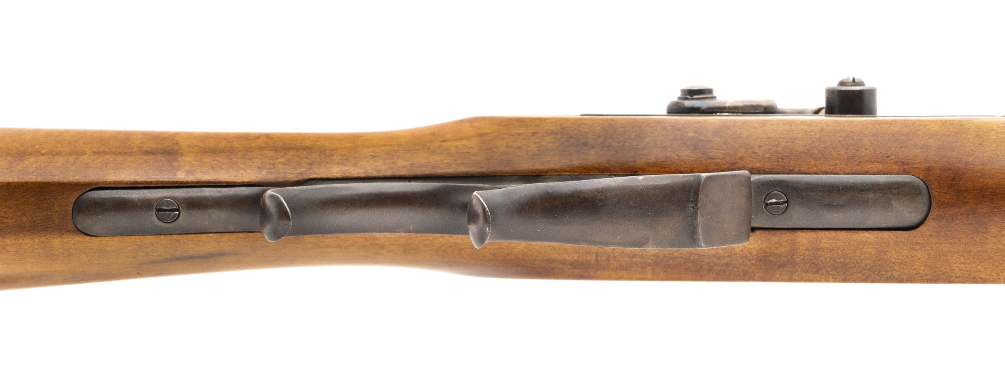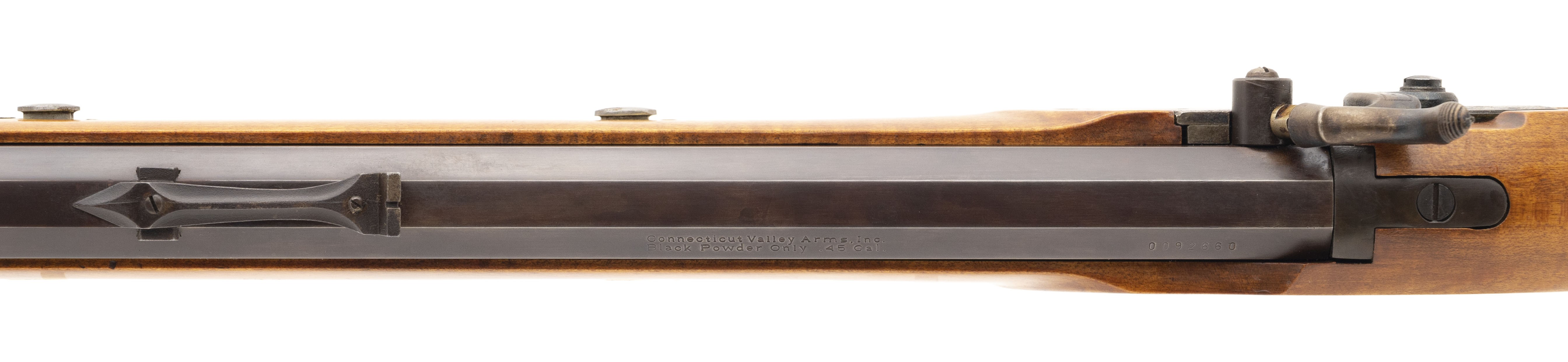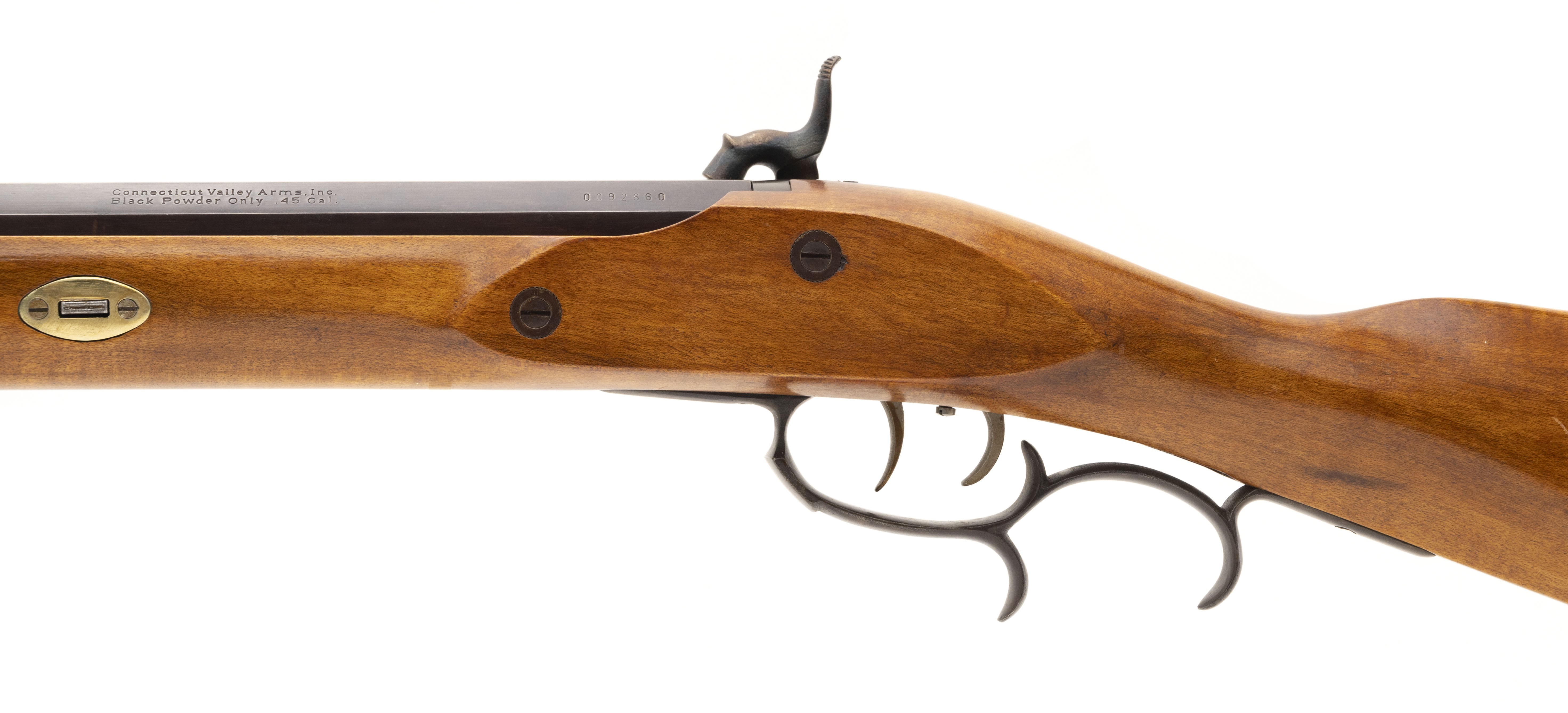 Replica black powder .45 caliber percussion rifle. Has a 32" barrel and brass patchbox. Very good condition.