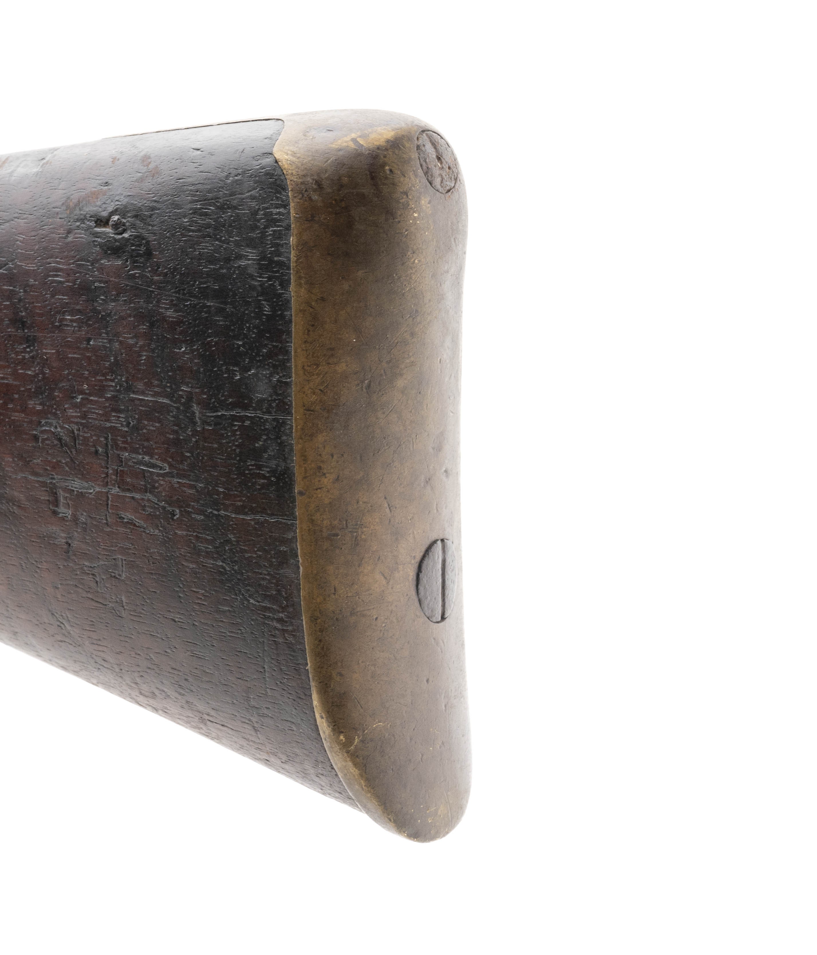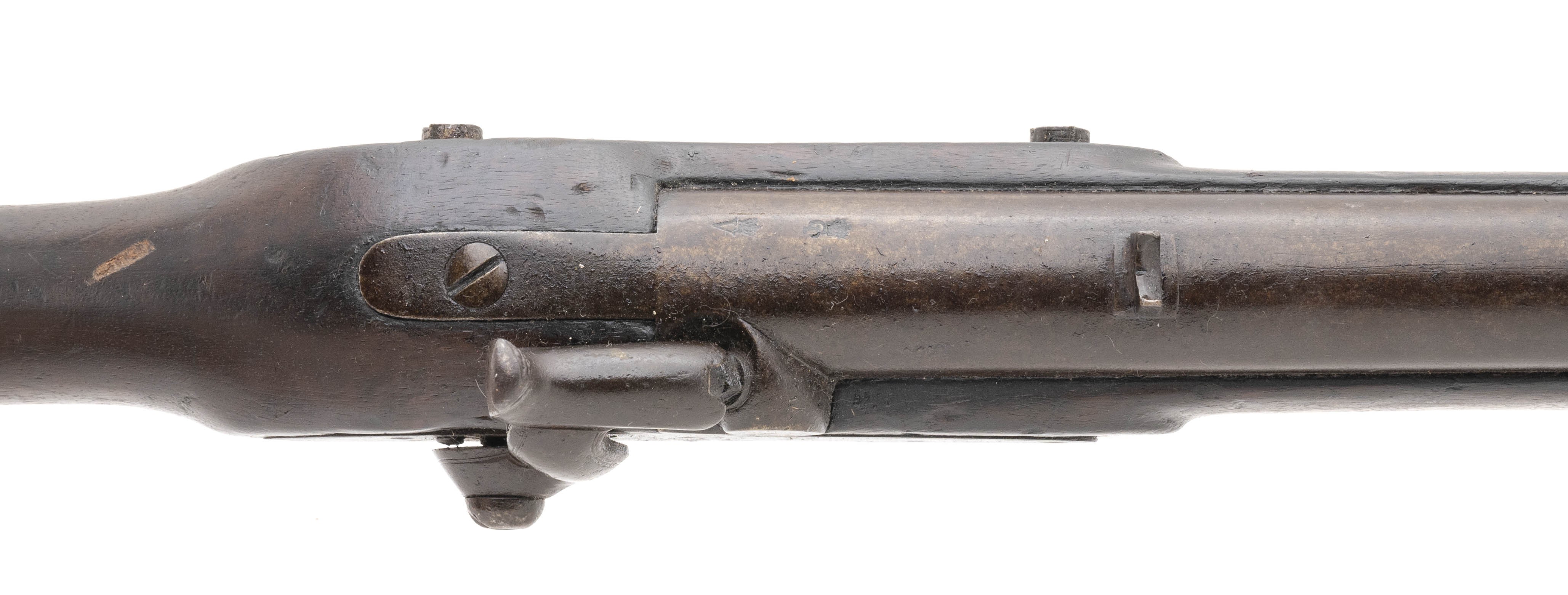 This East India Company (EIC) Pattern 1842 percussion musket has the EIC lion on the lock and London proofs on the barrel. The 39" 75 caliber smooth bore barrel hs a good bore with light roughness. All metal parts exhibit a smooth brown patina. The brass buttplatee, nosecap, and trigger guard have a pleasing aged patina. The buttplate tang and trigger guard are stamped with Hindu characters. The stock is very good with scattered handling marks and dings and no chips or cracks. The swivels, ramrod, and Lovell bayonet catch are present. The action functions correctly. These Pattern 1842 muskets are rarely seen. Don't miss this one!