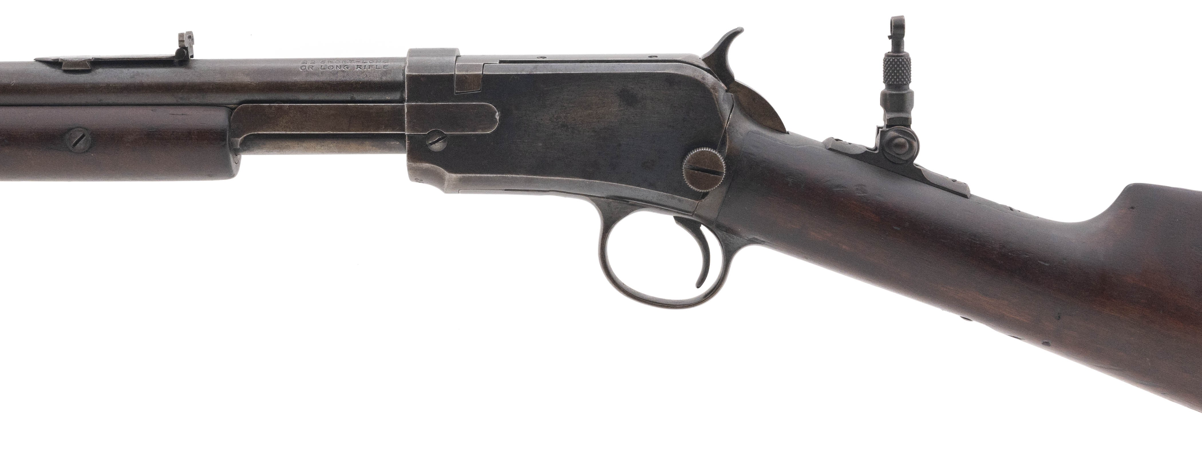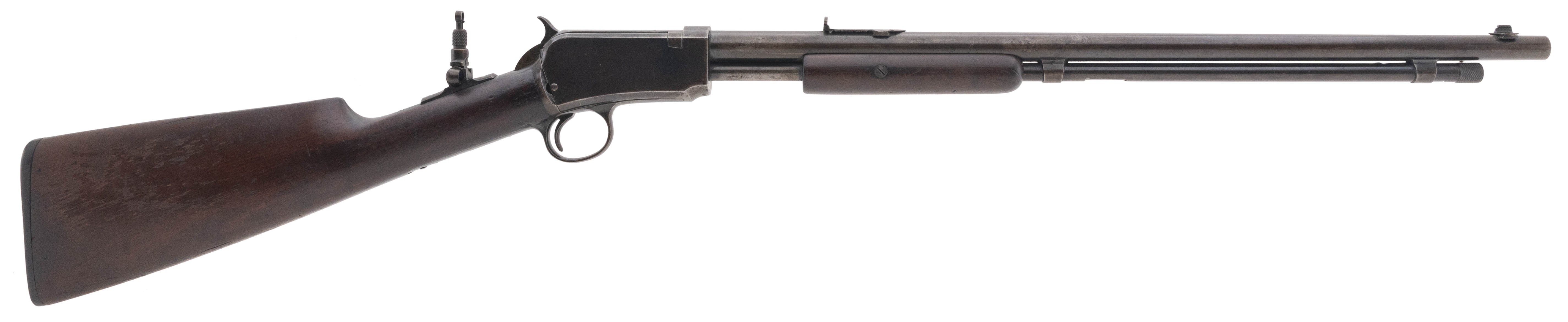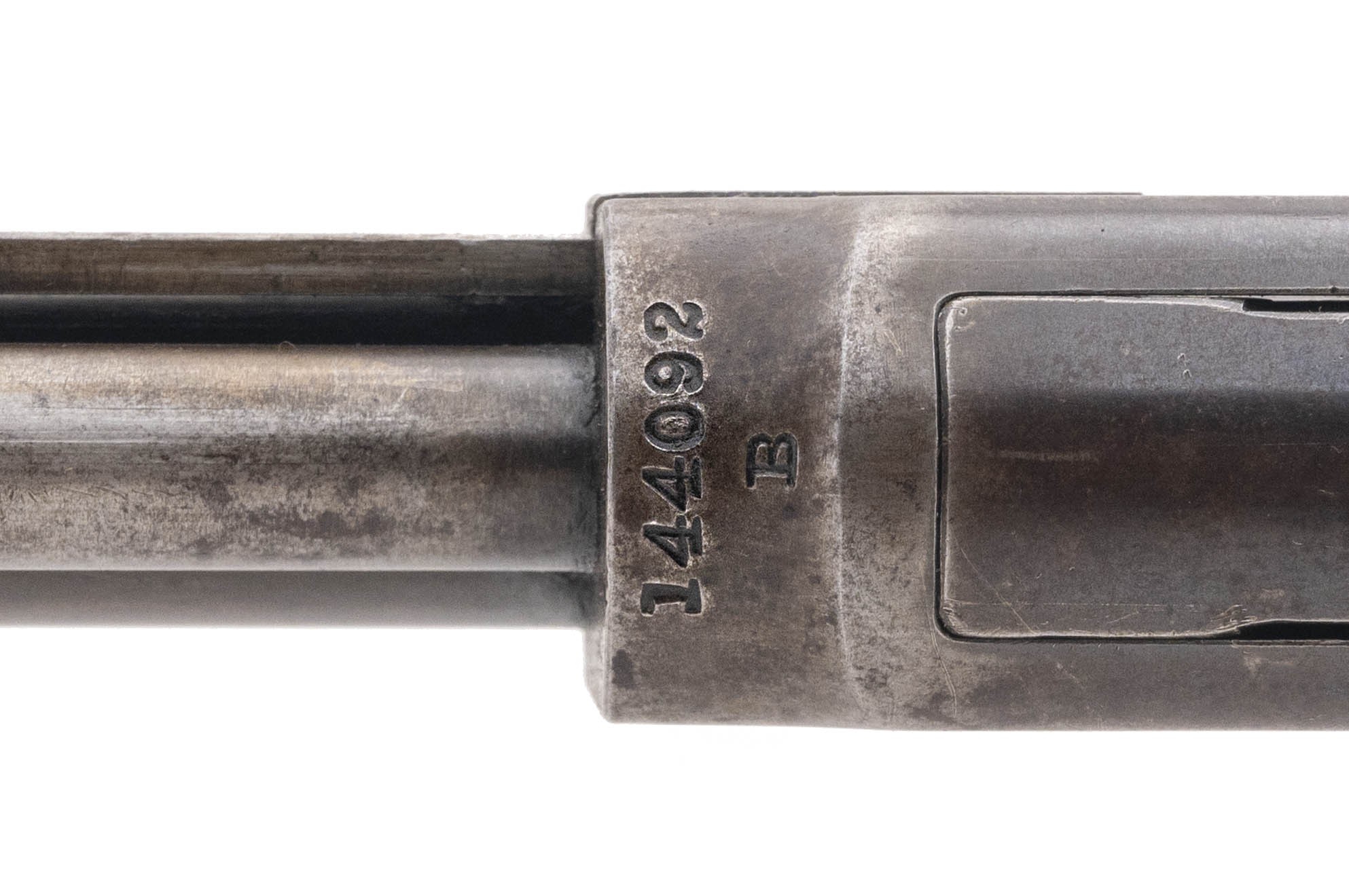 SN: 144092. Pump action carbine with 20" barrel, made in 1909. The bore is excellent. The metal has a brown patina and the stock is good with typical wear. A tang peep sight has been added.