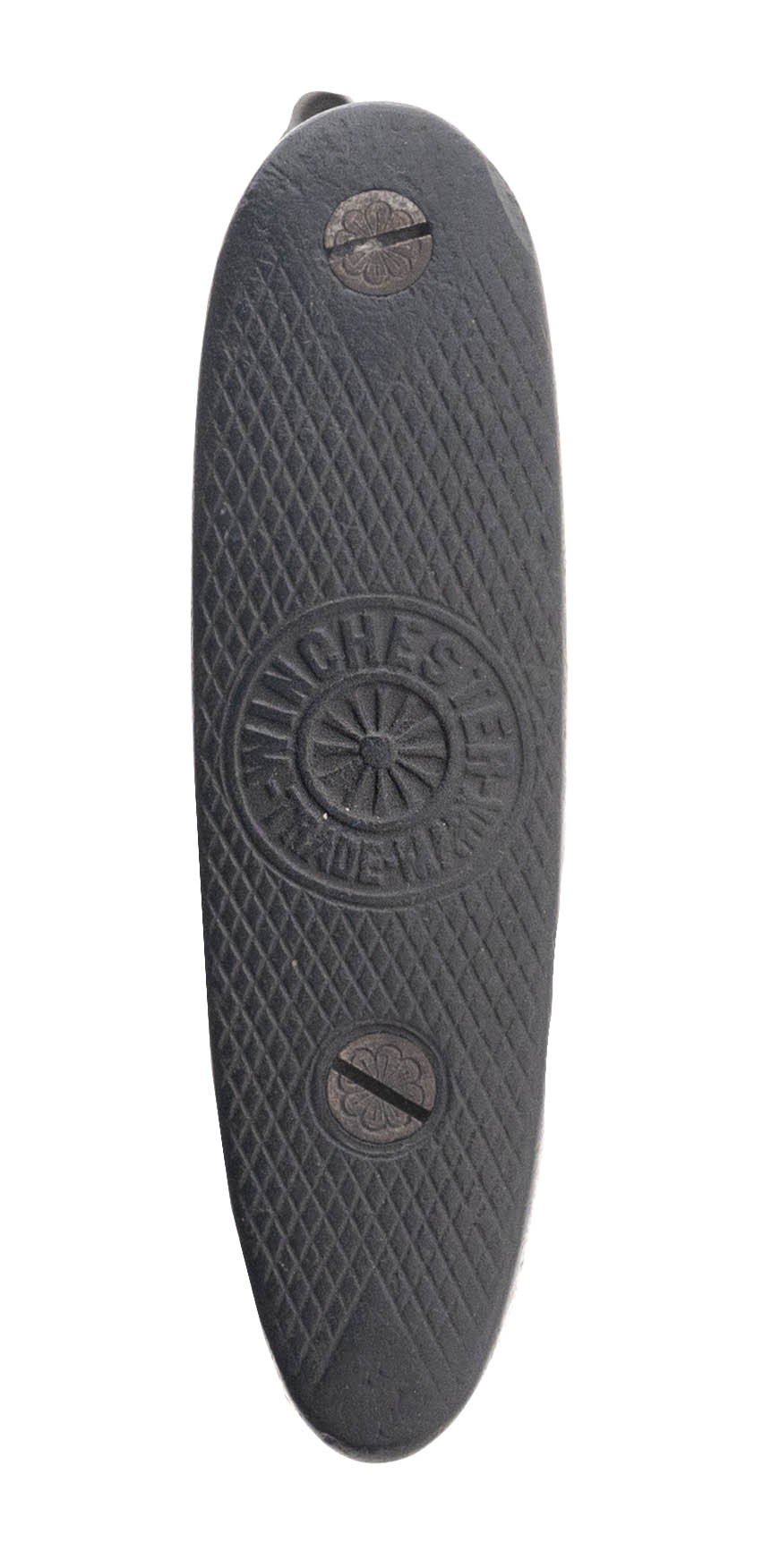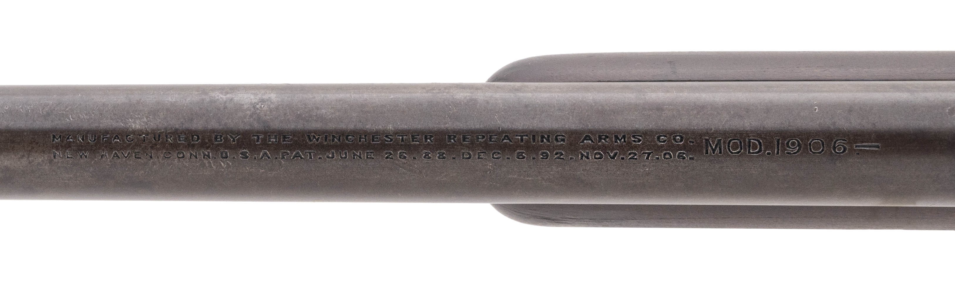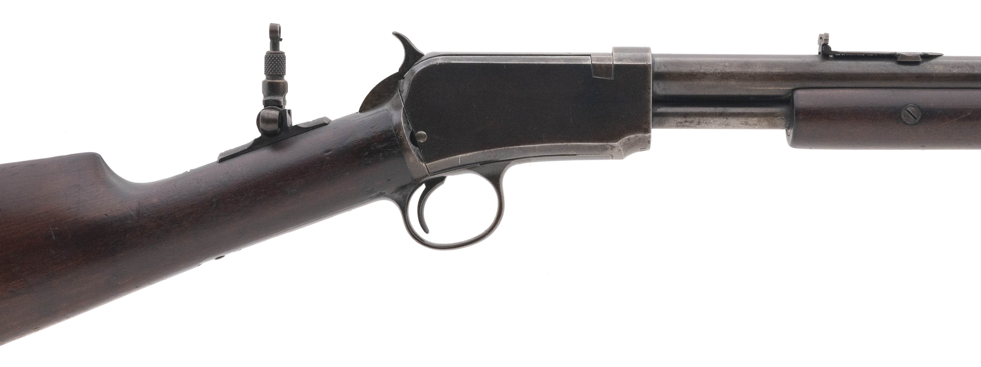 SN: 144092. Pump action carbine with 20" barrel, made in 1909. The bore is excellent. The metal has a brown patina and the stock is good with typical wear. A tang peep sight has been added.