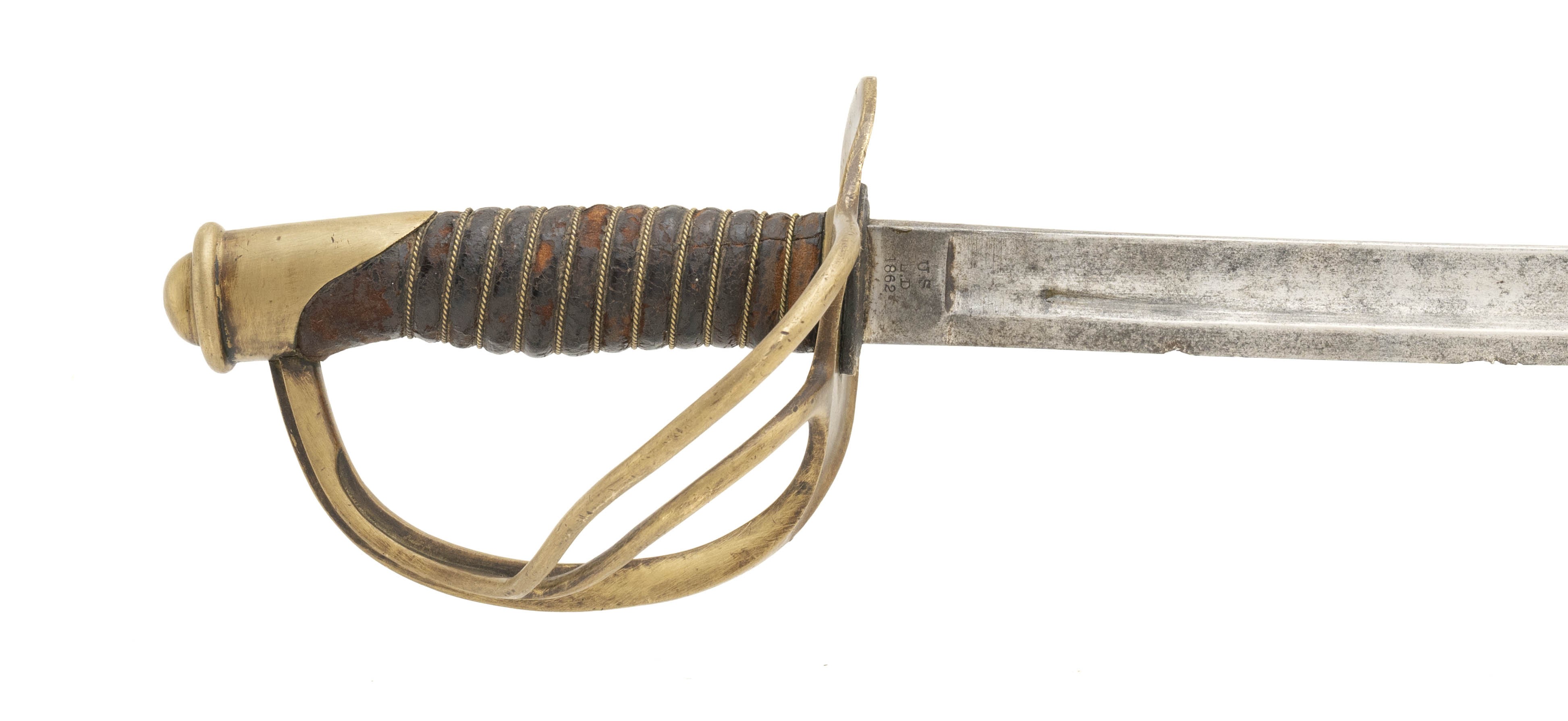 U.S. Model 1860 cavalry saber by Mansfield & Lamb, overall good condition with a grey patina finish on scabbard and blade. Blade is dated 1862 with numerous gouges along the edge. Wire wrap and leather are fair