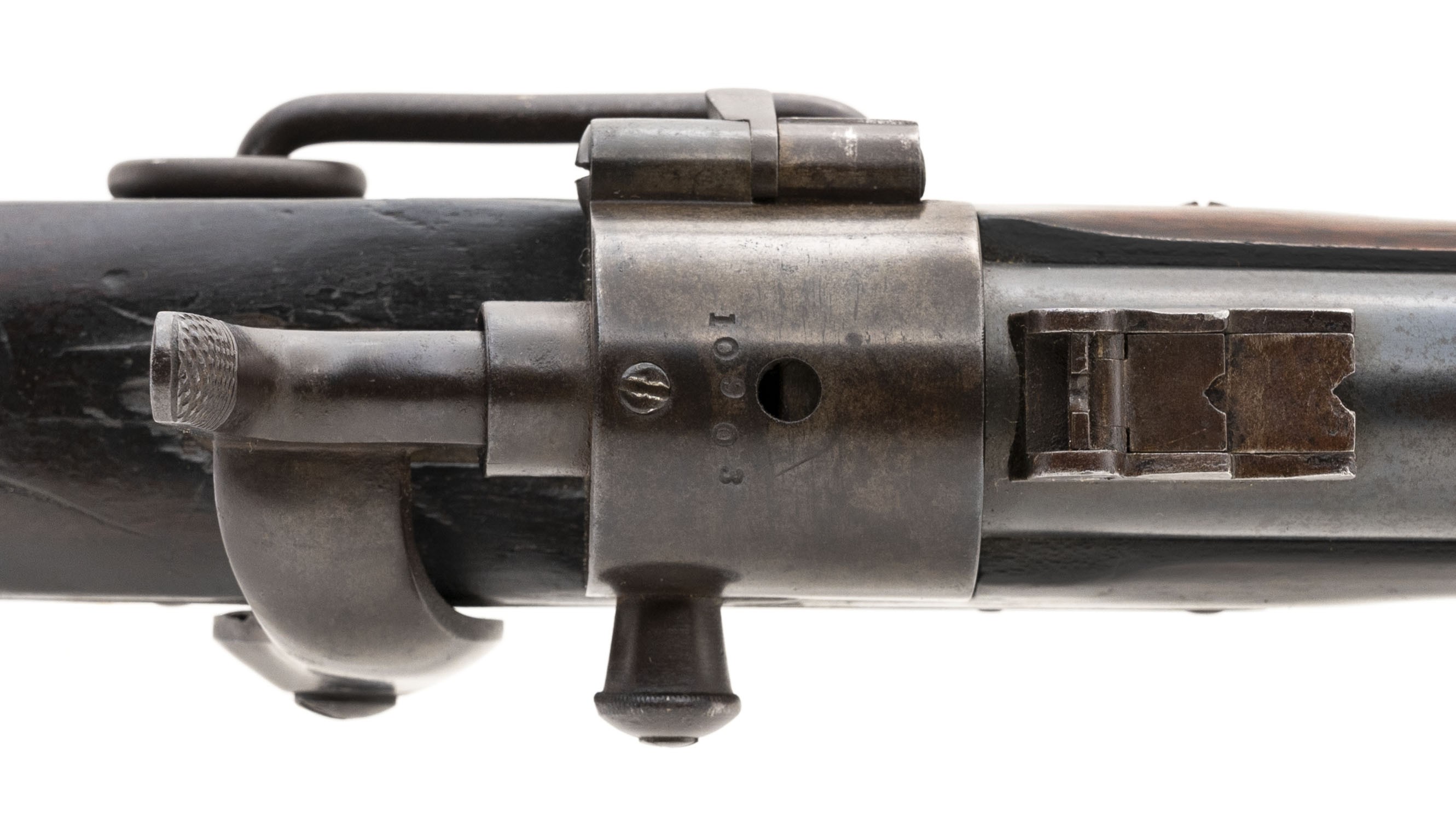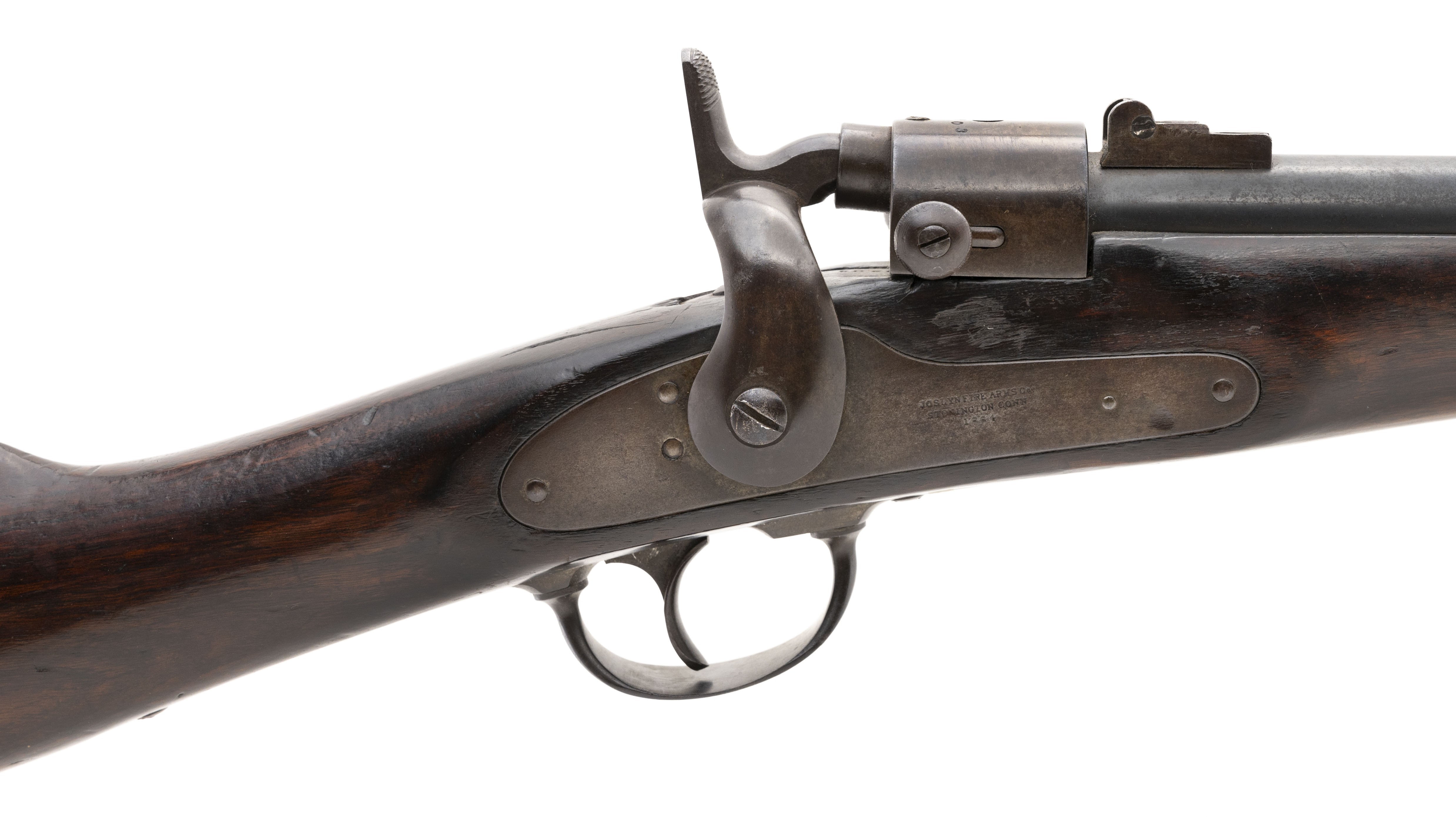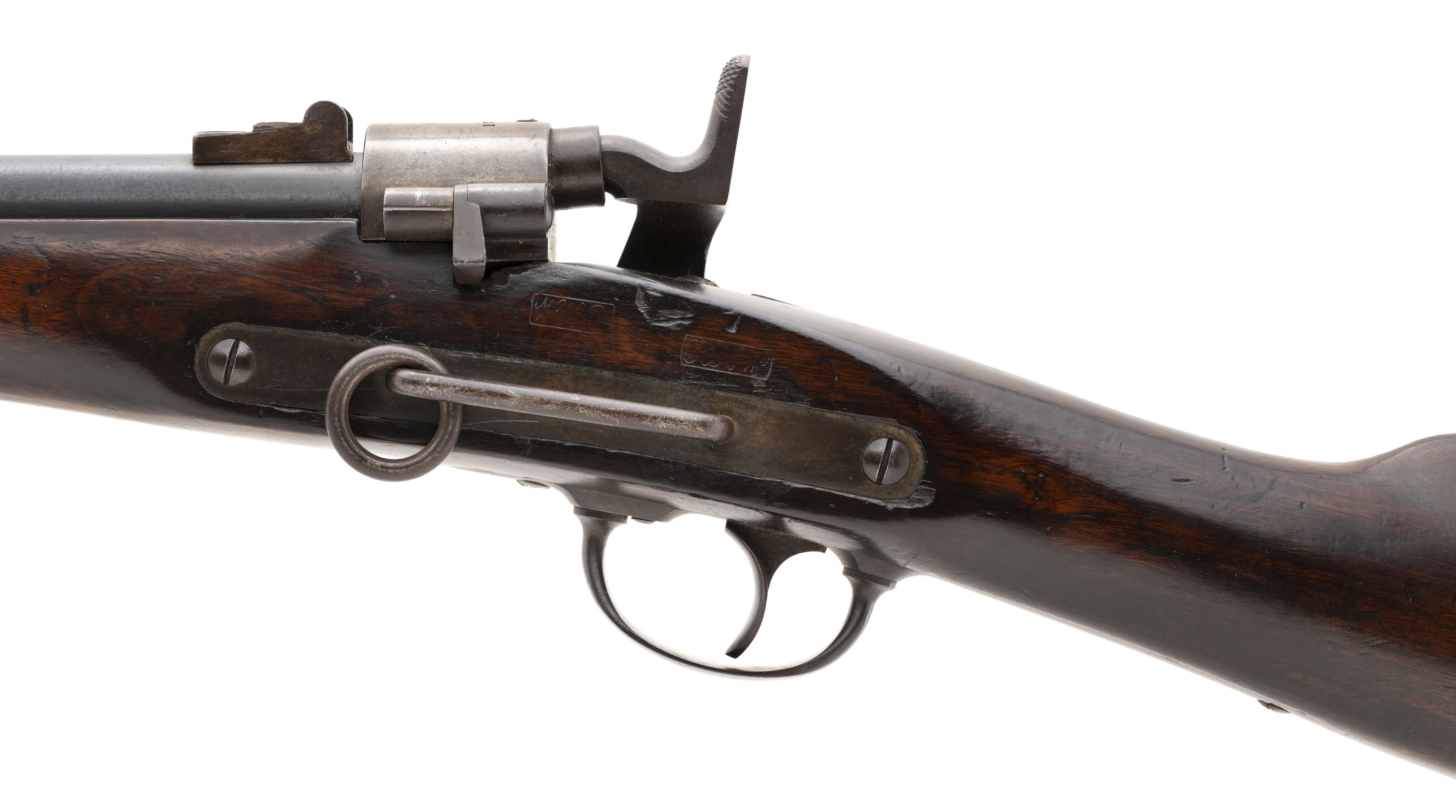 Serial number 10903 .52 caliber with a 22" barrel manufactured in 1864 Joslyn Saddle ring carbine in very good overall condition. Finish is a smooth dark grey patina, bore has light scattered pitting in the grooves. Wood shows handling and usage wear present, very attractive carbine!