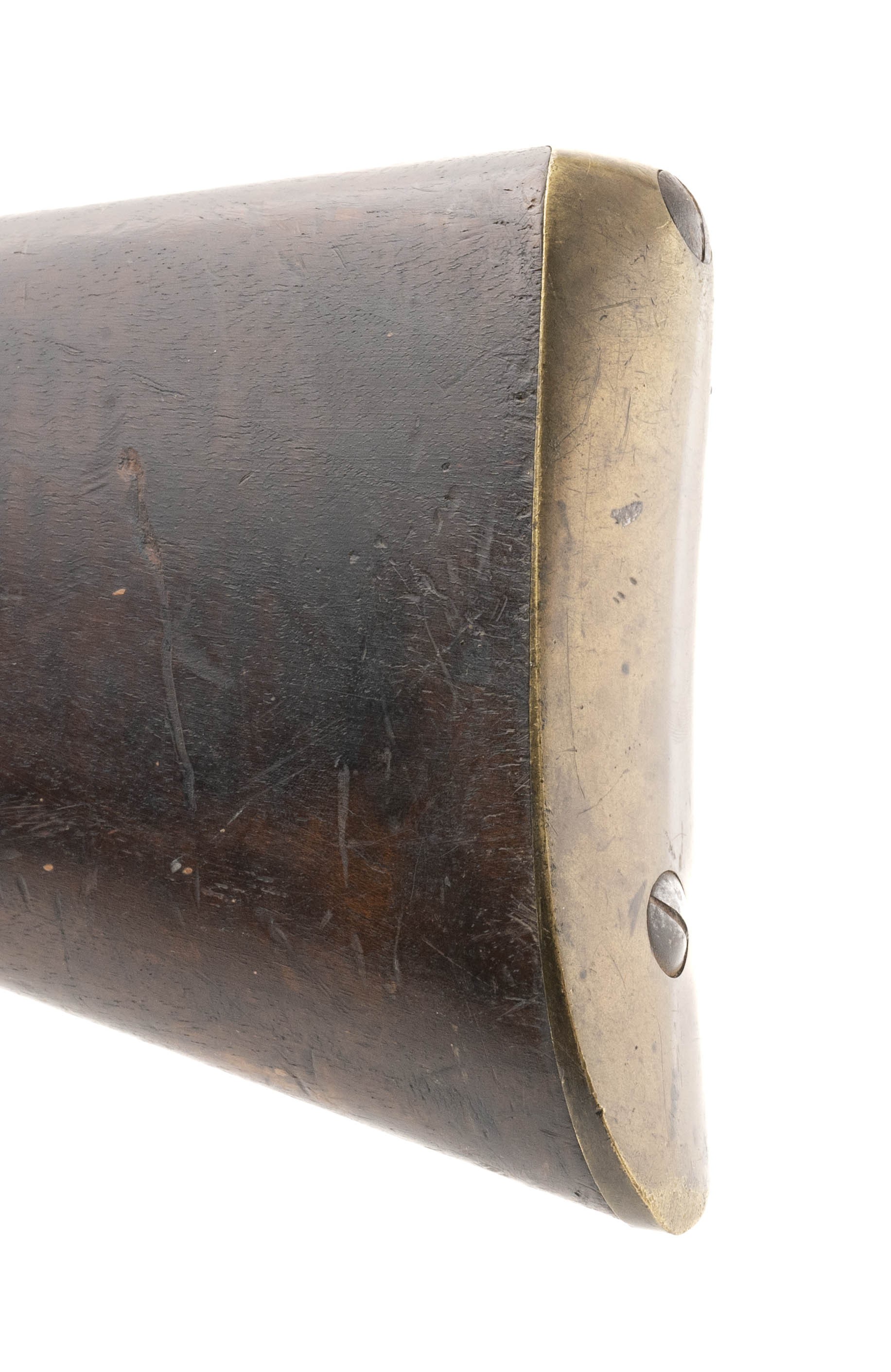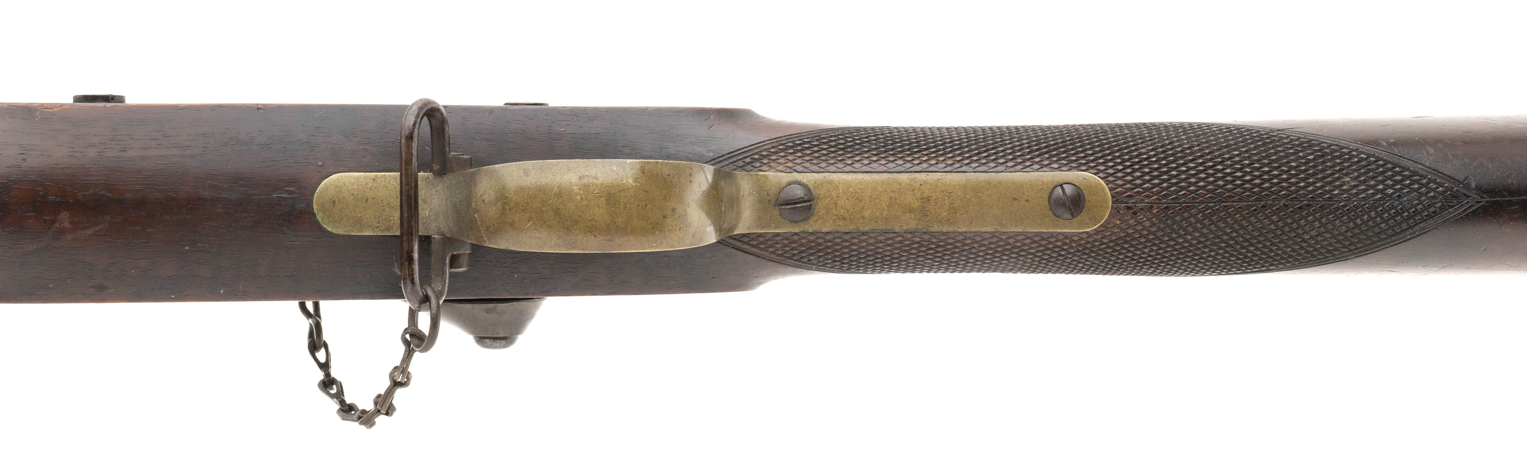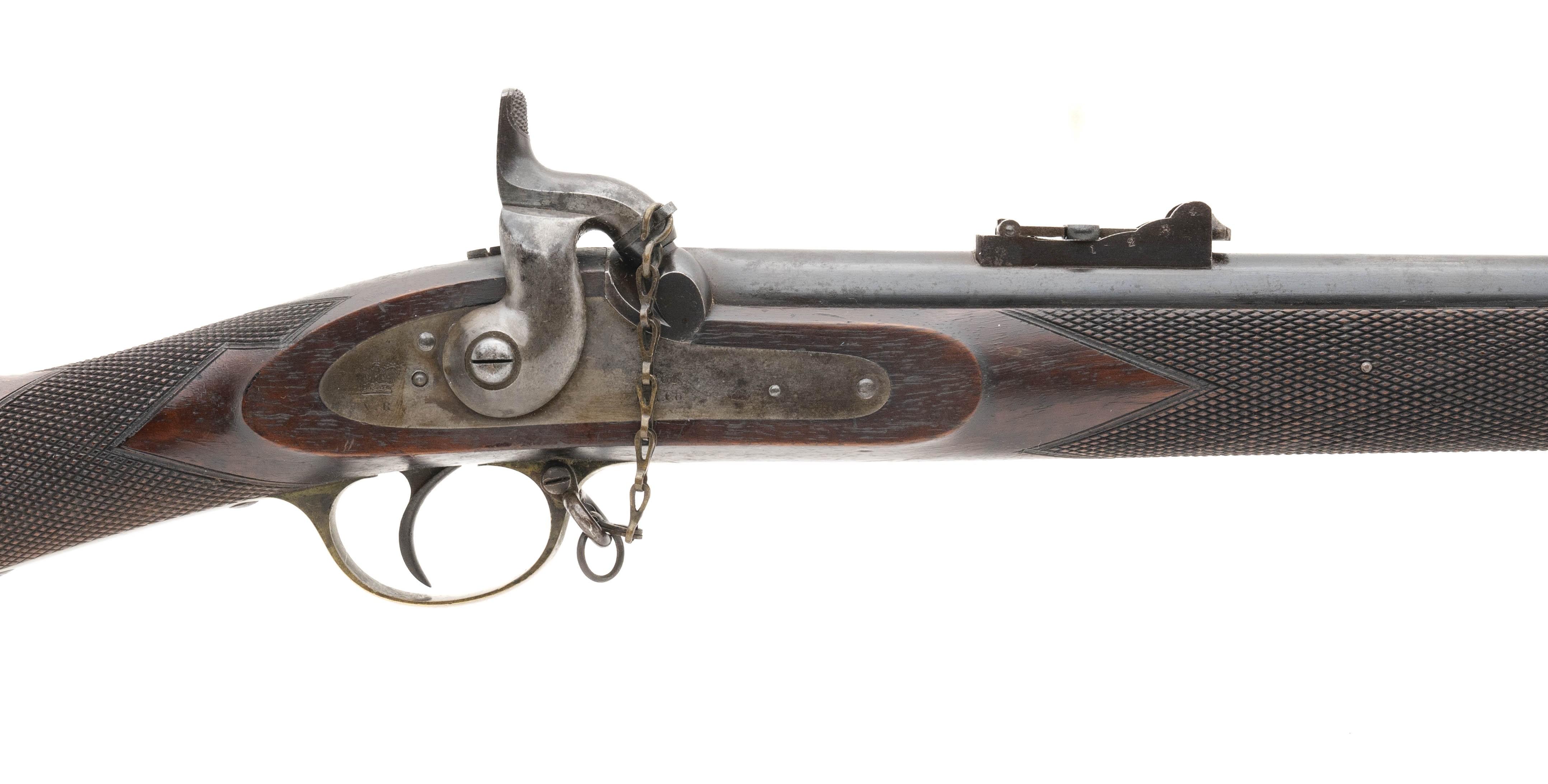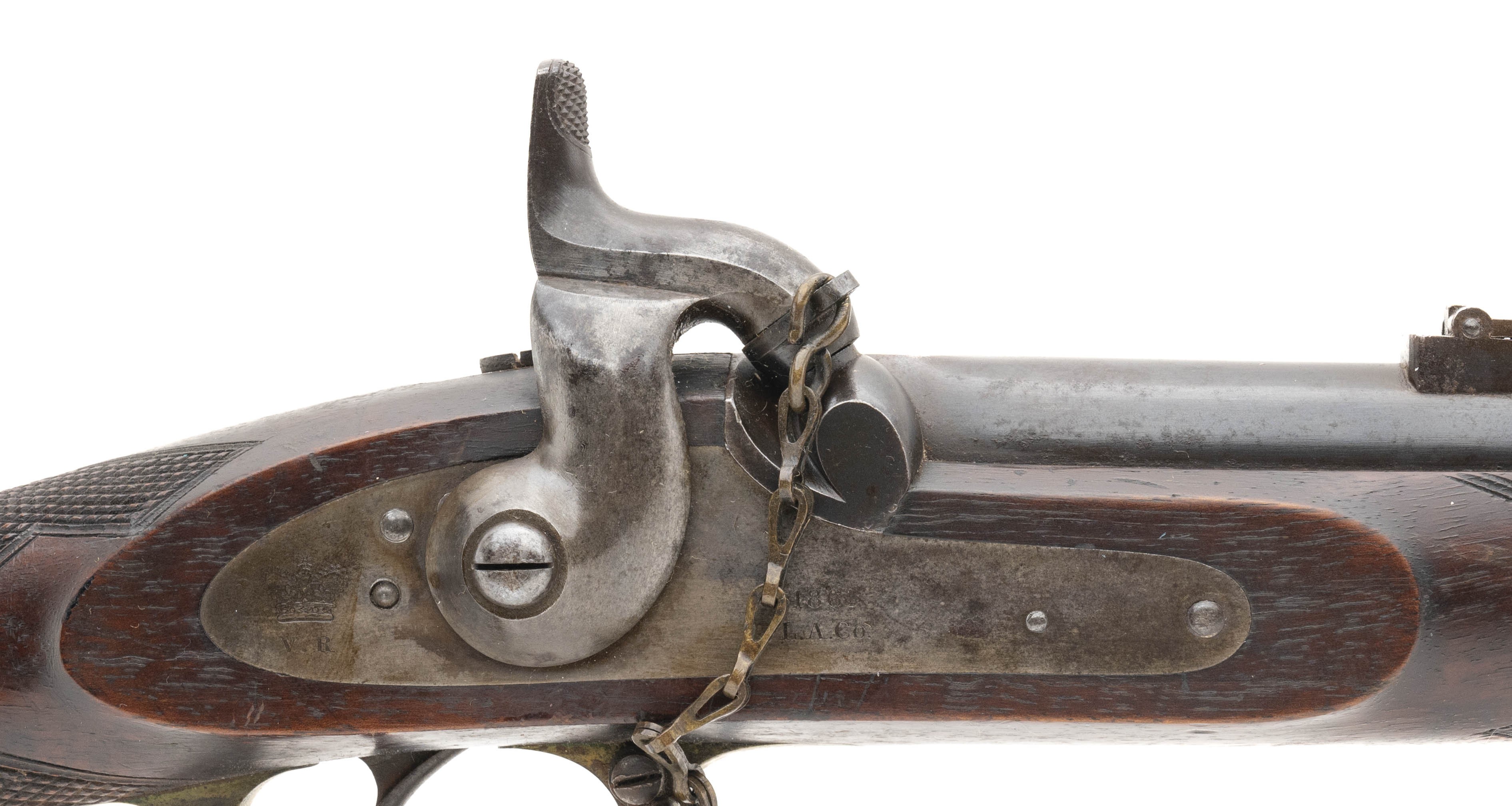 This .577 caliber percussion Pattern 1853 Volunteer Rifle (also known as the Sergeant's rifle) was made by he London Armory Company in 1861/2. The London Armory Company and the British Enfield factory were the only manufacturers of the Pattern 1853 in which the parts were interchangeable. The approx. 37.5" barrel has an excellent bore with bright, strong rifling. The barrel has approx. 90% of its original blue finish. The barrel has a London proof mark and two LAC stamps. The lock is marked crown over V.R at the tail and 1861 over L.A.Co. at the center. The lock and hammer correctly have no edge lines. The walnut stock has sharp edges, very light wear, strong checkering at the wrist and forearm, and is marked in a circle LONDON ARMORY/1862/BERMONDSEY on the right butt. The brass buttplate, trigger guard, and nosecap have an even aged patina. The nipple protector and chain, swivels, and ramrod are present.The action functions correctly. These rifles are noted for their superior finish and stock. Jefferson Davis is known to have owned a similar volunteer rifle. Here's your chance to own a very fine example.