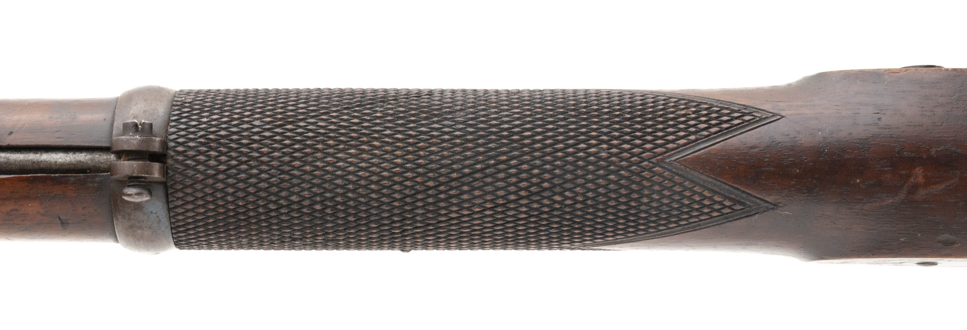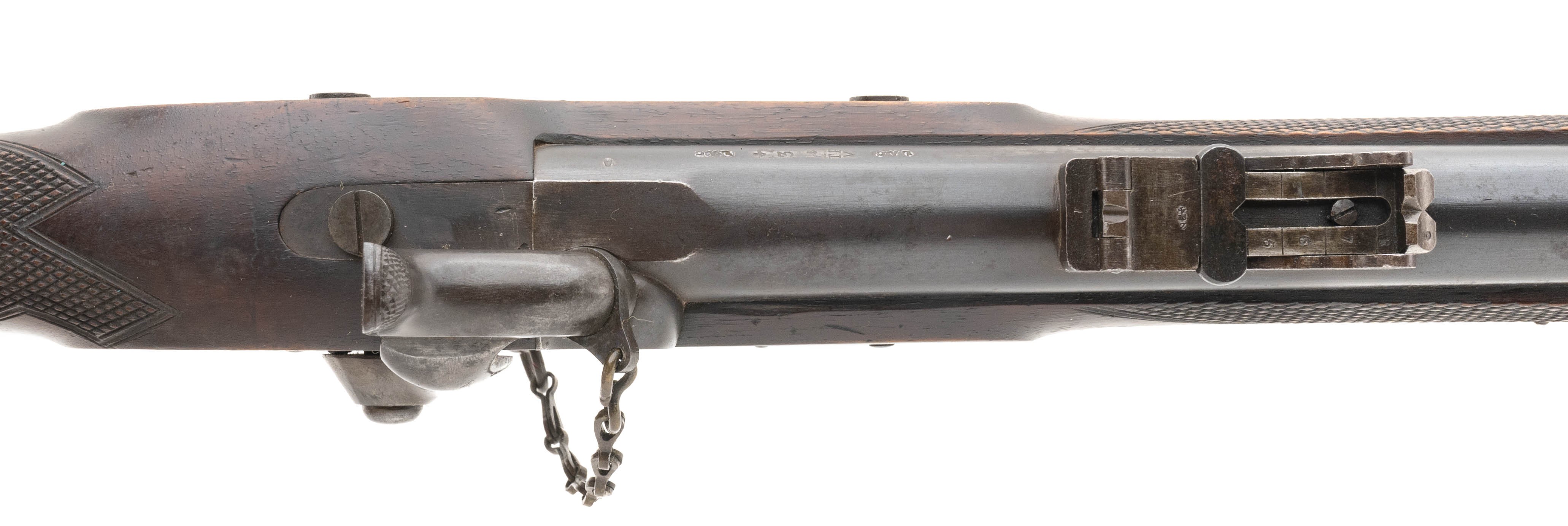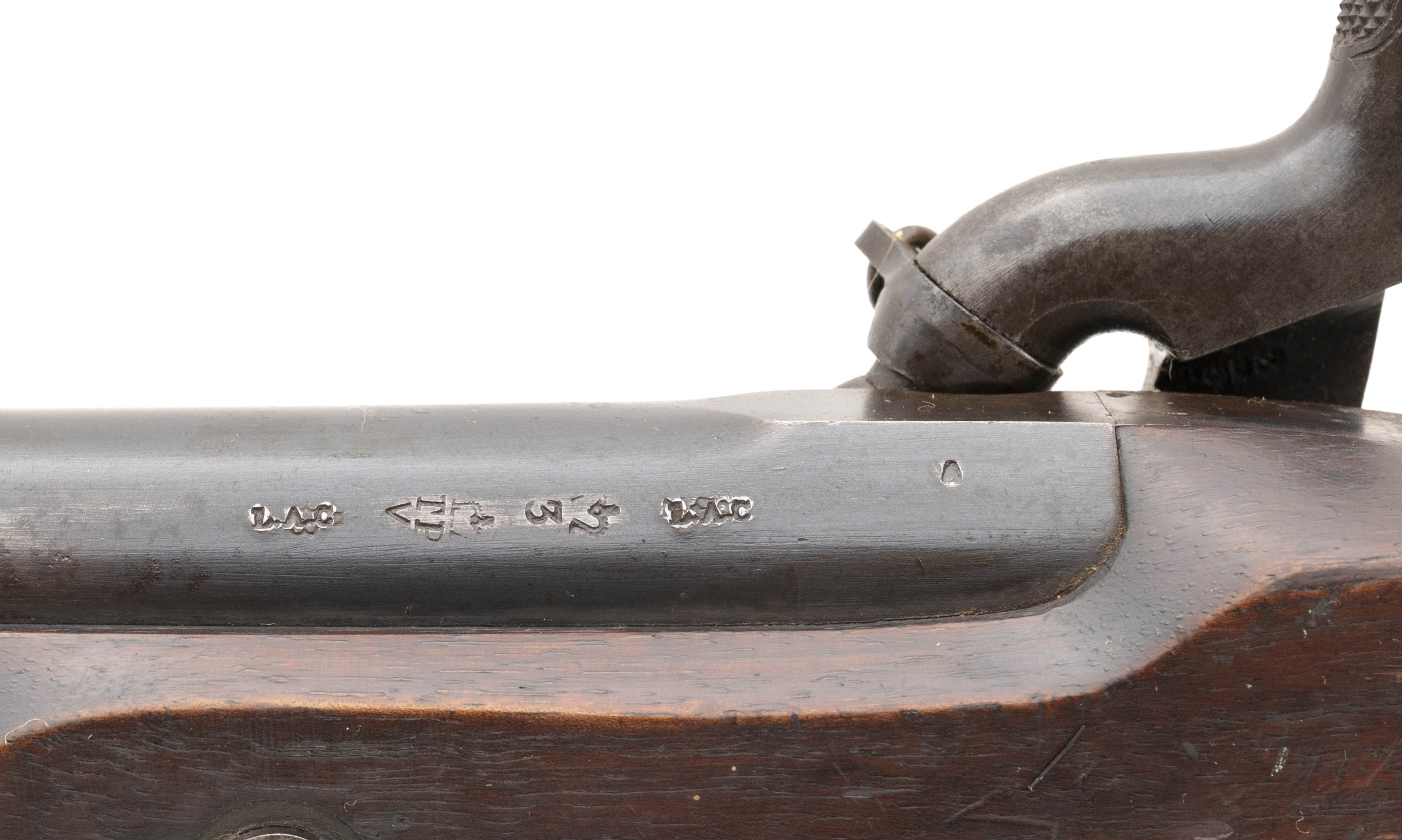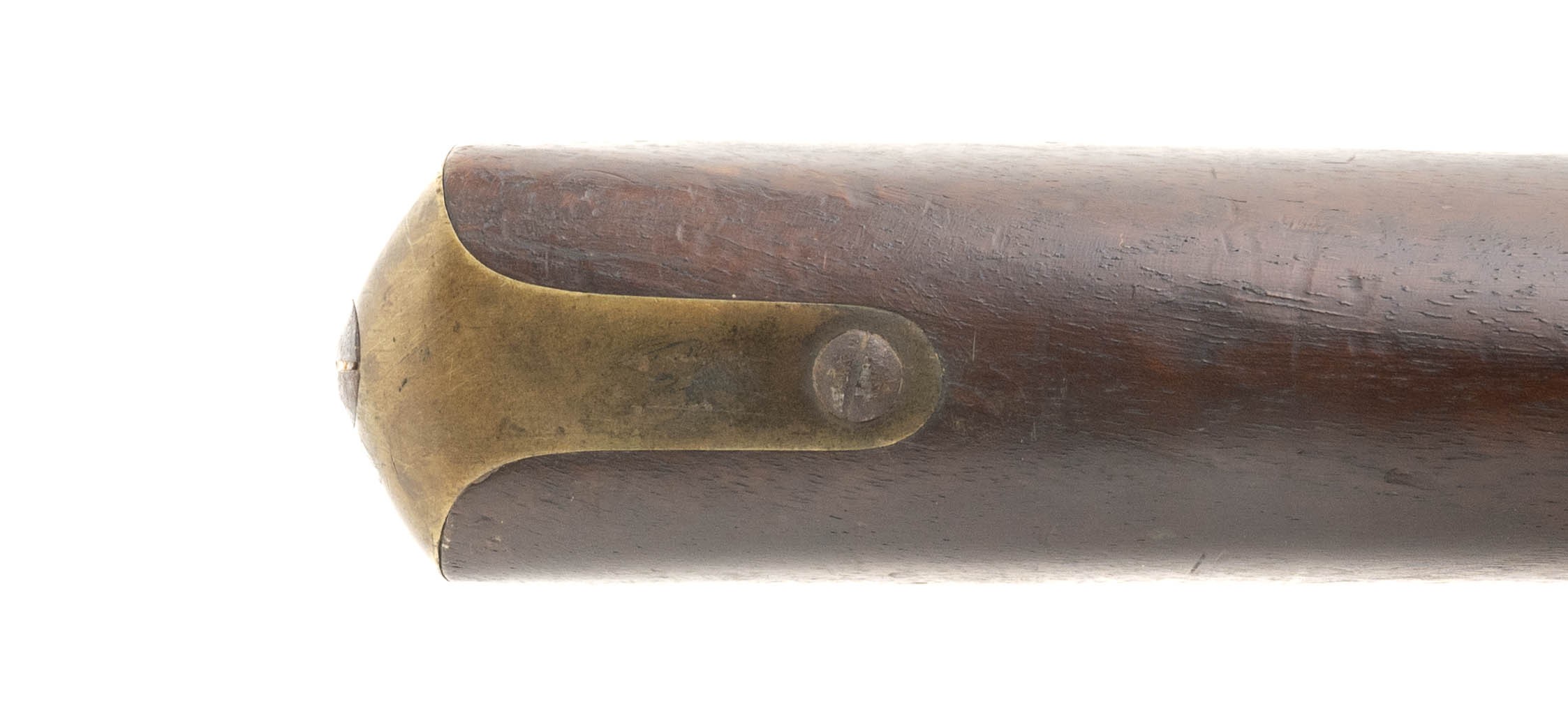 This .577 caliber percussion Pattern 1853 Volunteer Rifle (also known as the Sergeant's rifle) was made by he London Armory Company in 1861/2. The London Armory Company and the British Enfield factory were the only manufacturers of the Pattern 1853 in which the parts were interchangeable. The approx. 37.5" barrel has an excellent bore with bright, strong rifling. The barrel has approx. 90% of its original blue finish. The barrel has a London proof mark and two LAC stamps. The lock is marked crown over V.R at the tail and 1861 over L.A.Co. at the center. The lock and hammer correctly have no edge lines. The walnut stock has sharp edges, very light wear, strong checkering at the wrist and forearm, and is marked in a circle LONDON ARMORY/1862/BERMONDSEY on the right butt. The brass buttplate, trigger guard, and nosecap have an even aged patina. The nipple protector and chain, swivels, and ramrod are present.The action functions correctly. These rifles are noted for their superior finish and stock. Jefferson Davis is known to have owned a similar volunteer rifle. Here's your chance to own a very fine example.