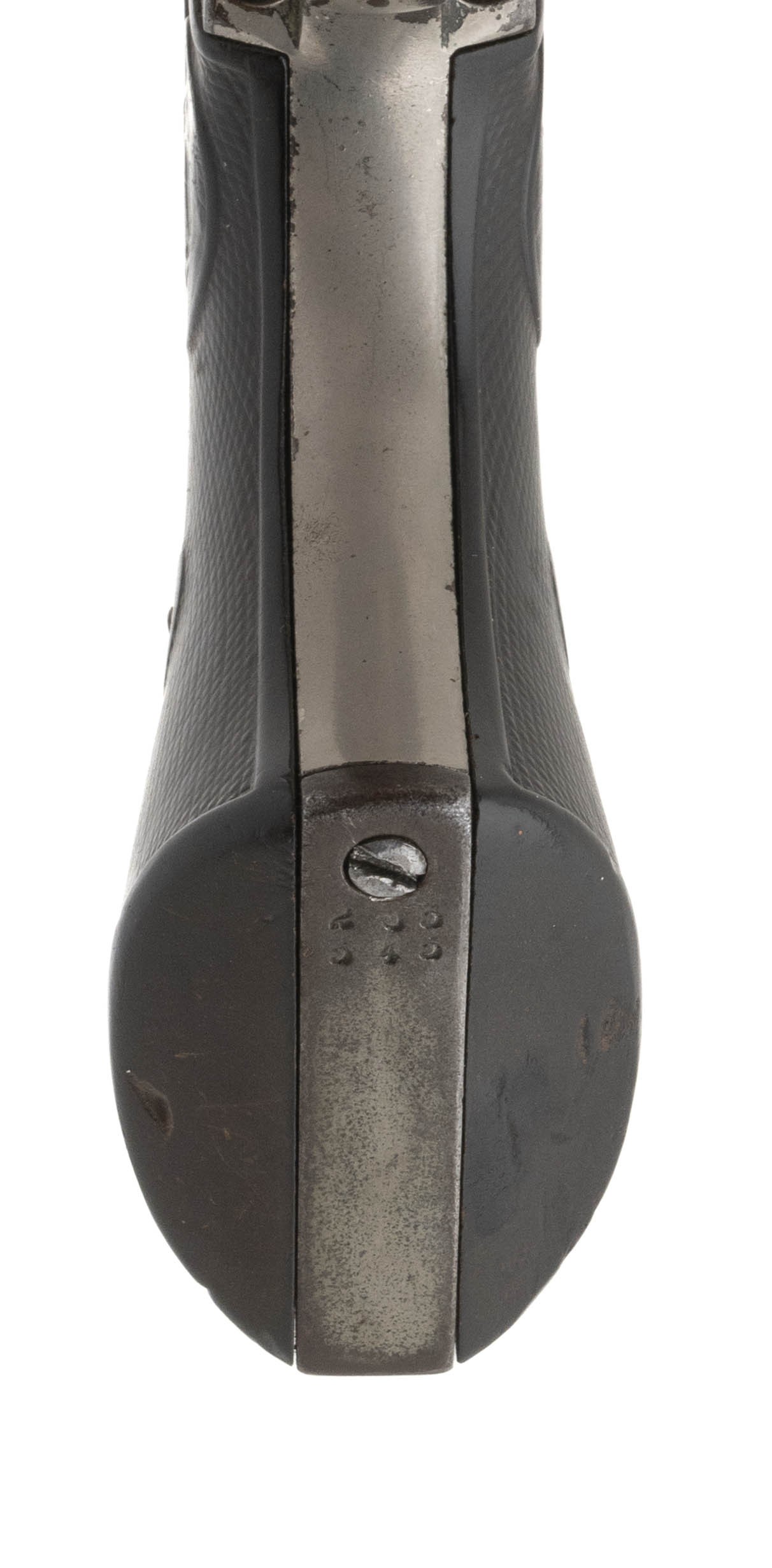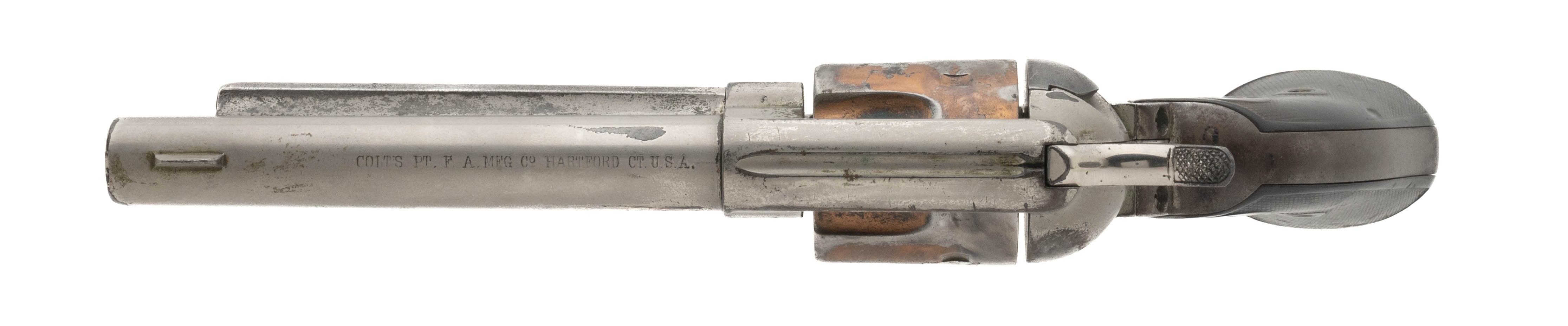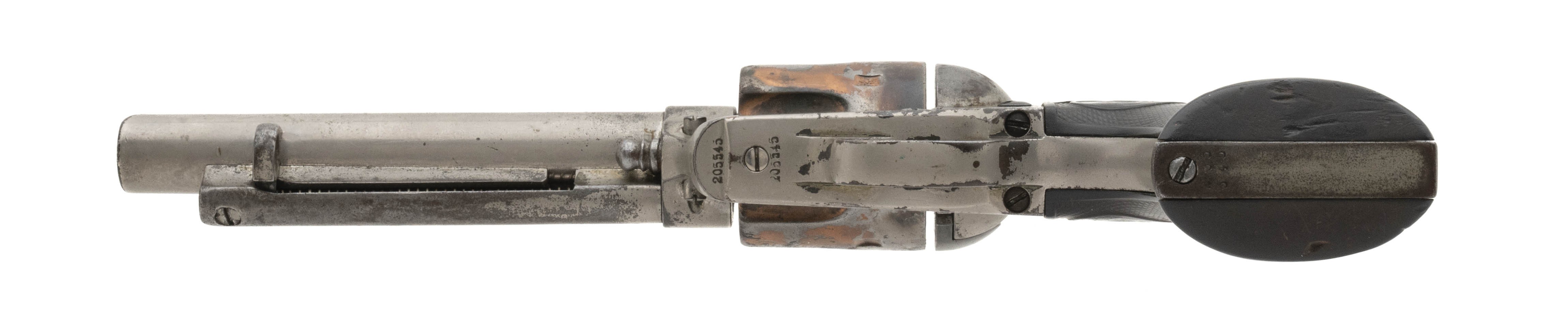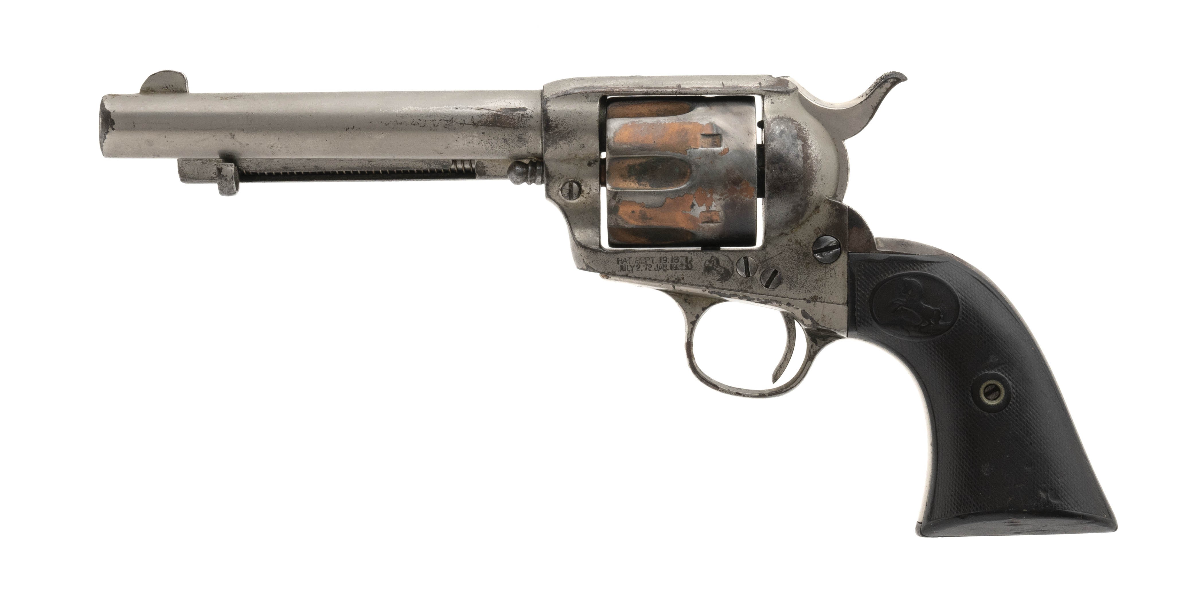 Serial number 205545. Made in 1901. 45LC caliber with a 5 ½” barrel. This gun has been refinished long ago. The cylinder was obviously copper plated before being nickel which made the nickel adhere better and is now showing through in places. Grips show appropriate wear.