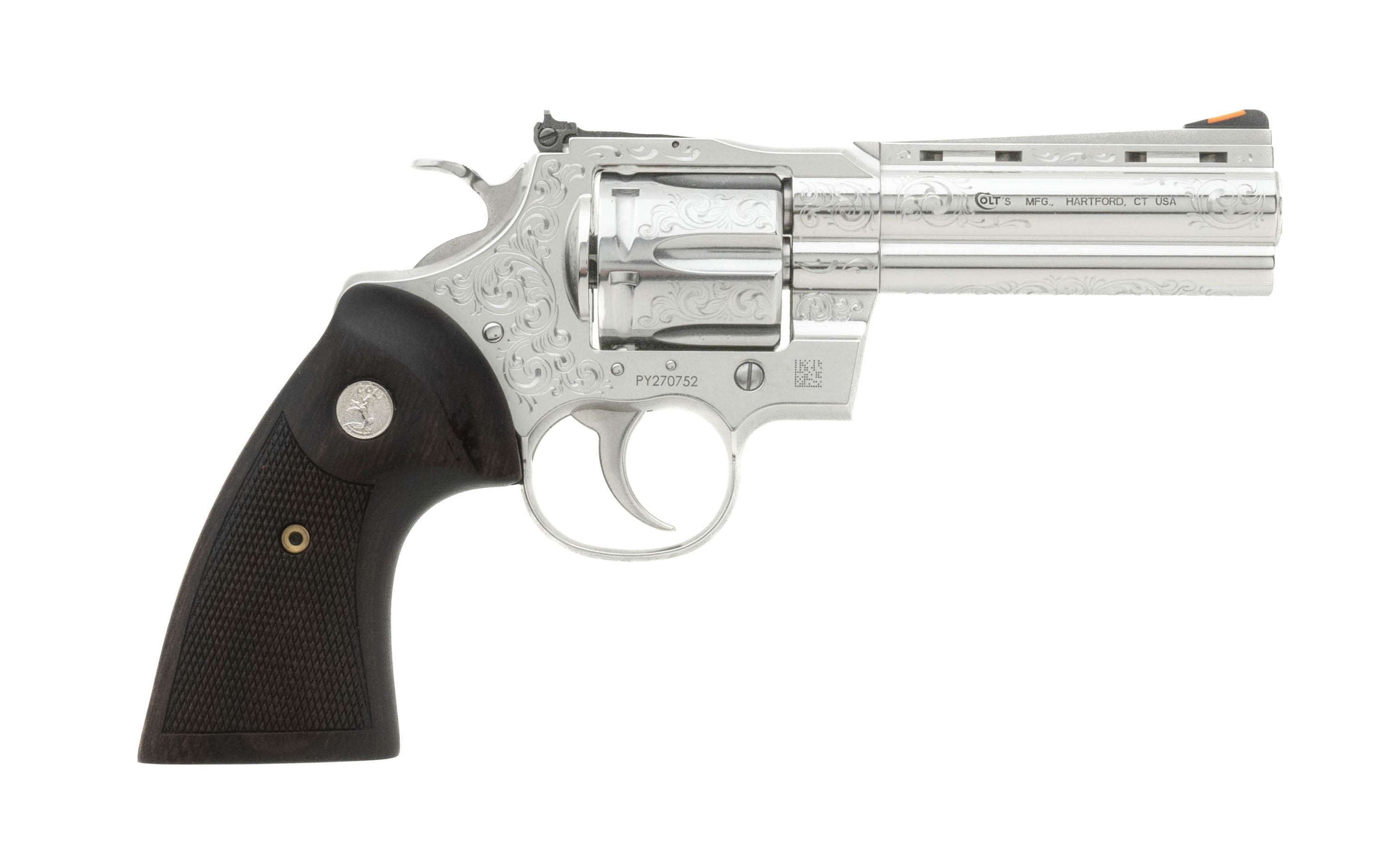 Modern stainless 4.25" barrel Python with "C+" Coverage Armory cut engraved model. Custom Shop Model D. NEW. UPC:098289003287