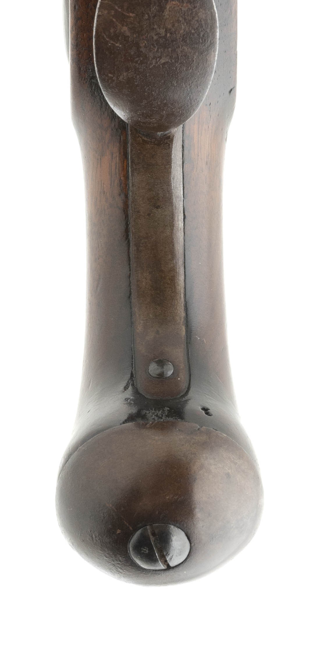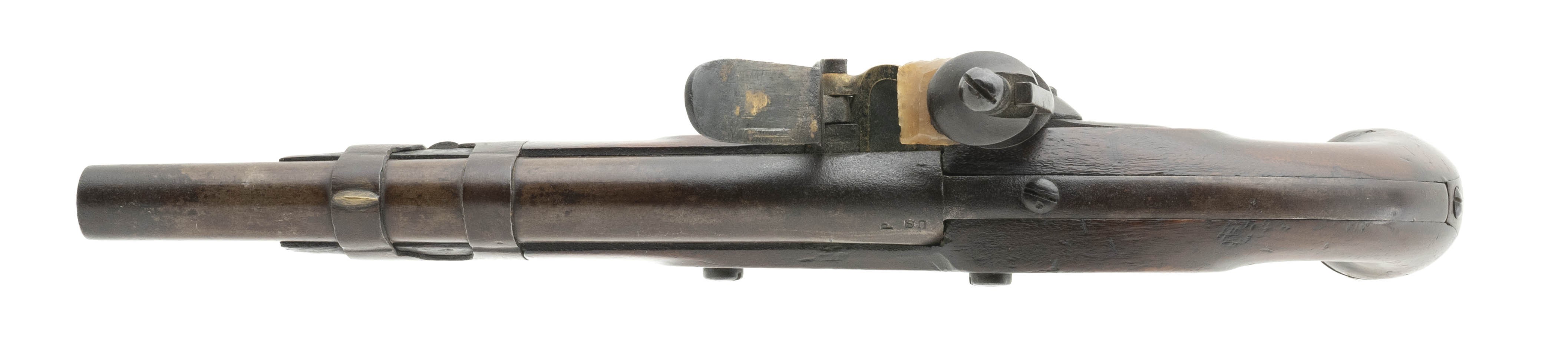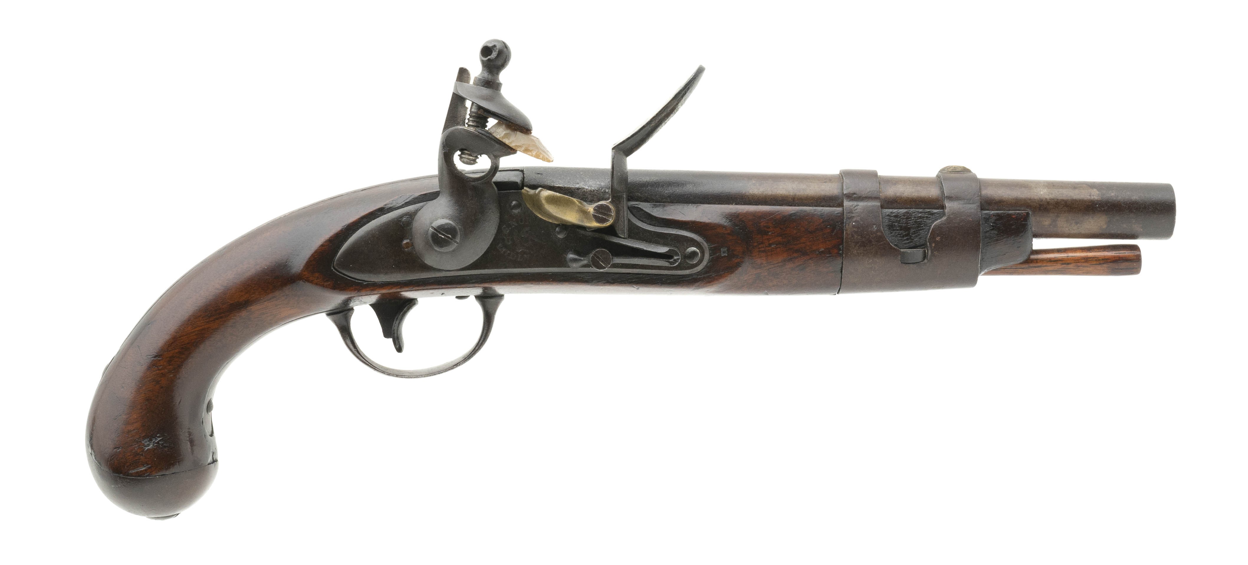 NSN, .54 caliber with a 9" round proofed smoothbore barrel circa 1817 flintlock pistol. Metal is a dark brown patina with minor surface oxidation present. Lock is of the early style, wood is very good with handsome cartouches noted. Action functions correctly and is in original flintlock configuration. Hickory ramrod is original.