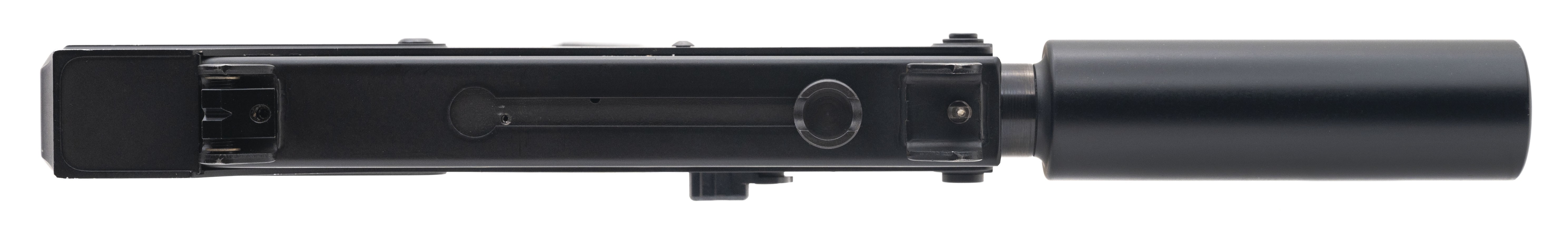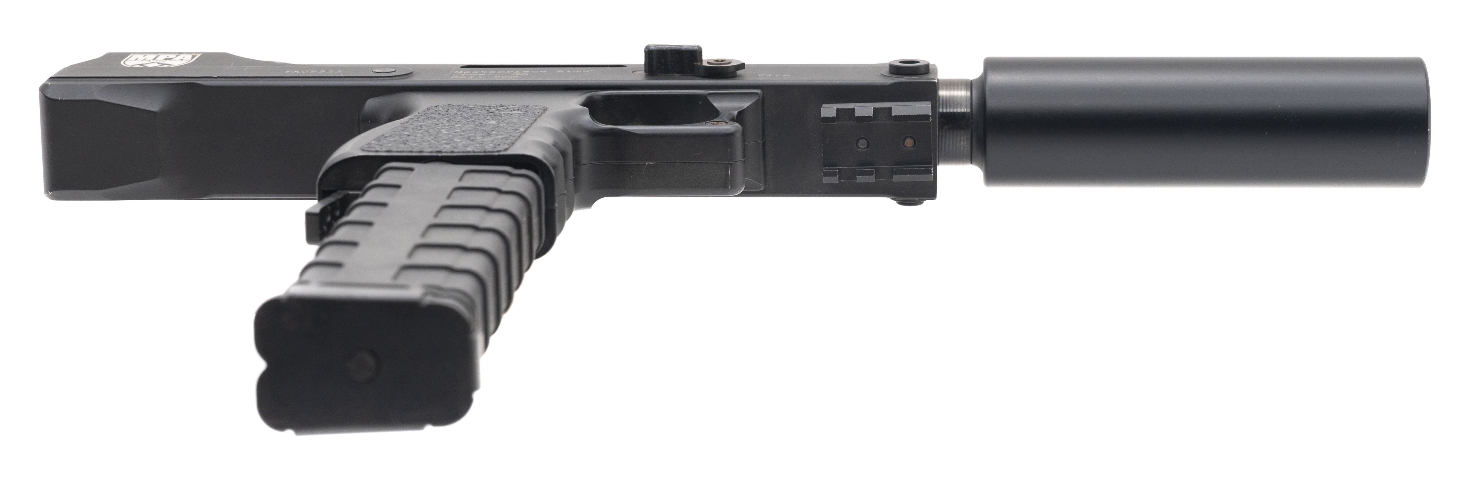 SN:FX09522. Semi-automatic metal tactical pistol with an installed faux suppressor, paddle magazine release, & adjustable sights. In excellent condition.