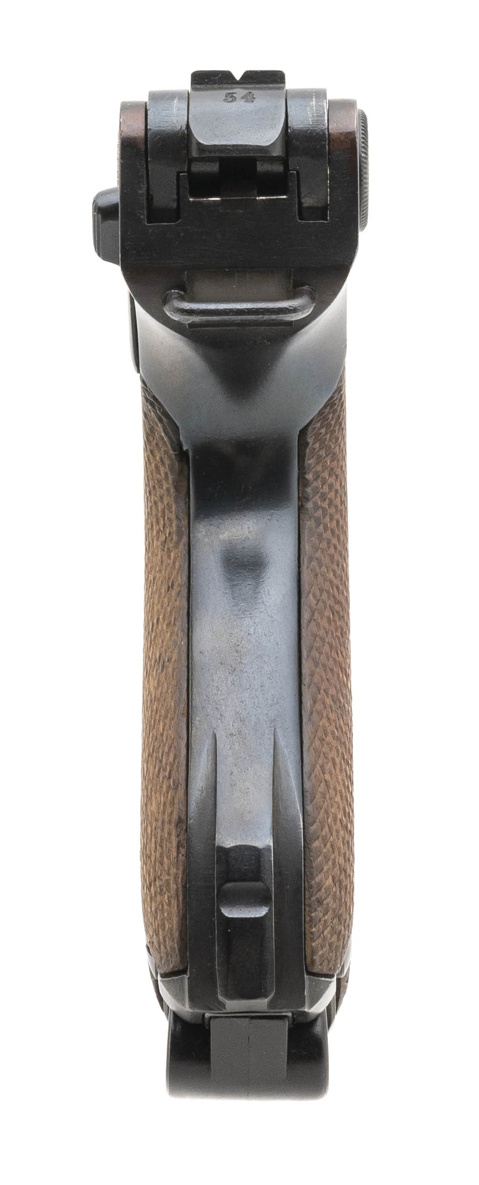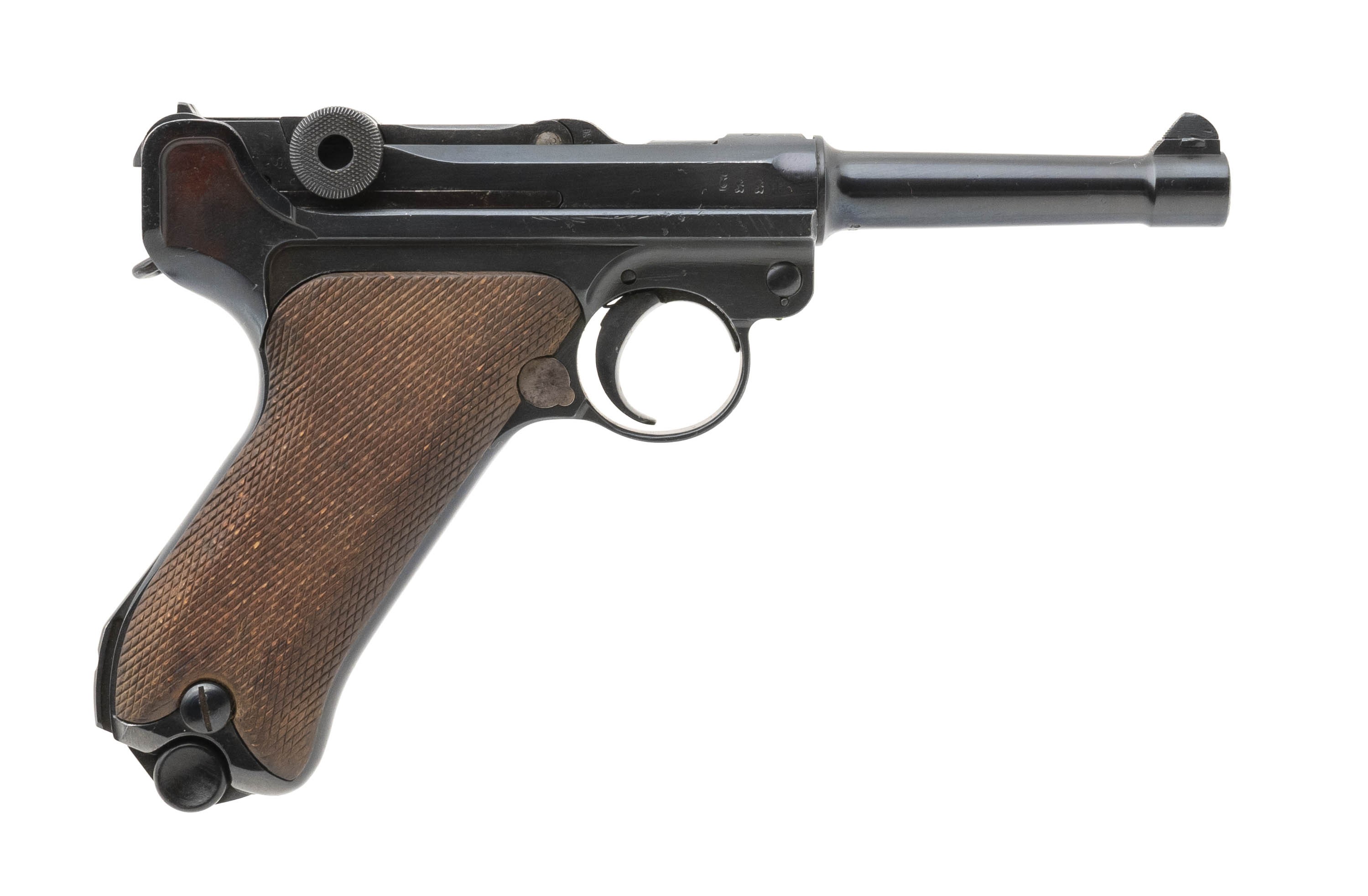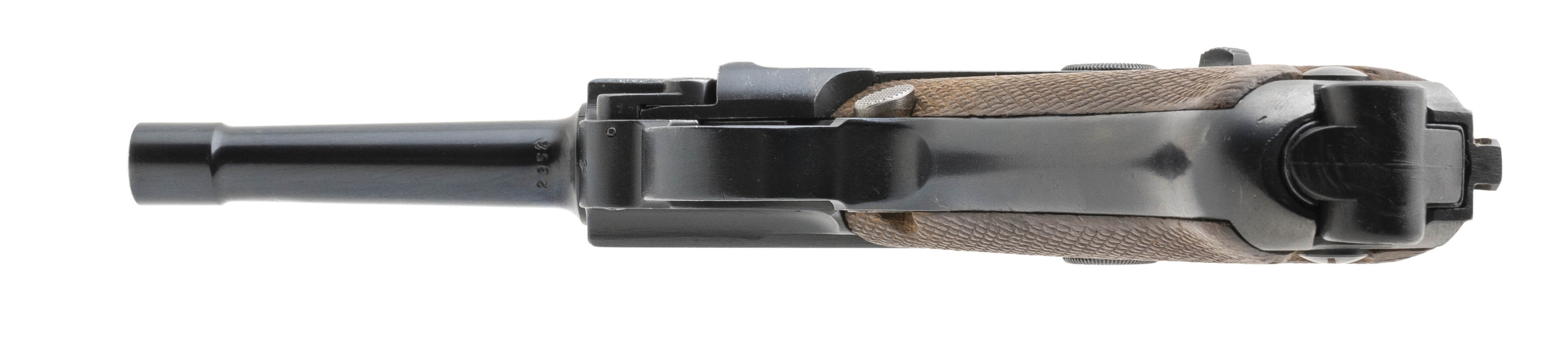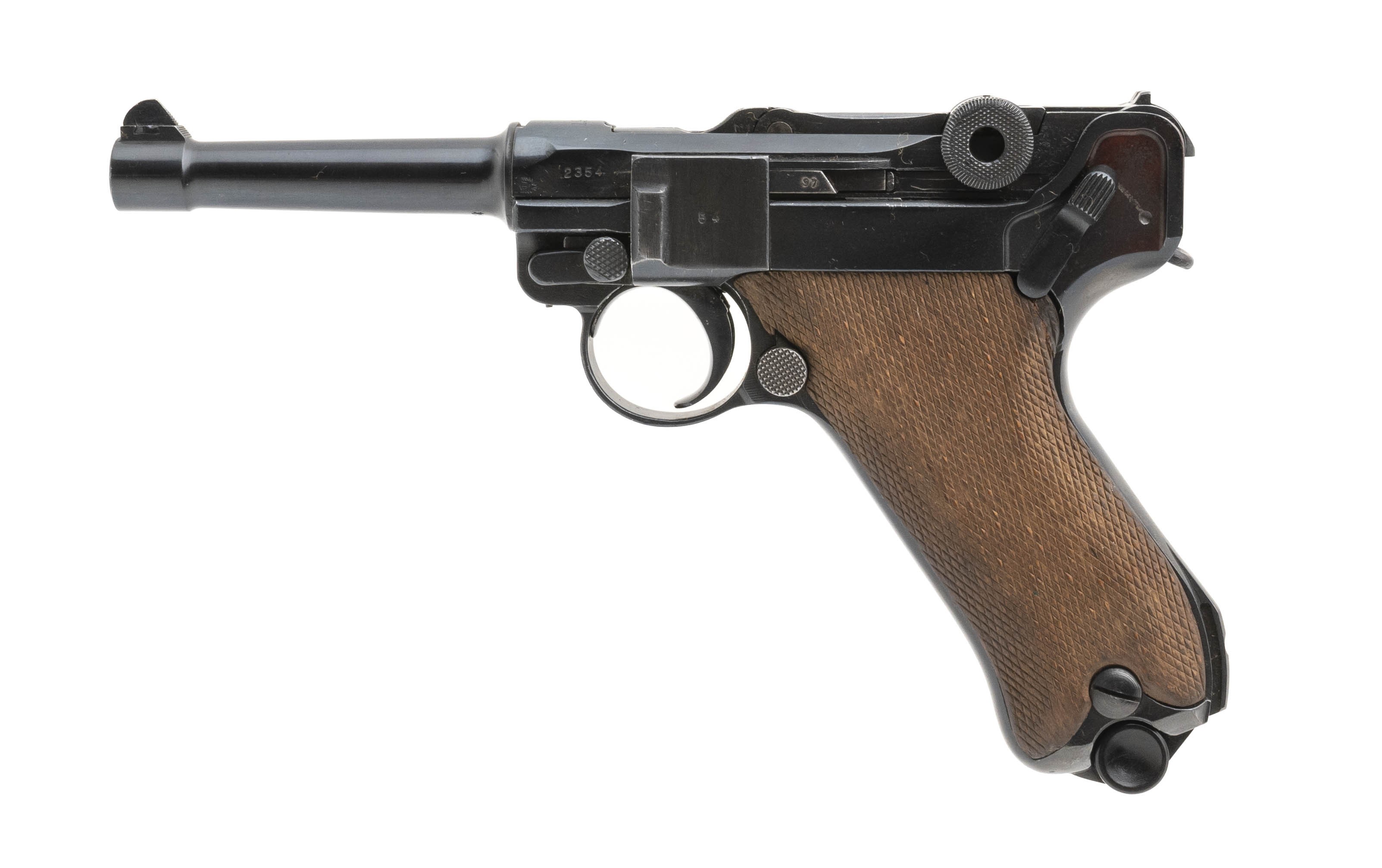 Serial No. 2354H chambered in 9mm, manufactured in 1918 with a 4" round barrel. Luger is been refinished and is all matching. Bore is bright with strong rifling, Magazine is not numbered. Overall very good condition