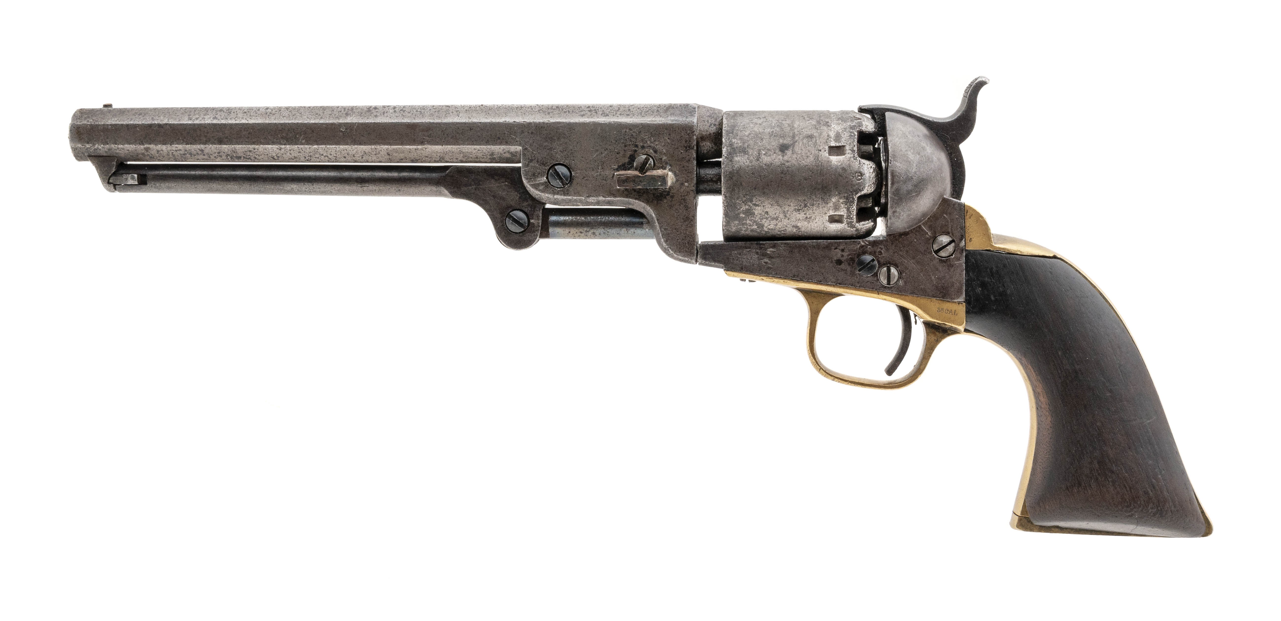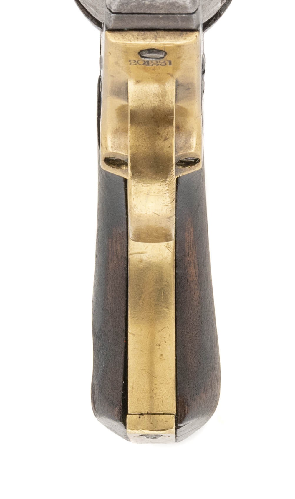 Serial number 204231. Made in 1868. 36 caliber with a 7 ½” barrel. This gun has a mottled gray patina with scattered pitting. This gun has visible British proofs on the cylinder.