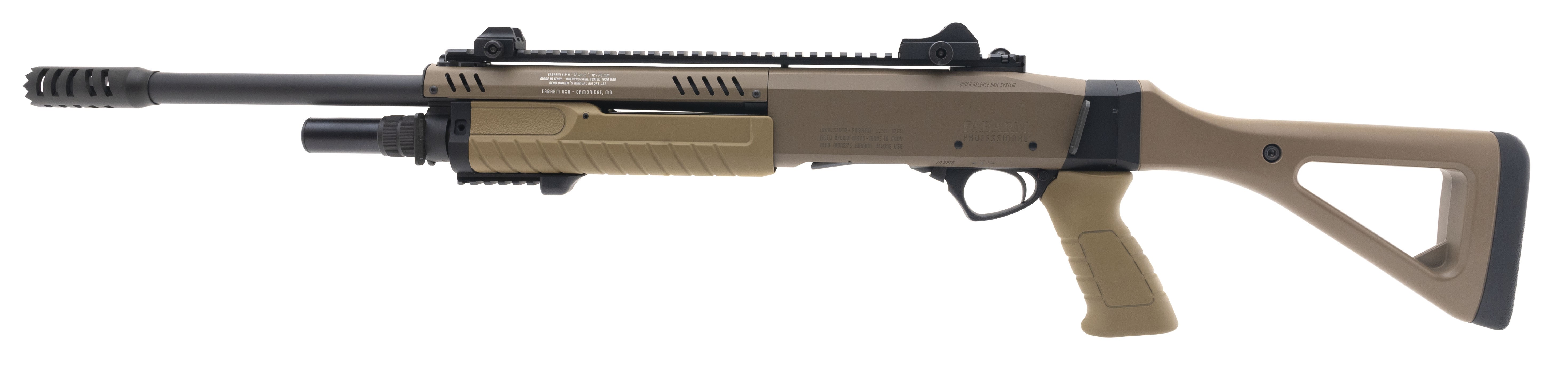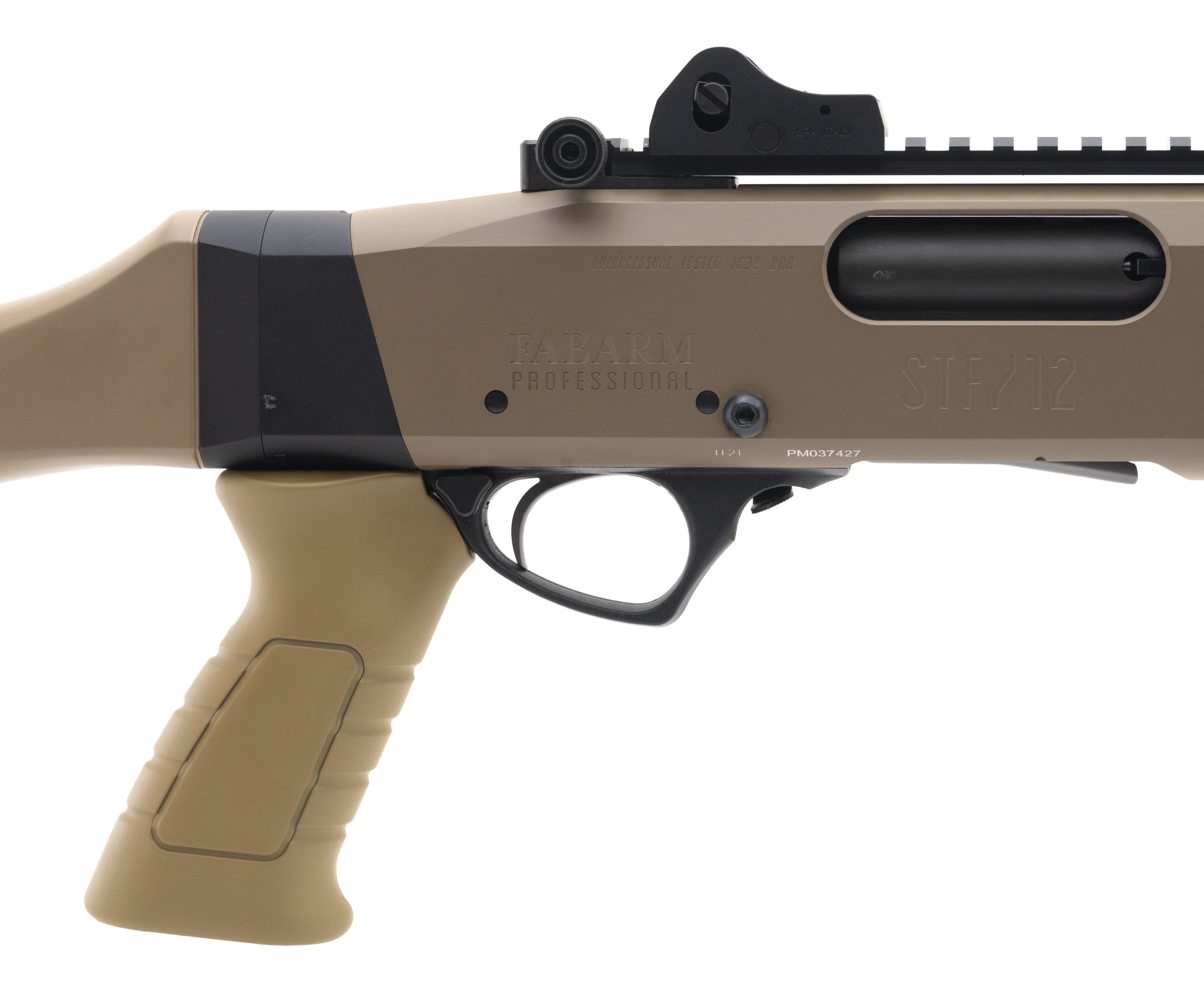 SN: PM037427. Pump action tactical shotgun with 18.5" barrel and muzzle brake, fiber optic sights and optic rail. In FDE finish. Overall excellent condition. Comes with box.