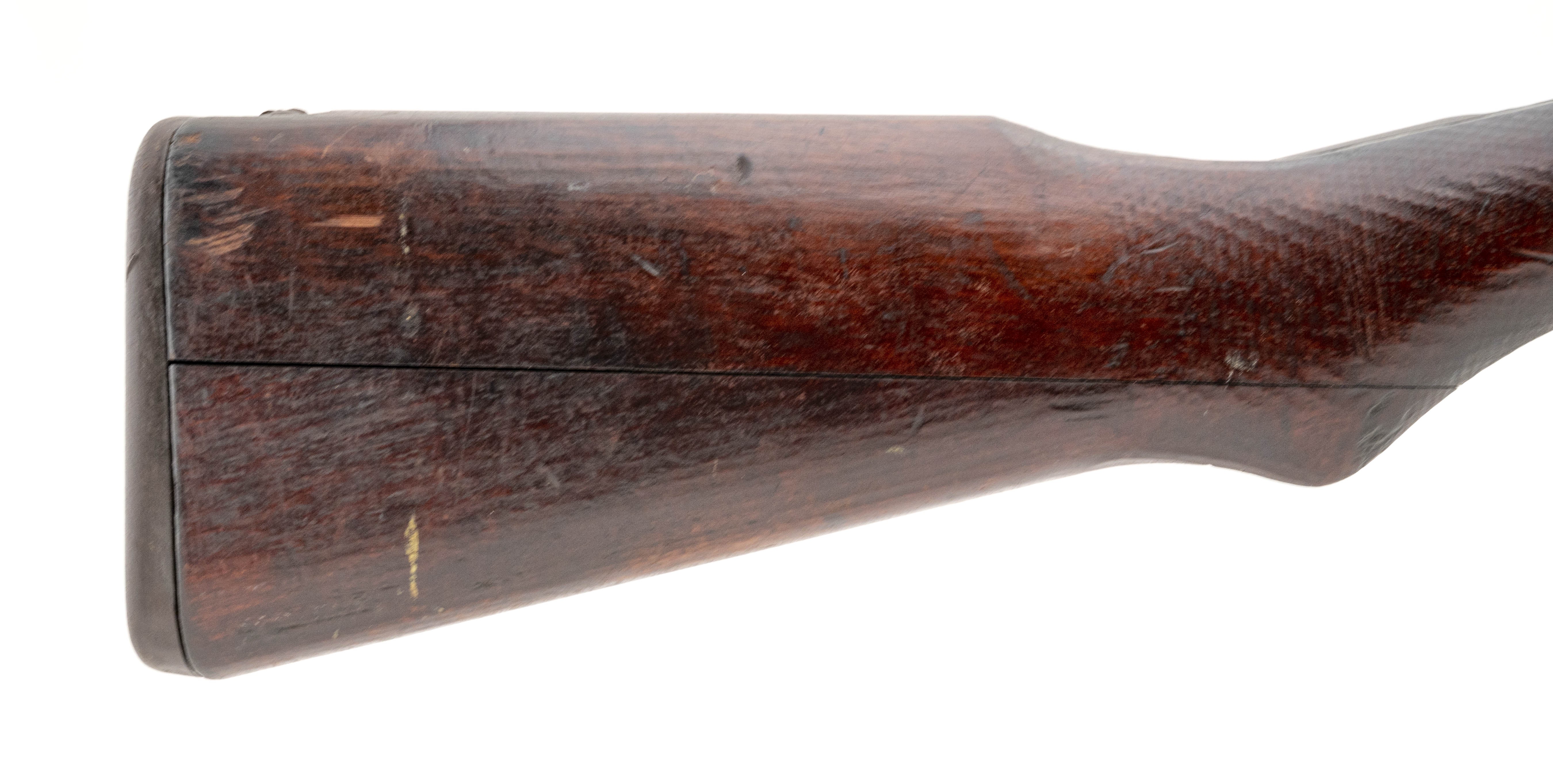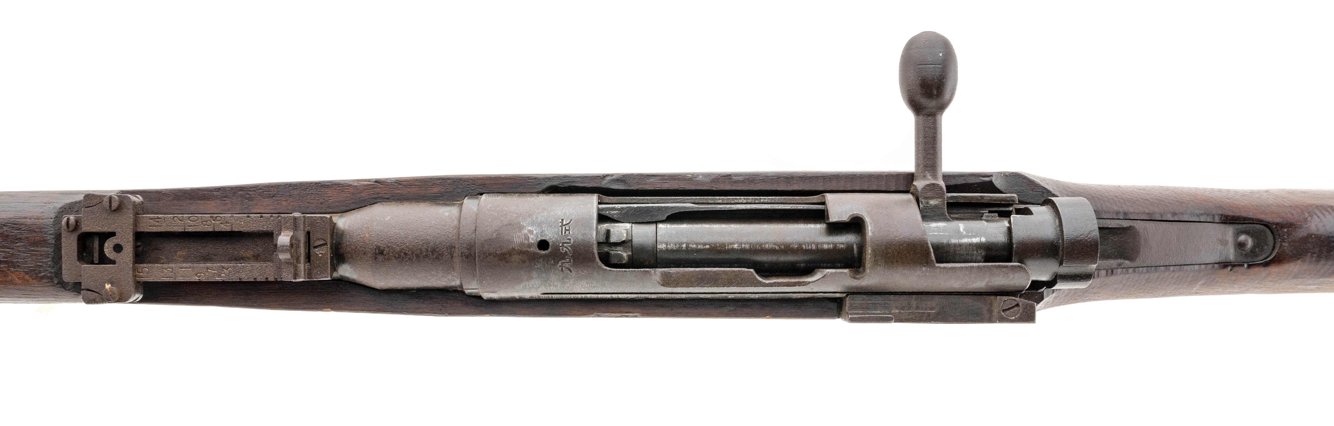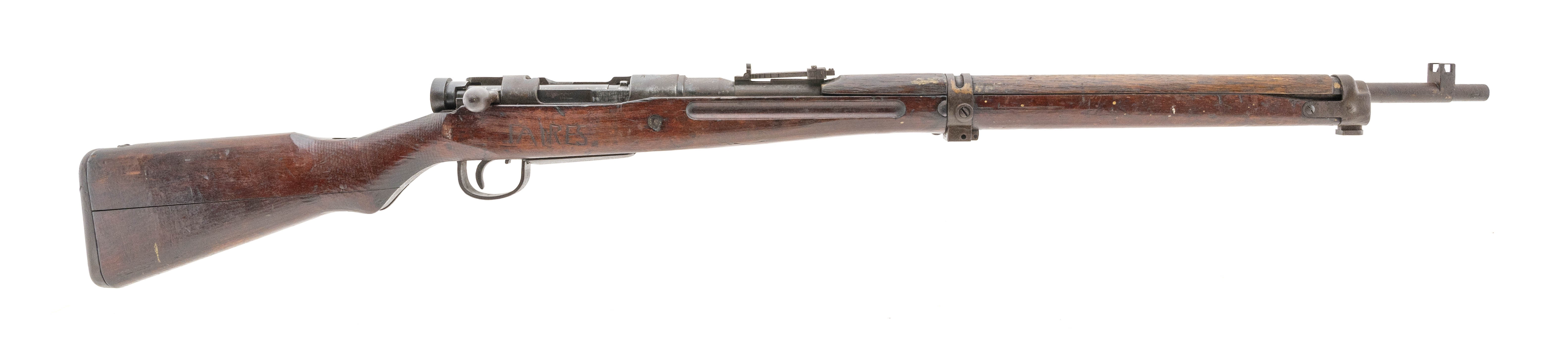 Serial No. 68914, chambered in 7.7jap, 26" round barrel. Rifle is in untouched condition, surface oxidation is noted on metal surface. Mum has been grounded off, bore is dark with frosting and pitting noted in the rifling. Wood shows dings and scratches with names carved into each side of the rifle. Bolt is matching to receiver. Overall good looking example of a bring back
