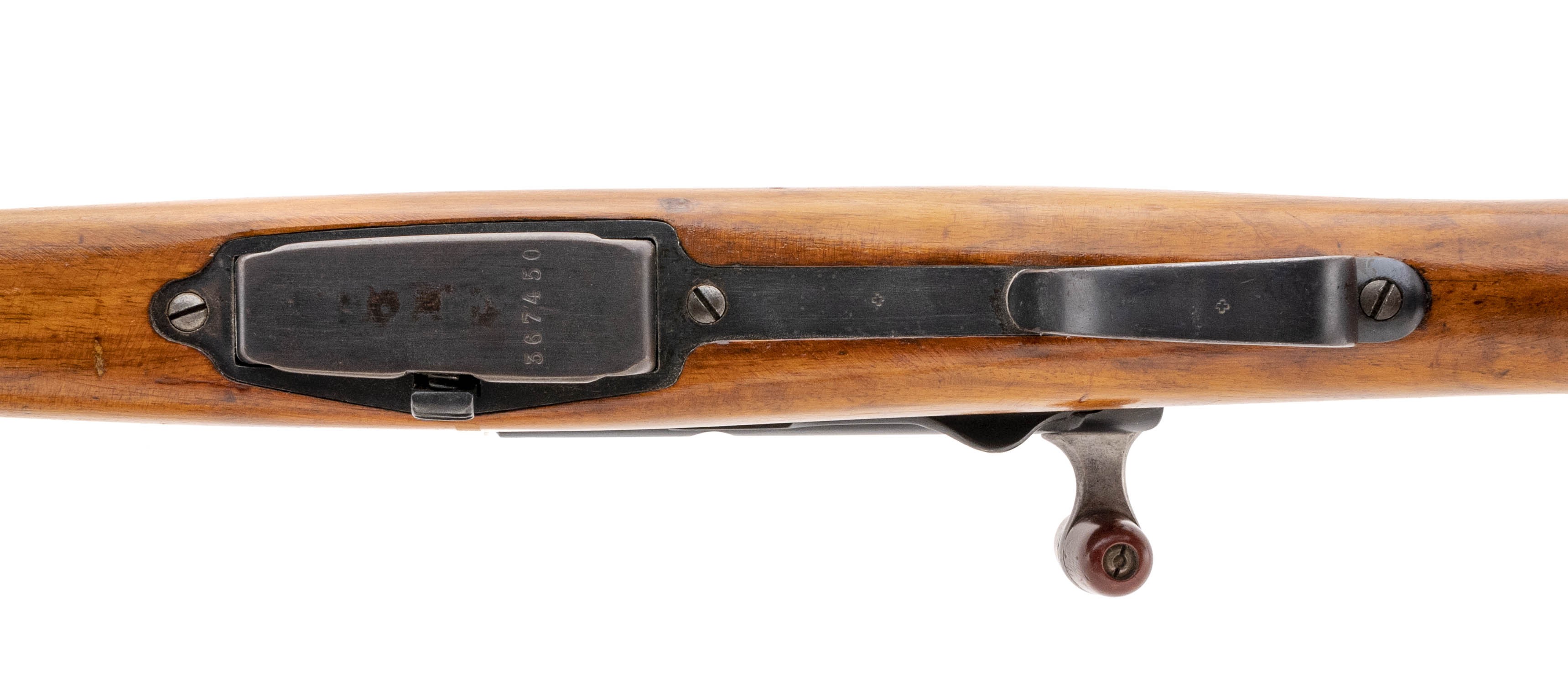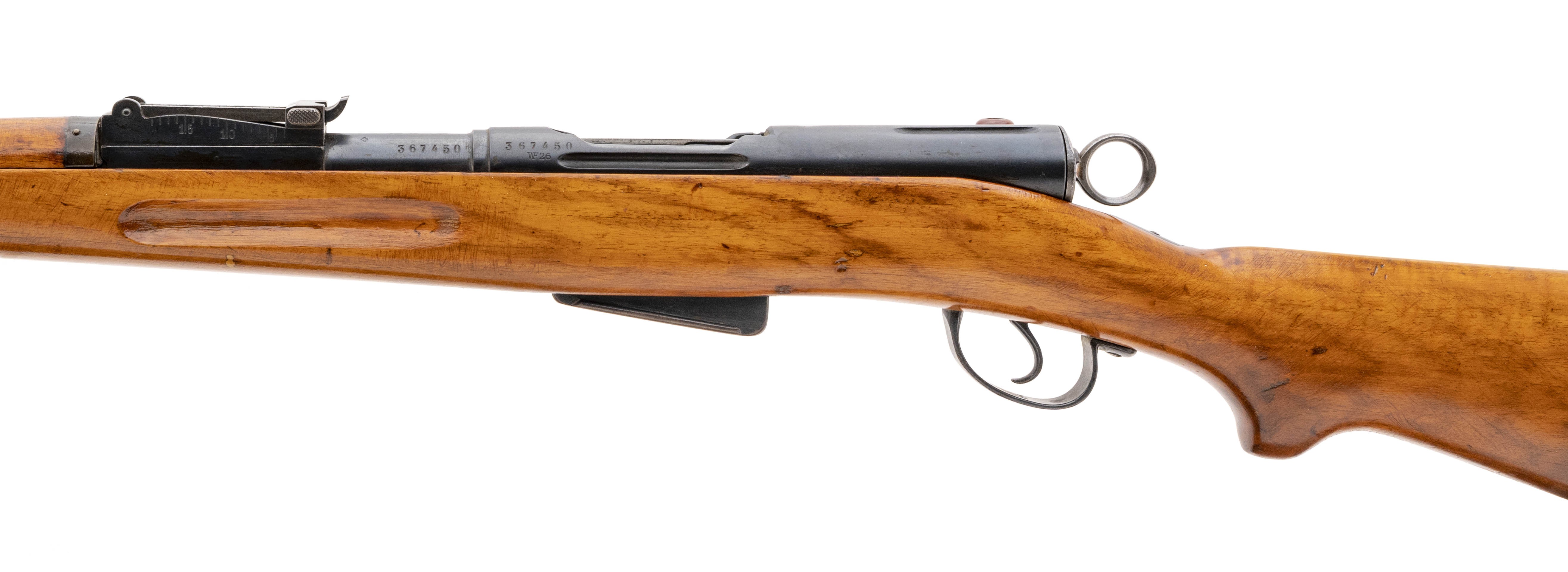 Serial No. 367450, made circa 1913-1919, chambered in 7.5x55, 31" round barrel, overall good condition serial numbers are matching including magazine. Bore is bright with strong rifling. Stock has minor dings visible with added varnish.