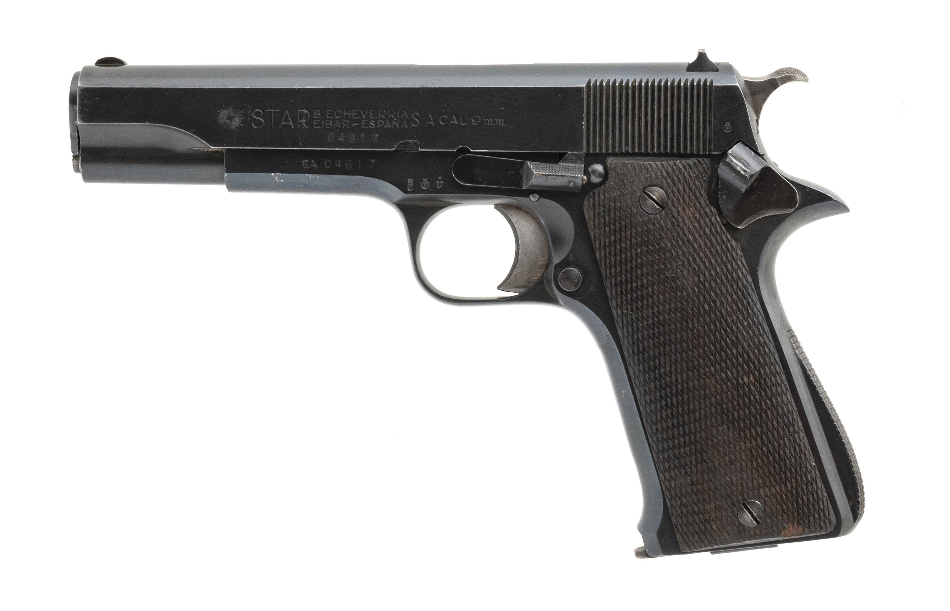 SN: EA04617. Made in 1959, 9mm Largo, 5" barrel. Excellent condition Model A with an excellent bore. Right side of the slide is marked with "Ejercito Del Aire" crest. Comes with one factory eight-round magazine.