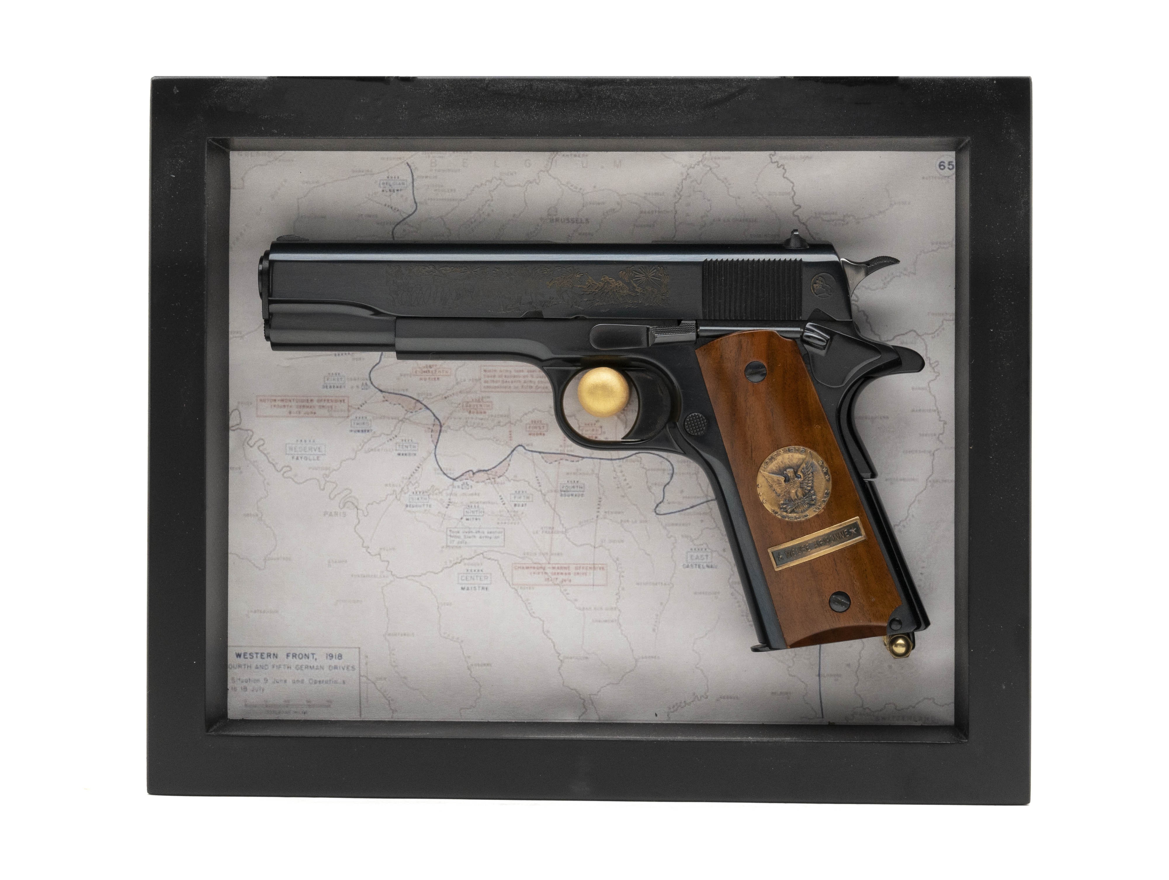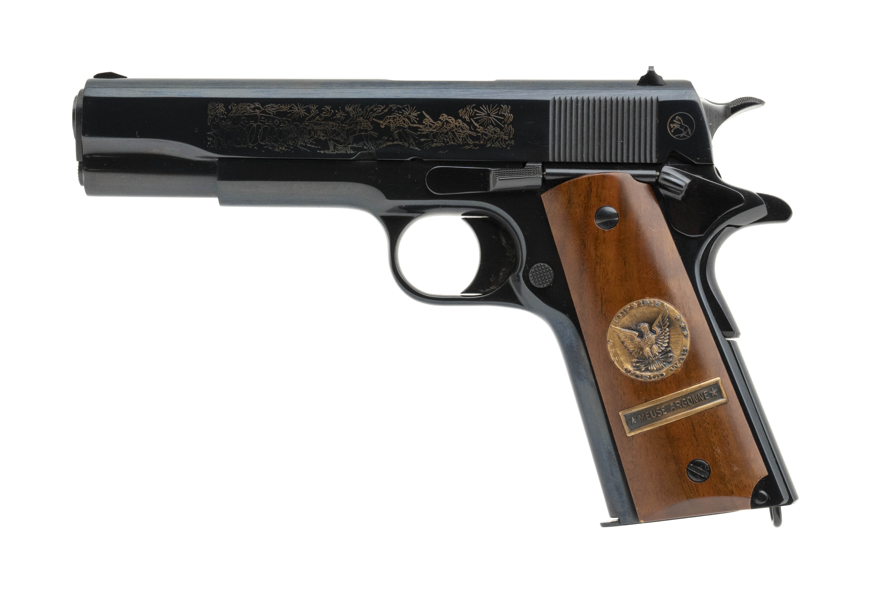 SN:7138-MA. Made in 1969, .45 ACP, 5" barrel. WWI Series Meuse-Argonne Offensive commemorative 1911 pistol with custom display case. Excellent condition.