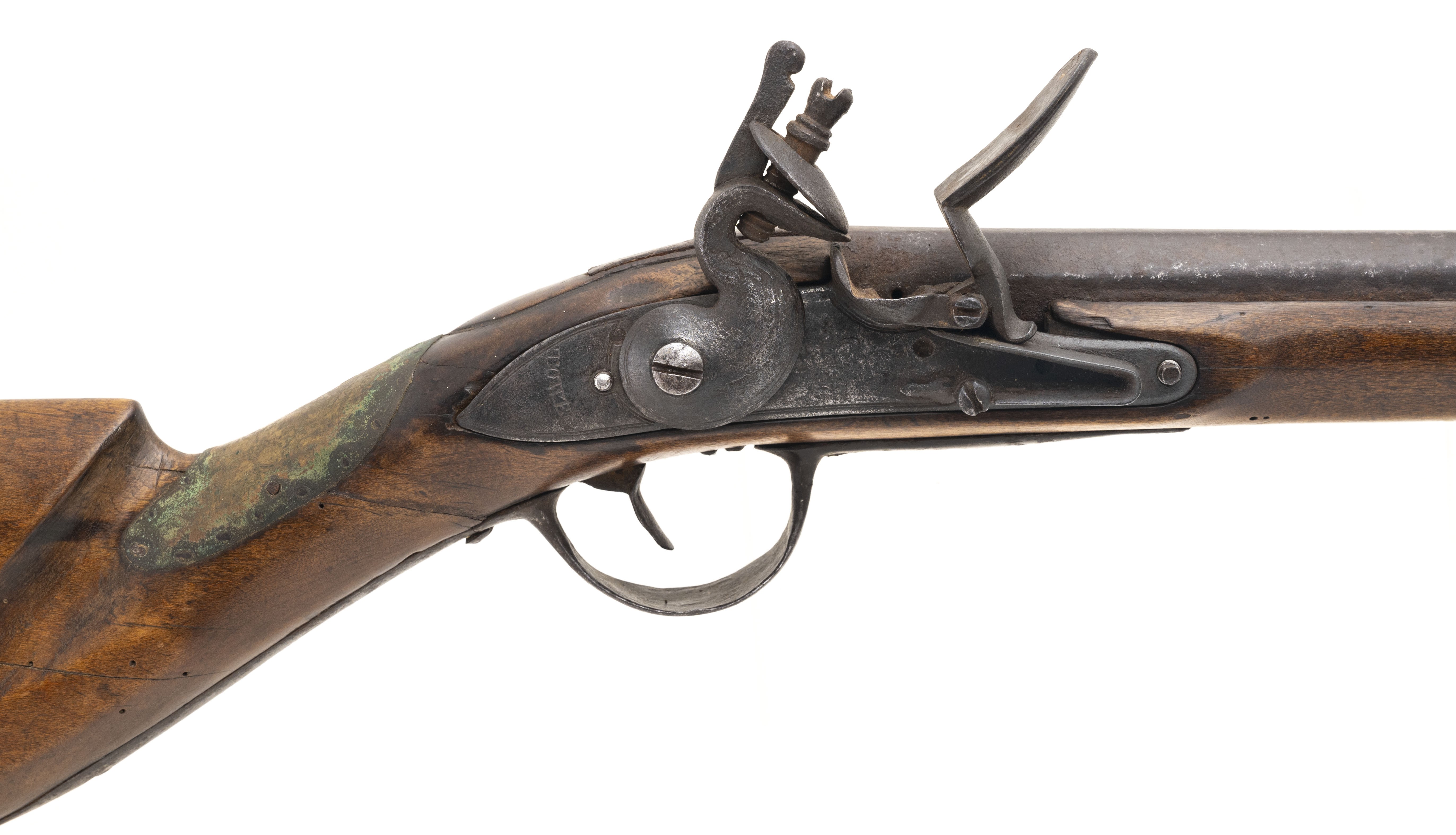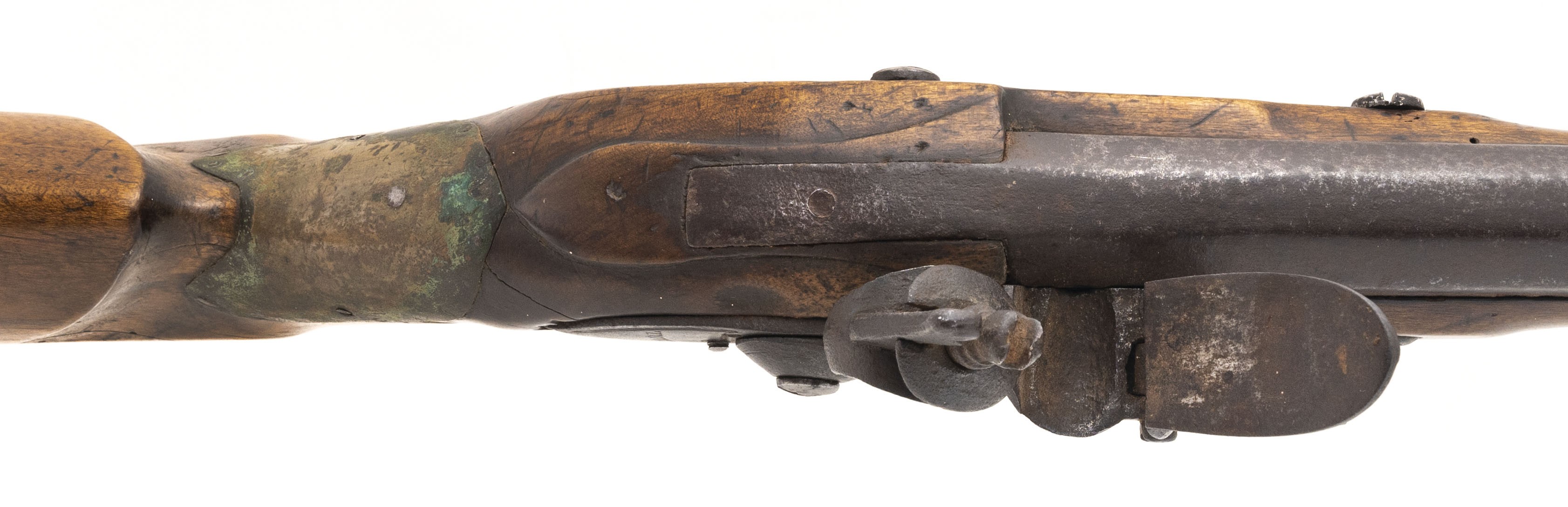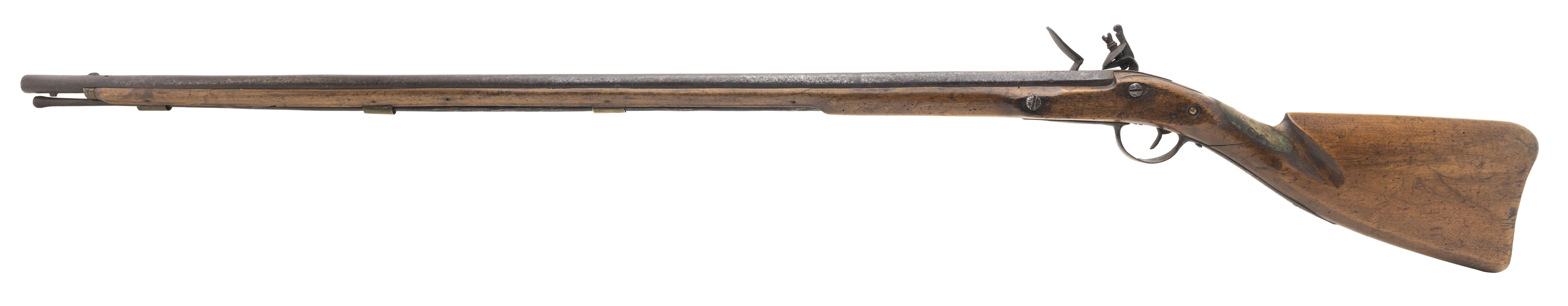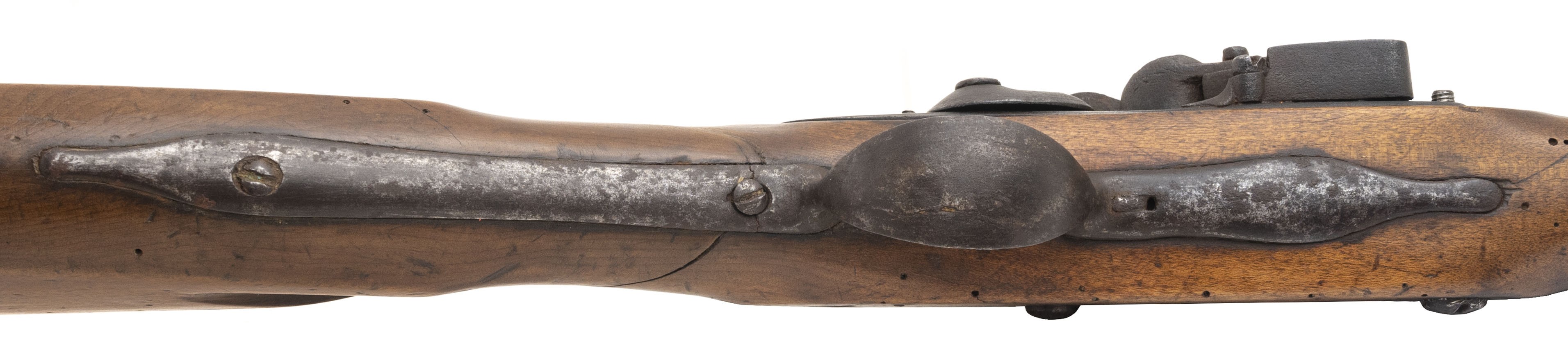 NSN, circa 1750's-1770s, .74 caliber, 46.75" octagonal to round unmarked barrel. Barrel and iron parts are a dark grey/ brown patina with surface oxidation visible. Barrel appears to be of early French with rear sight added. A small corrosion hole is noted by rear sight. Lock is of a 1777 pattern with "CROWN/GR" Broad Arrow forward of cock. "TOWER" is marked vertically rear of cock. Trigger Guard and ram-rod appear to be that of a 1766 "Charleville" Stock looks to have been lightly sanded at some point with expected nicks, dings and scratches visible. Wrist has a period correct brass plate repair. Jaw screw is missing its top round surface piece. Action functions correctly.