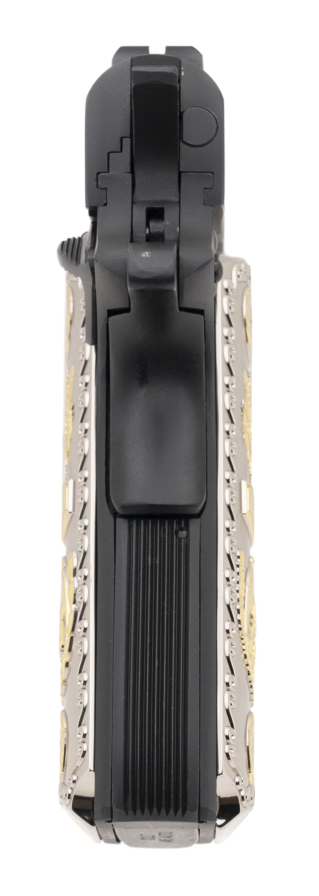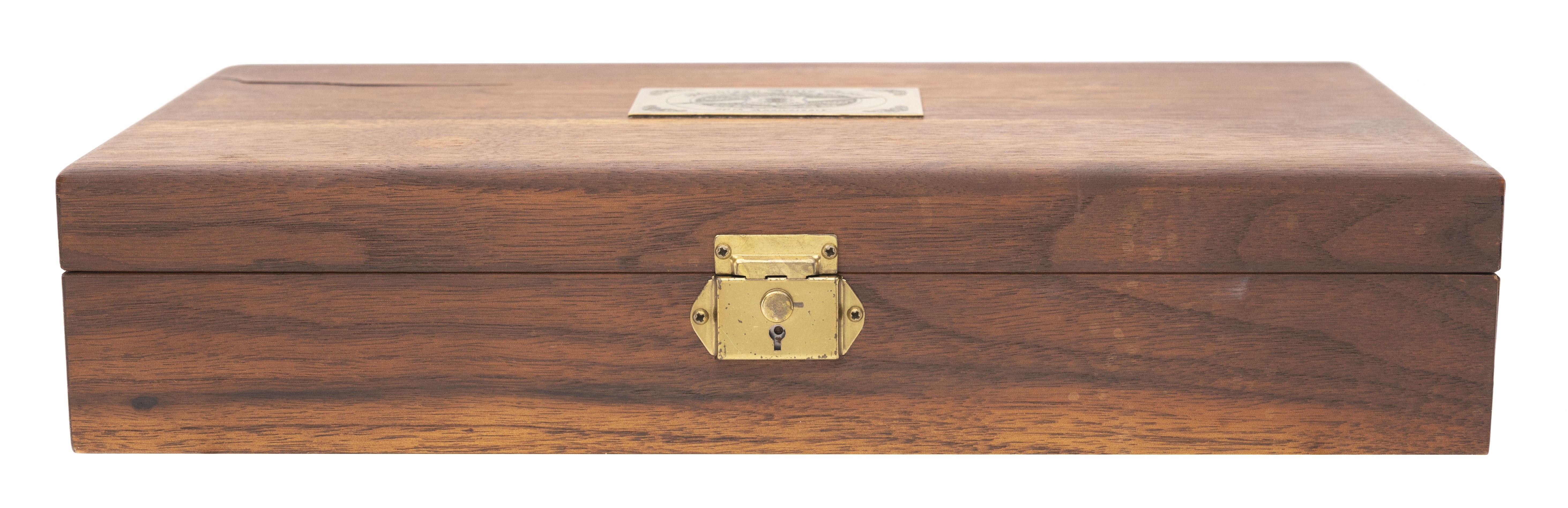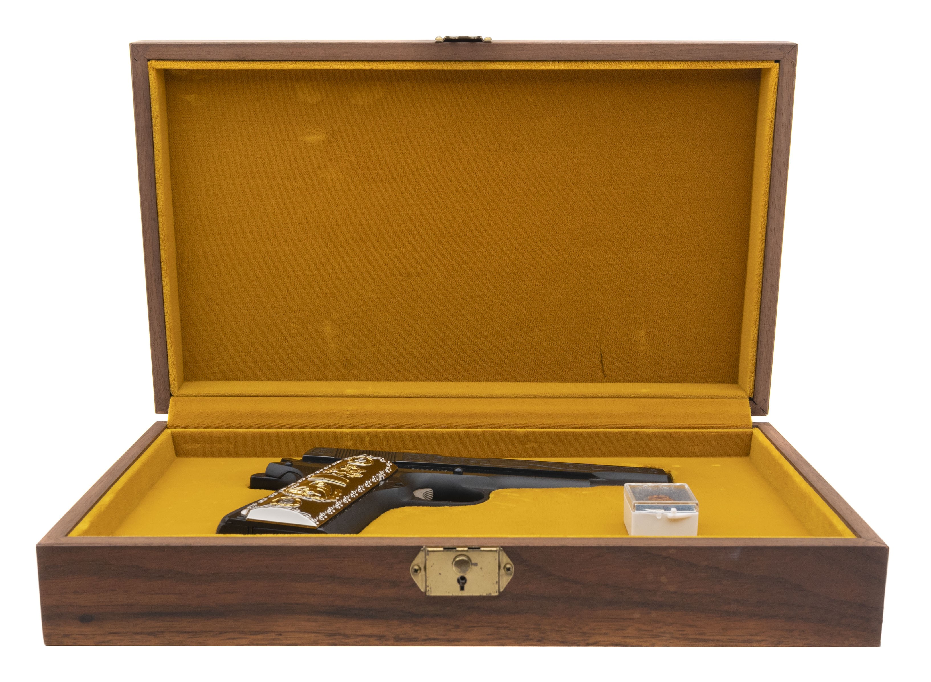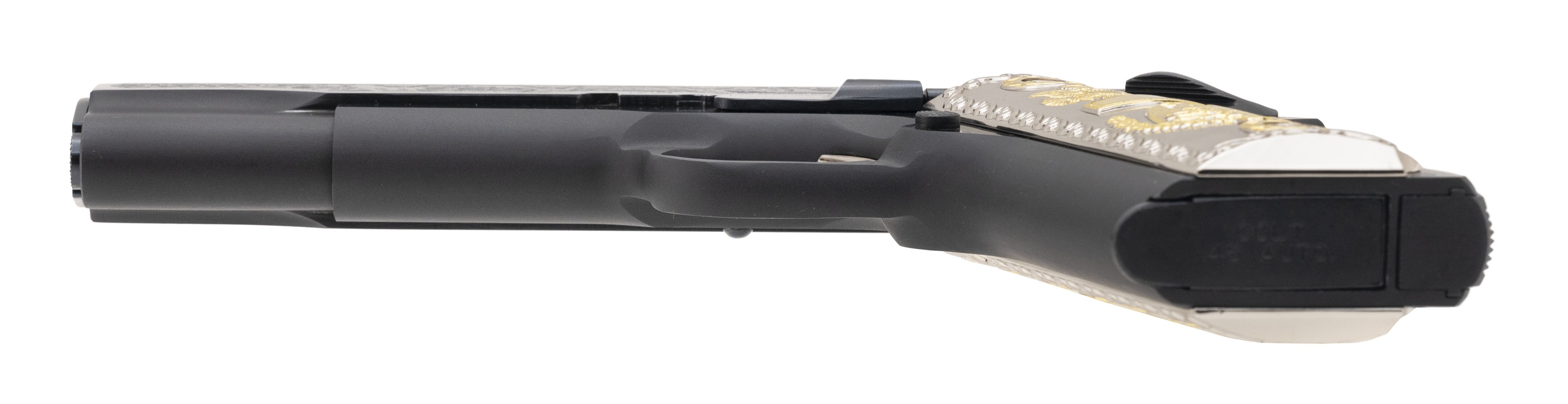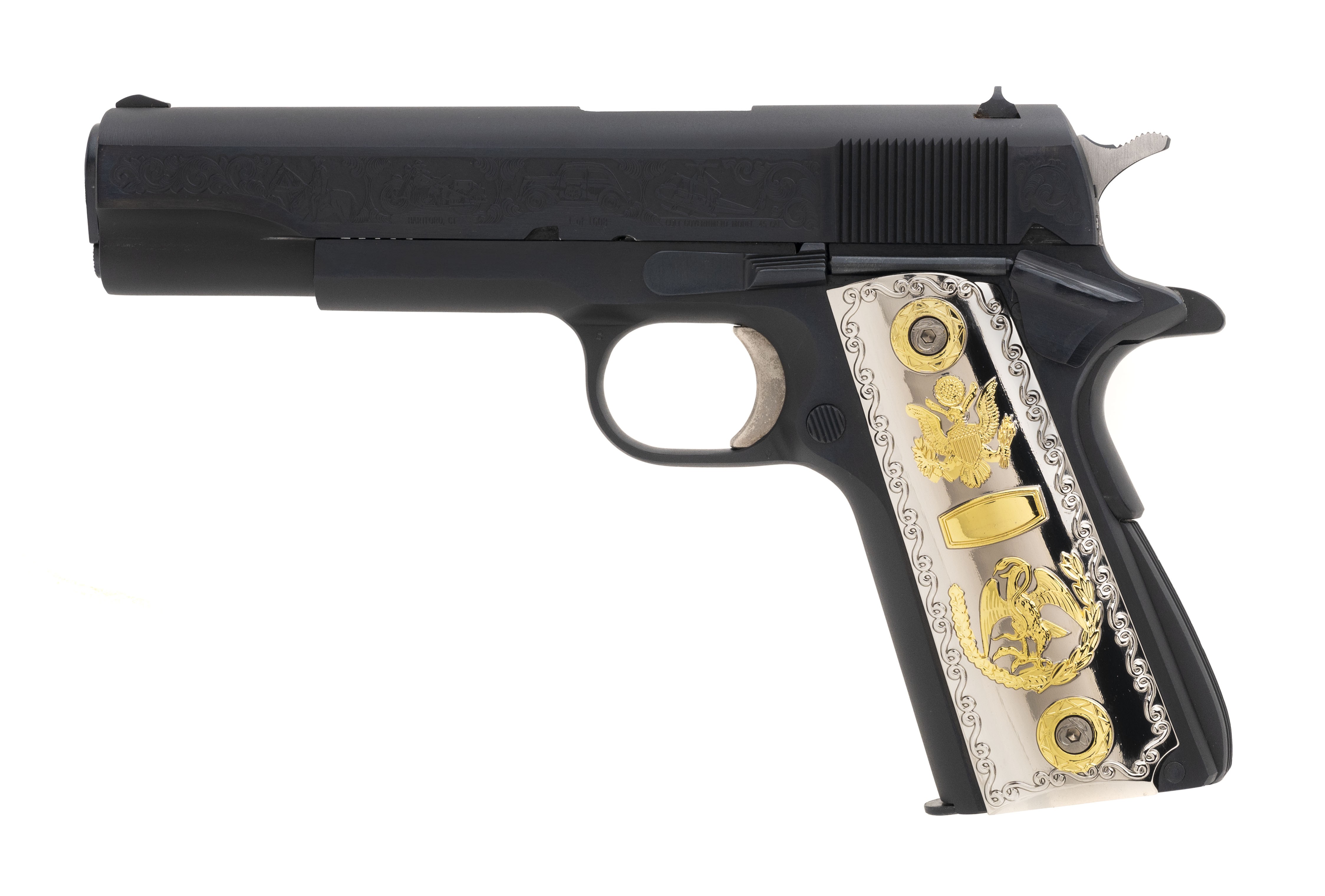 SN: 64380G70. Made in 1977. .45 ACP with a 5" barrel. Special edition 1911 pistol with etched police scenes and fancy grips. Excellent condition with wooden presentation case.