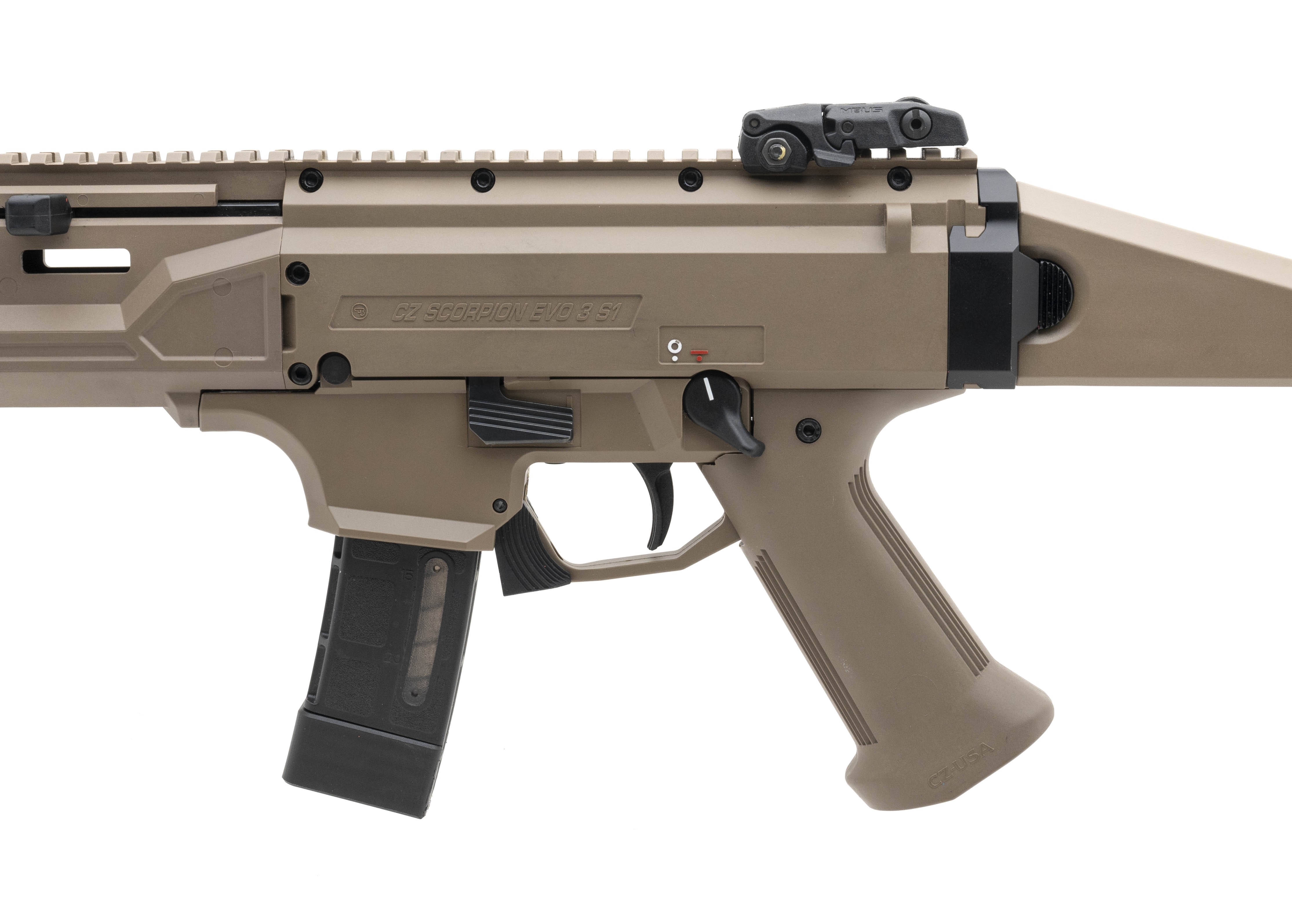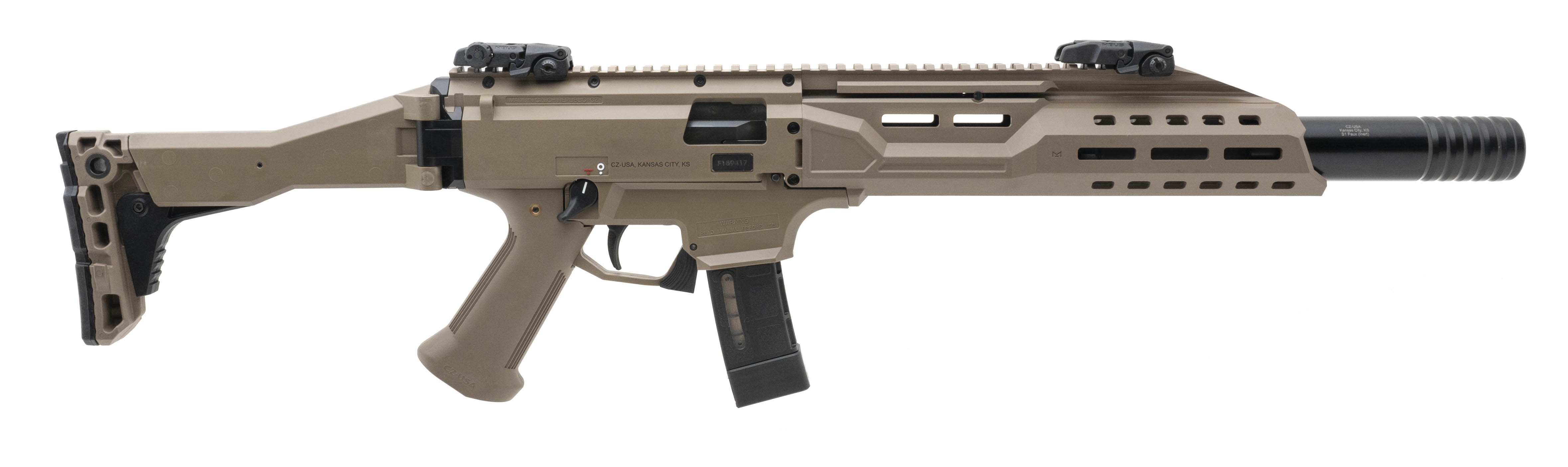 SN: F189417. Modern Production, x919mm parabellum with a 16" Barrel. Bore is in excellent condition. FDE polymer semi-auto rifle with Magpul MBUS flip-up sights, inert faux CZ USA suppressor, folding stock and ambidextrous thumb safety and mag release. Overall excellent condition.
