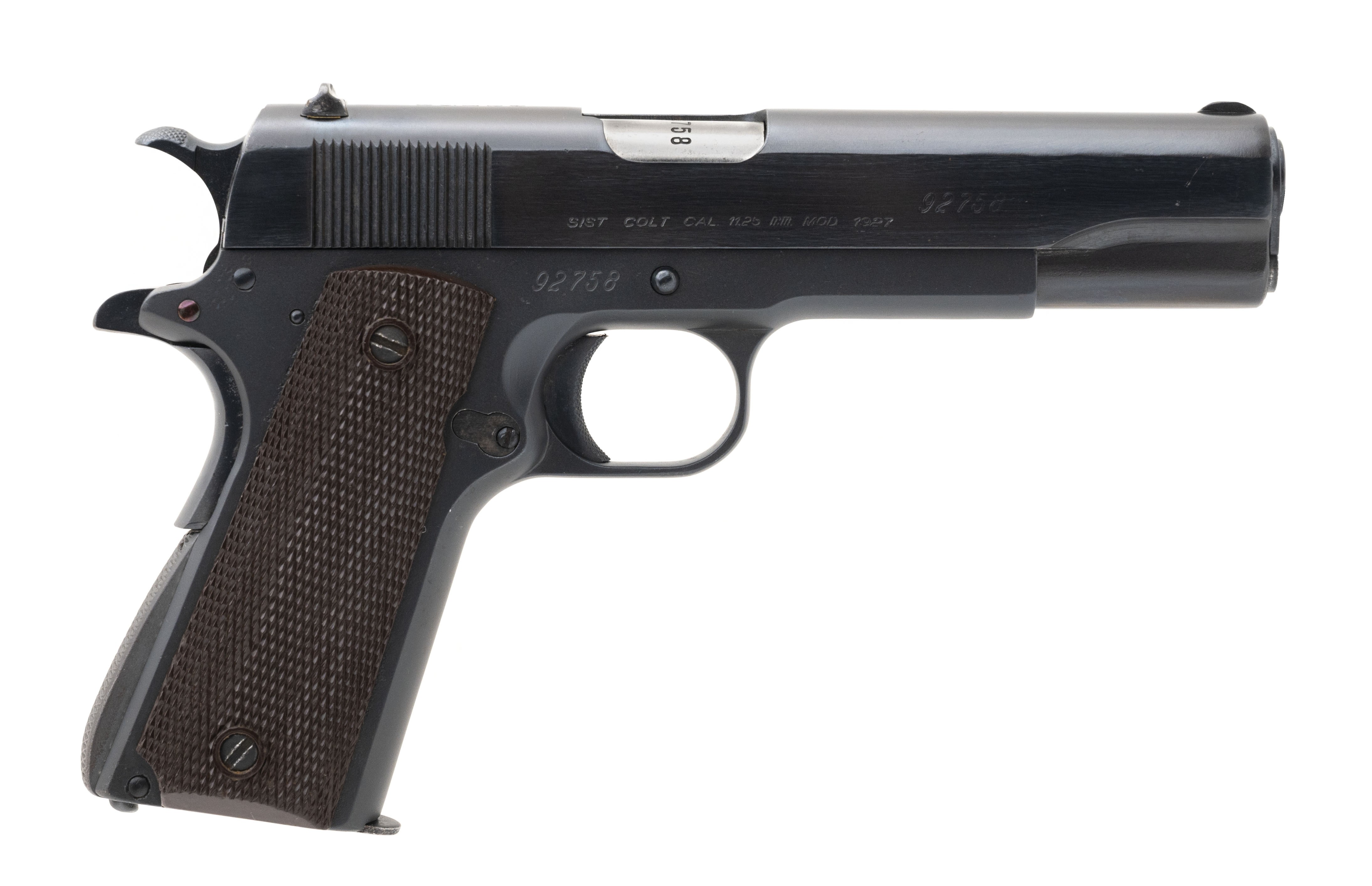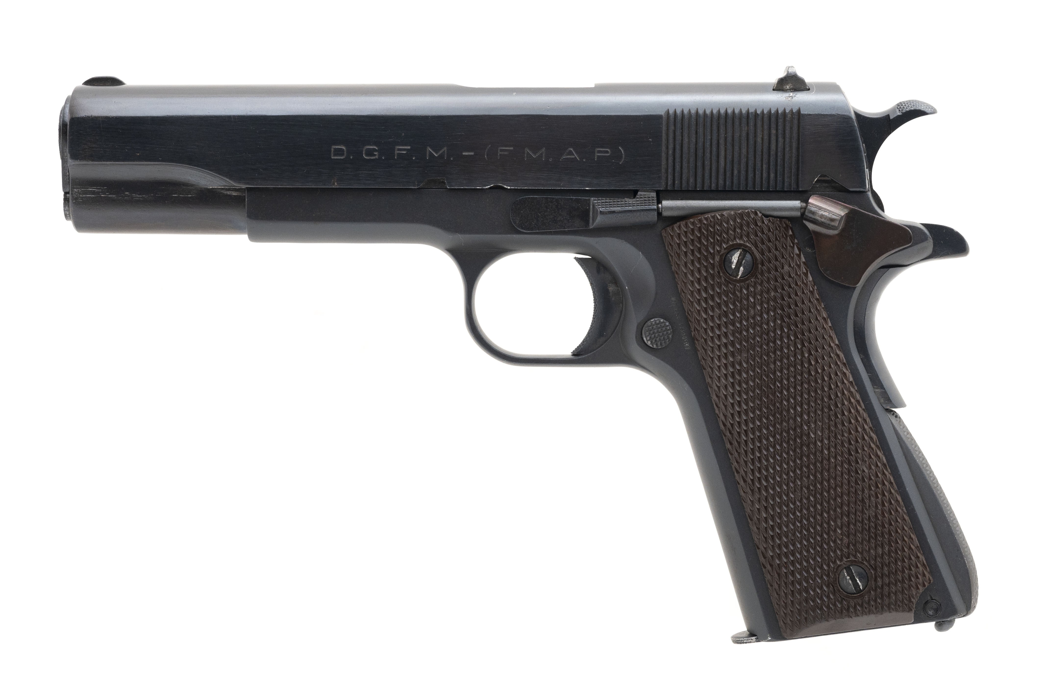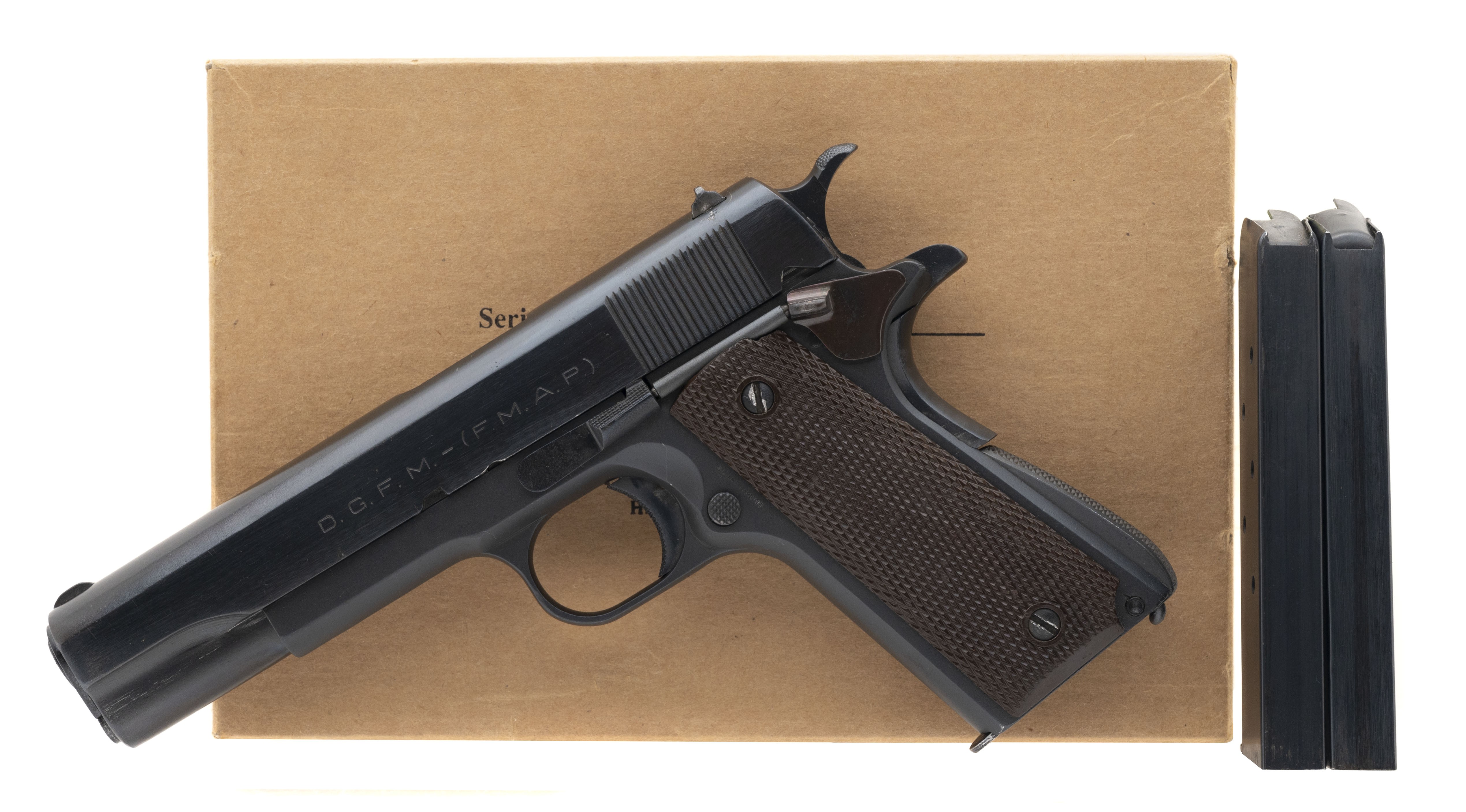 SN: 92758. Manufactured circa 1960, .45ACP with 5" barrel. Argentinian made full size 1911A1, Sistema Colt marked with all matching parts. Overall excellent condition. Comes with box and two extra magazines.