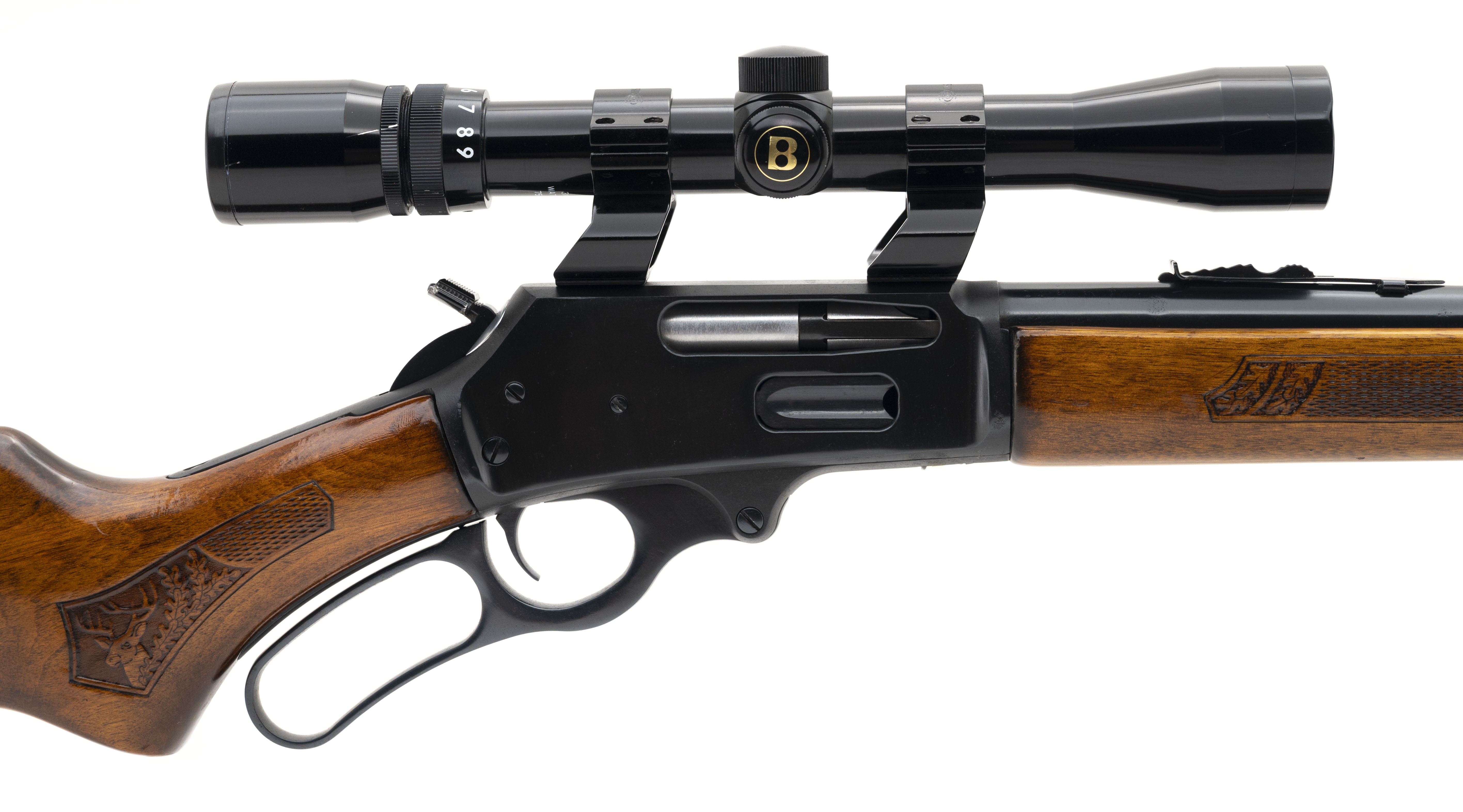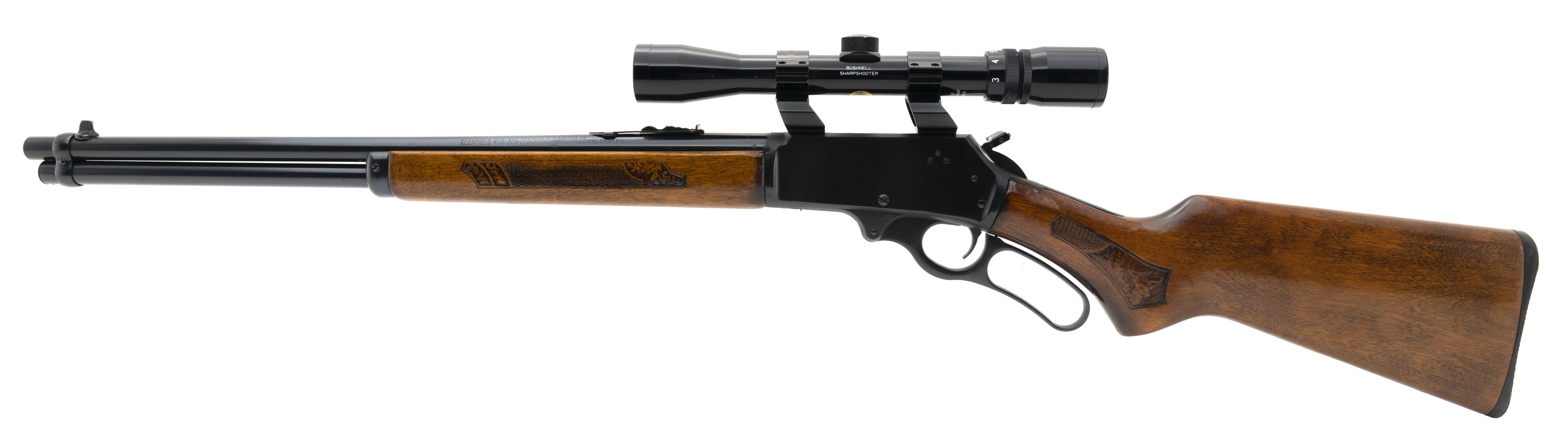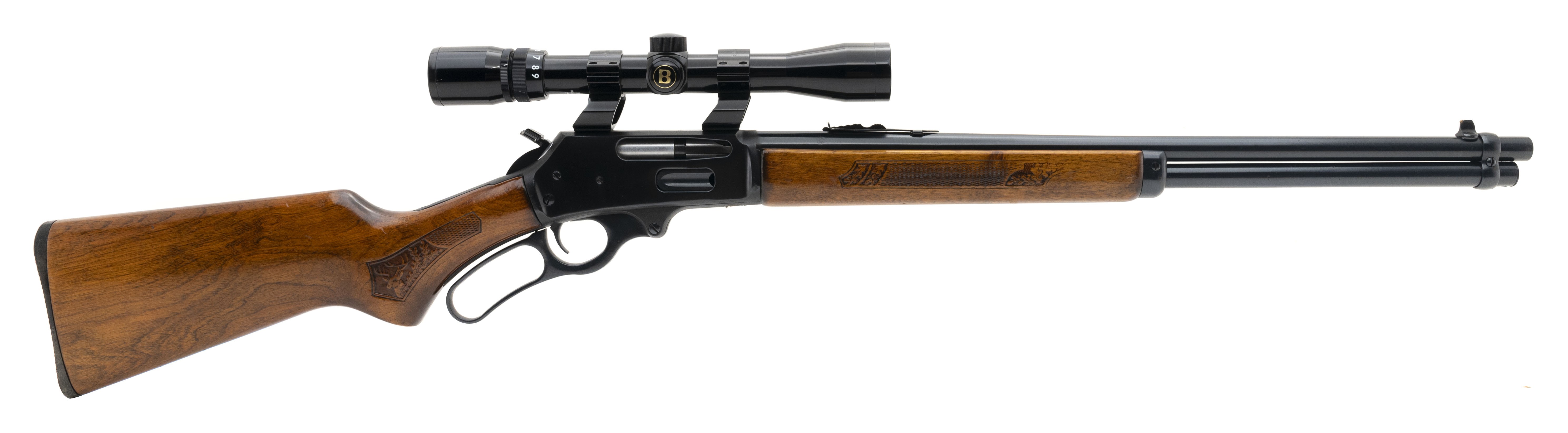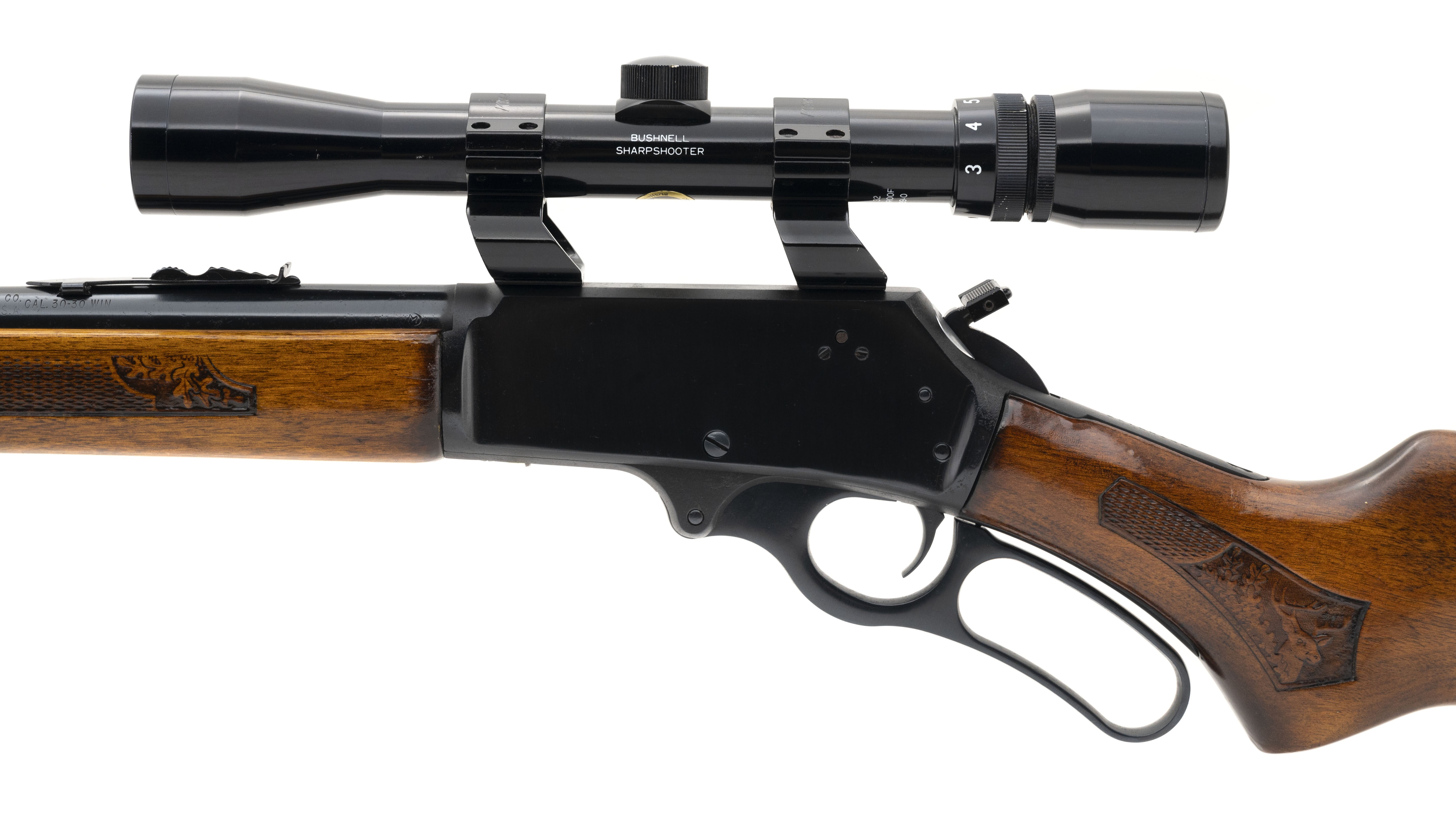 SN: 22168438. Manufactured in 1978, .30-30 Win with a 20" barrel. Lever action rifle with nearly 100% of its blue and checkered stock and forend. Overall excellent condition. Comes with Bushnell 3-9x scope.