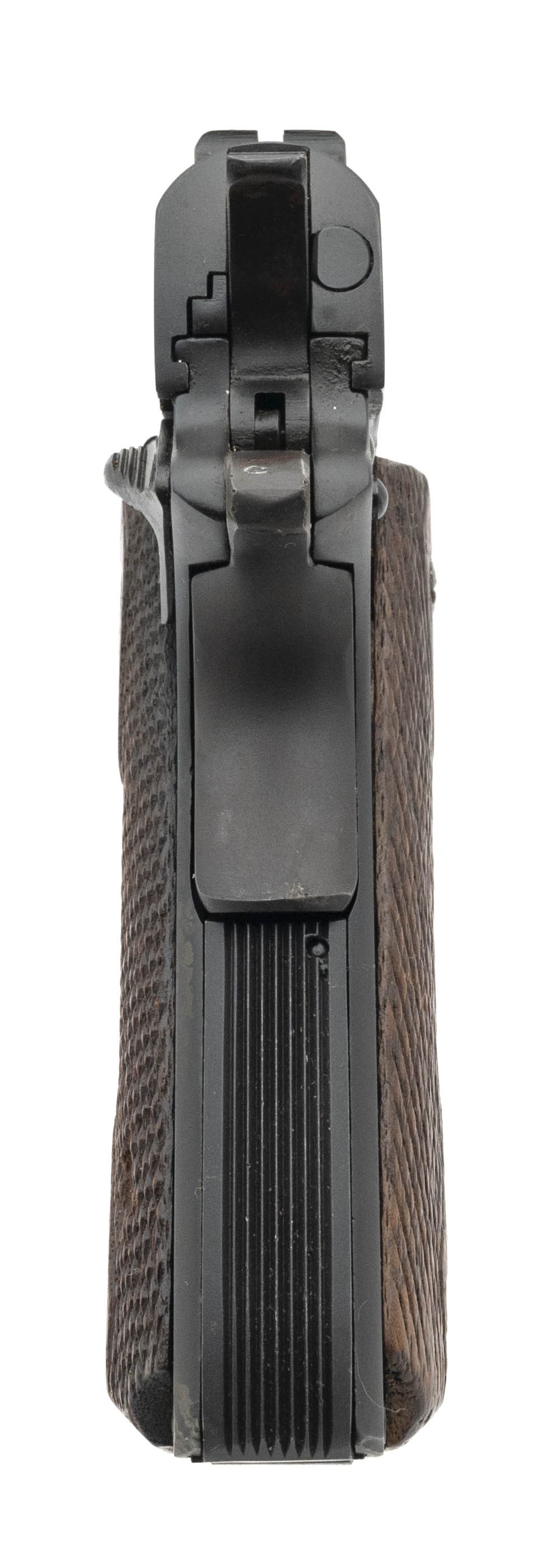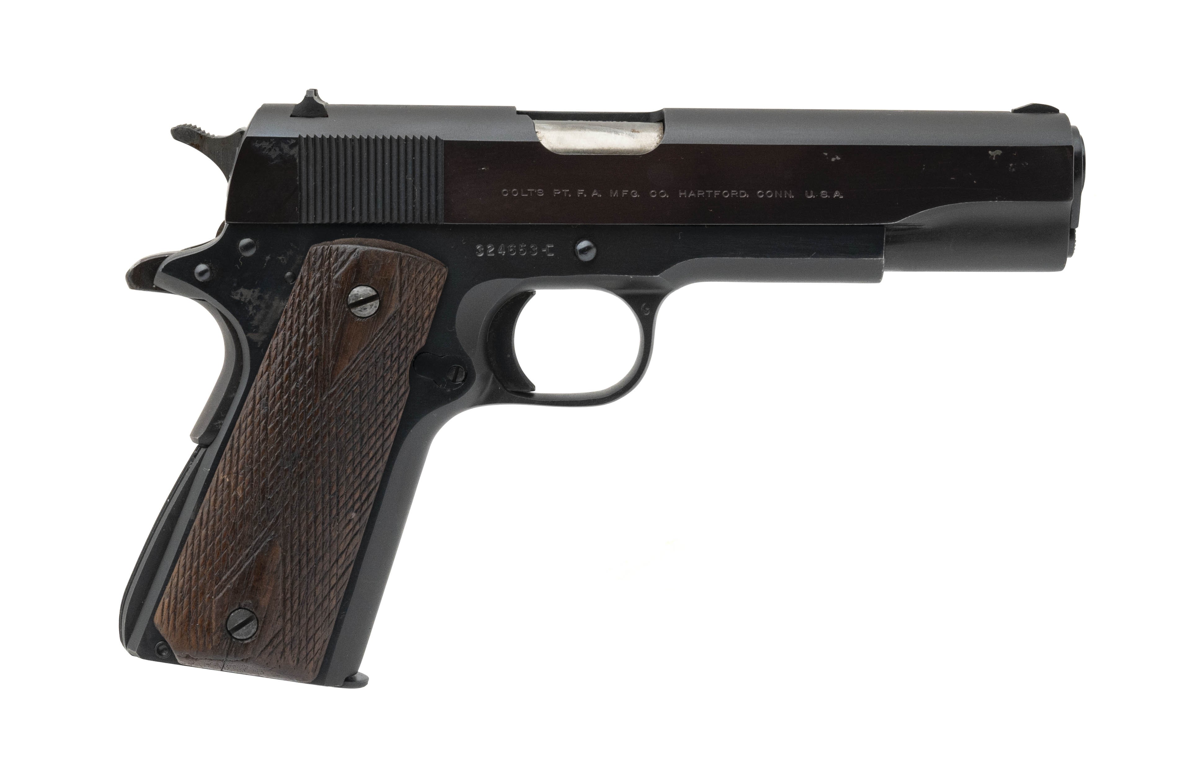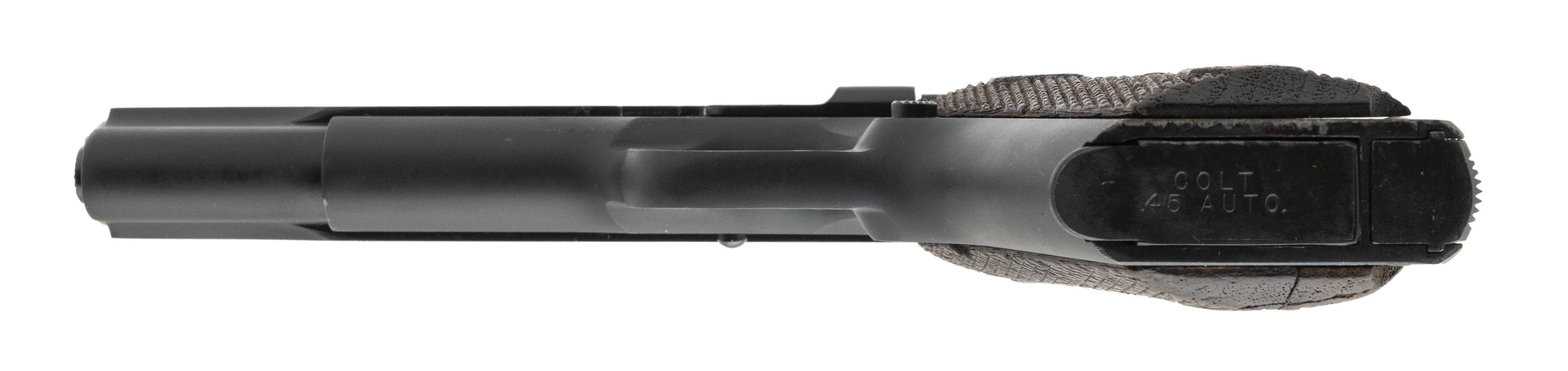 SN: 324653-C. Manufactured in 1969,.45ACP with a 5" barrel. Bore is excellent. Pre-70 Series Government model with some rust blemishes. Has approximately 70% of its original finish with the slide turning plum. Overall fair condition.