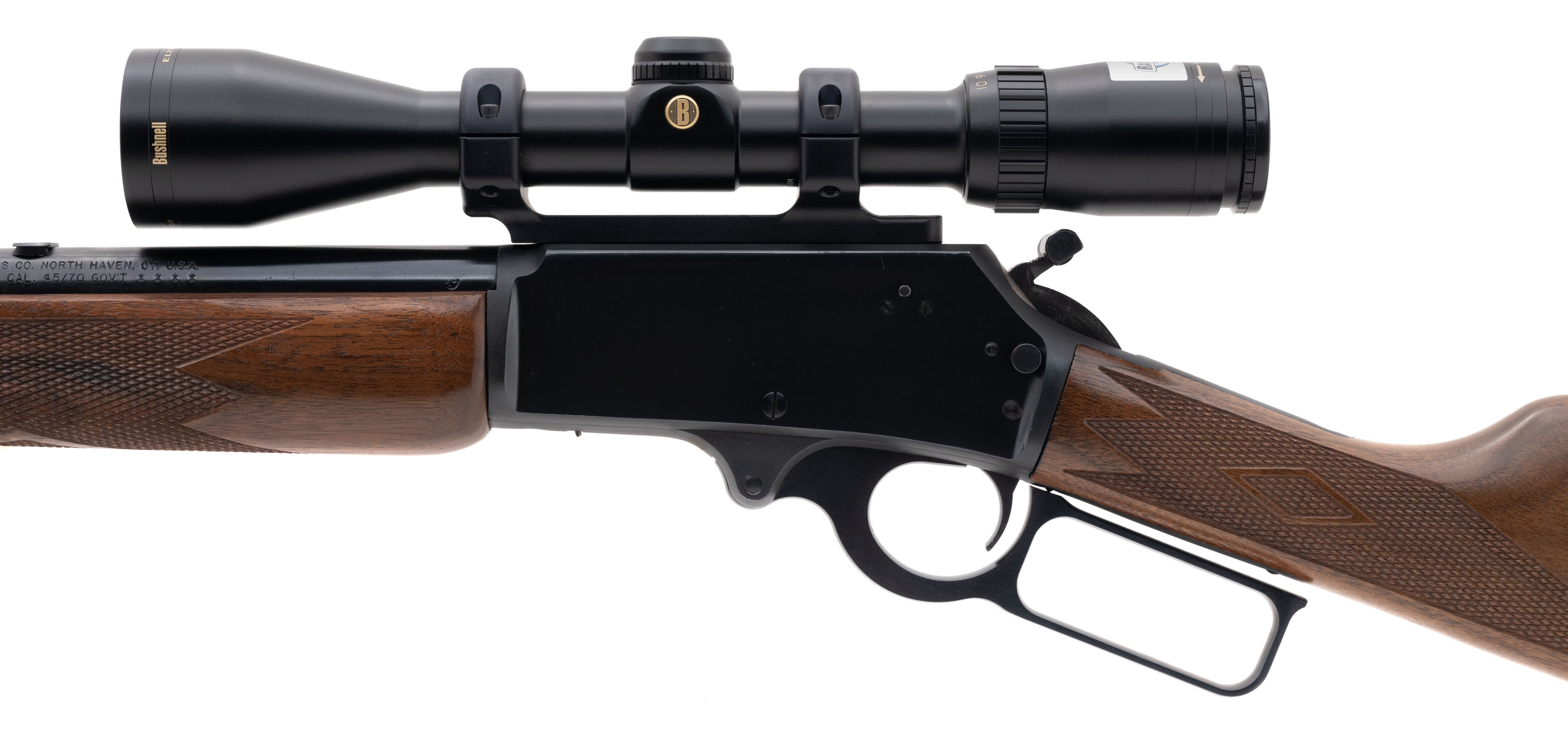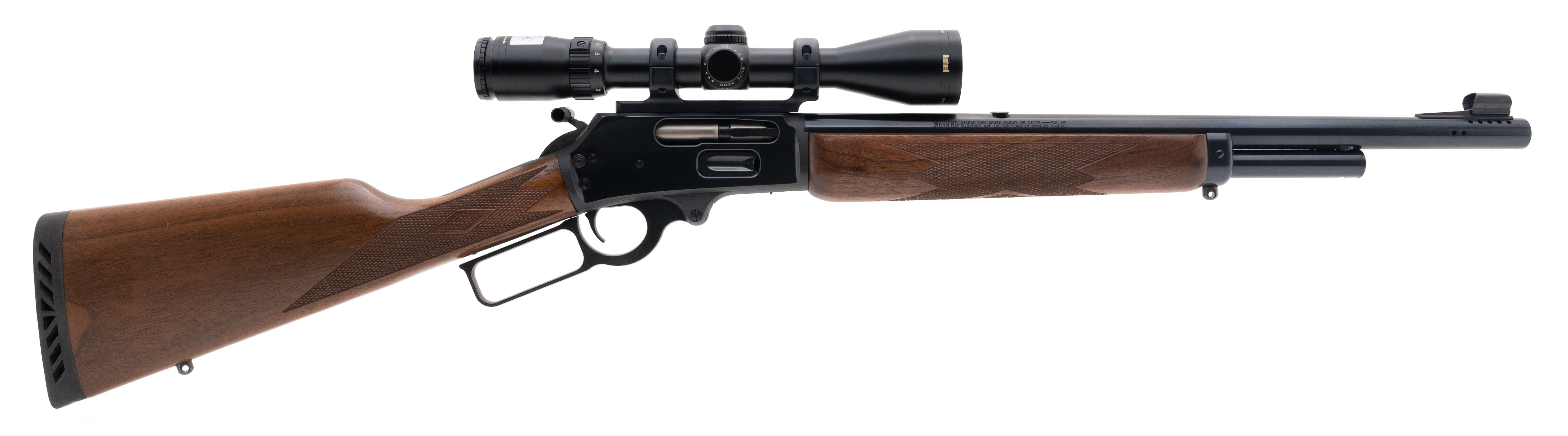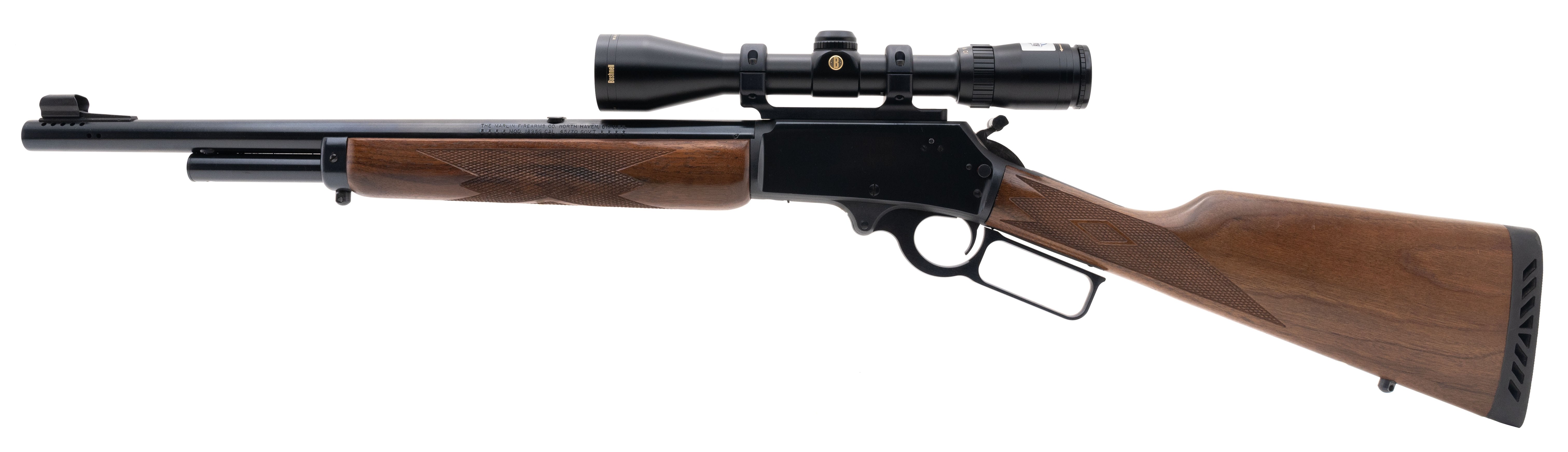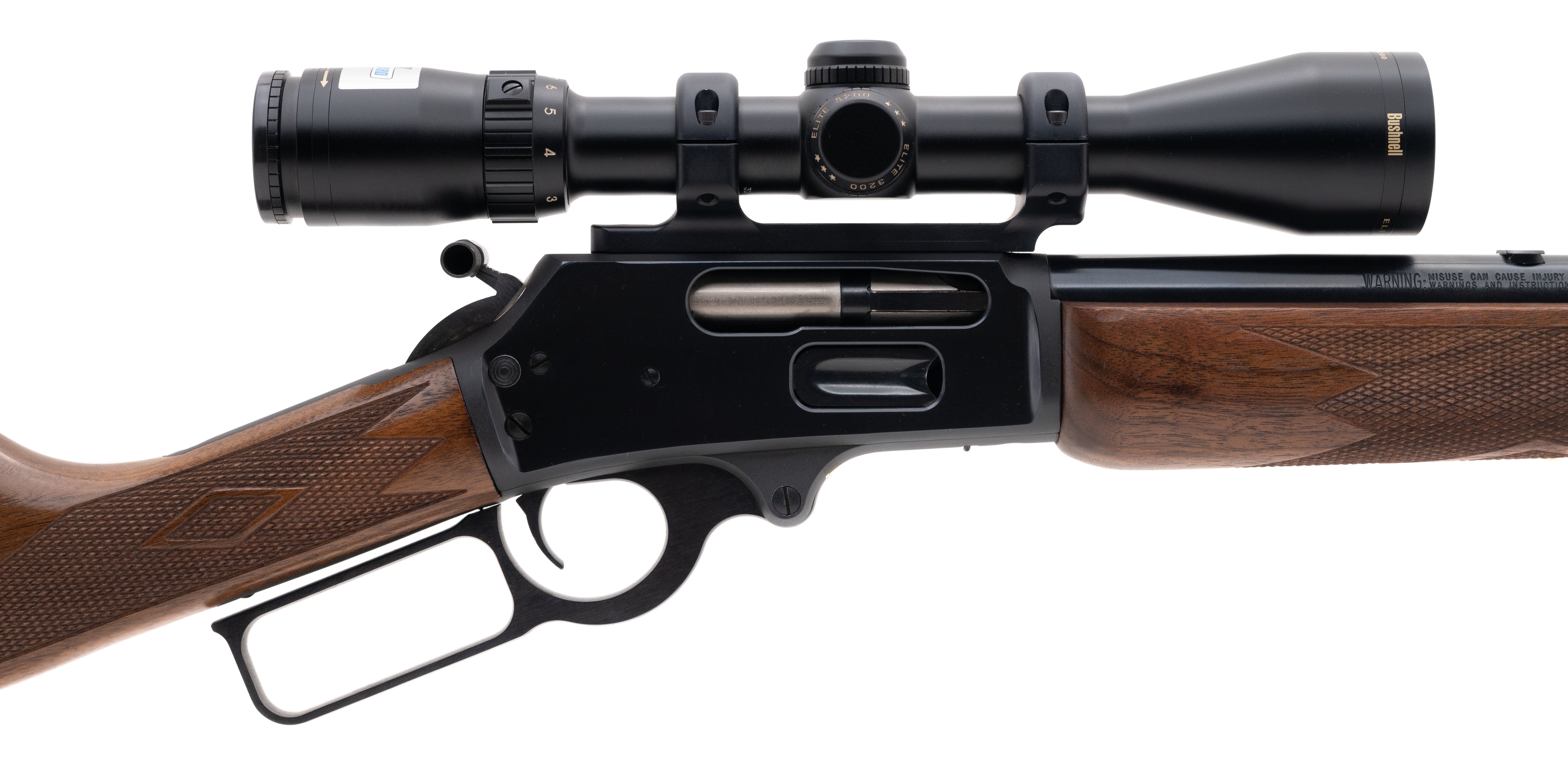 SN: 99007530. Manufactured in 2001, .45-70 Govt with 18.5" barrel. JM Marked lever action gun with ported barrel, hooded front sight, offset hammer spur, checkered stock and forend with LOP of 13.2". Overall excellent condition. Comes with Bushnell Elite 3200 3-10x scope on a DNZ mount. (Consignment)