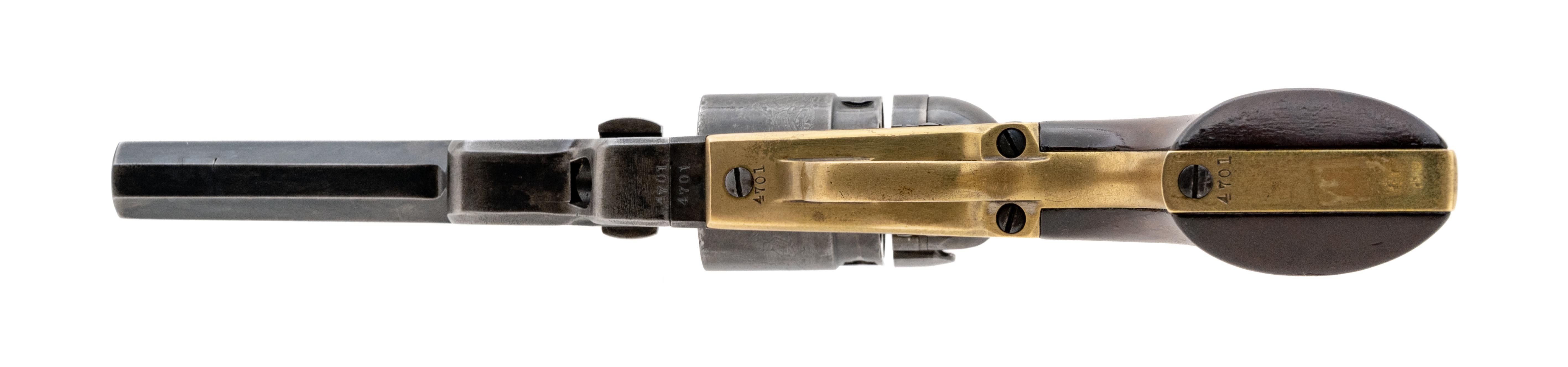 SN: 4701. Circa 1872. .38 Colt Rimfire with a 4.5" octagonal barrel, bore is good with strong rifling and scattered pitting. A-style frame pocket single action revolver with approximately 50% bluing, engraved cylinder, brass trigger guard and backstrap with varnished walnut grip. Overall in good condition. (Consignment)