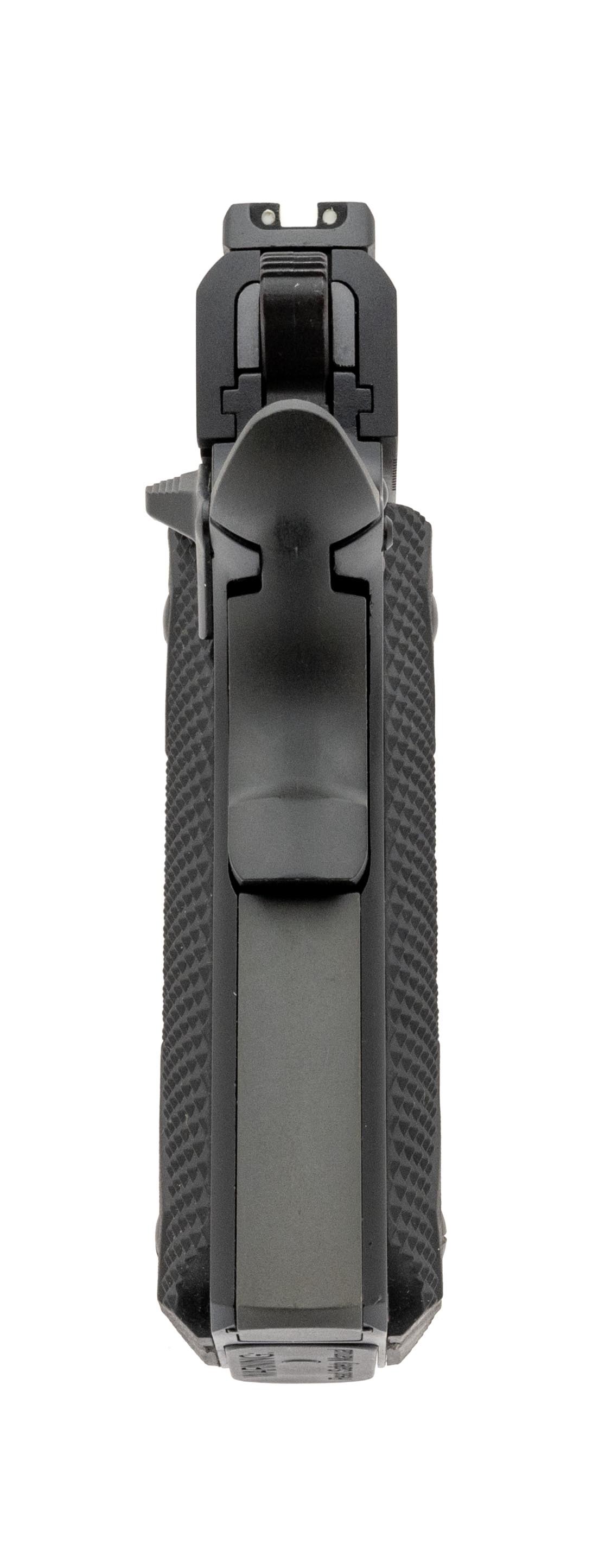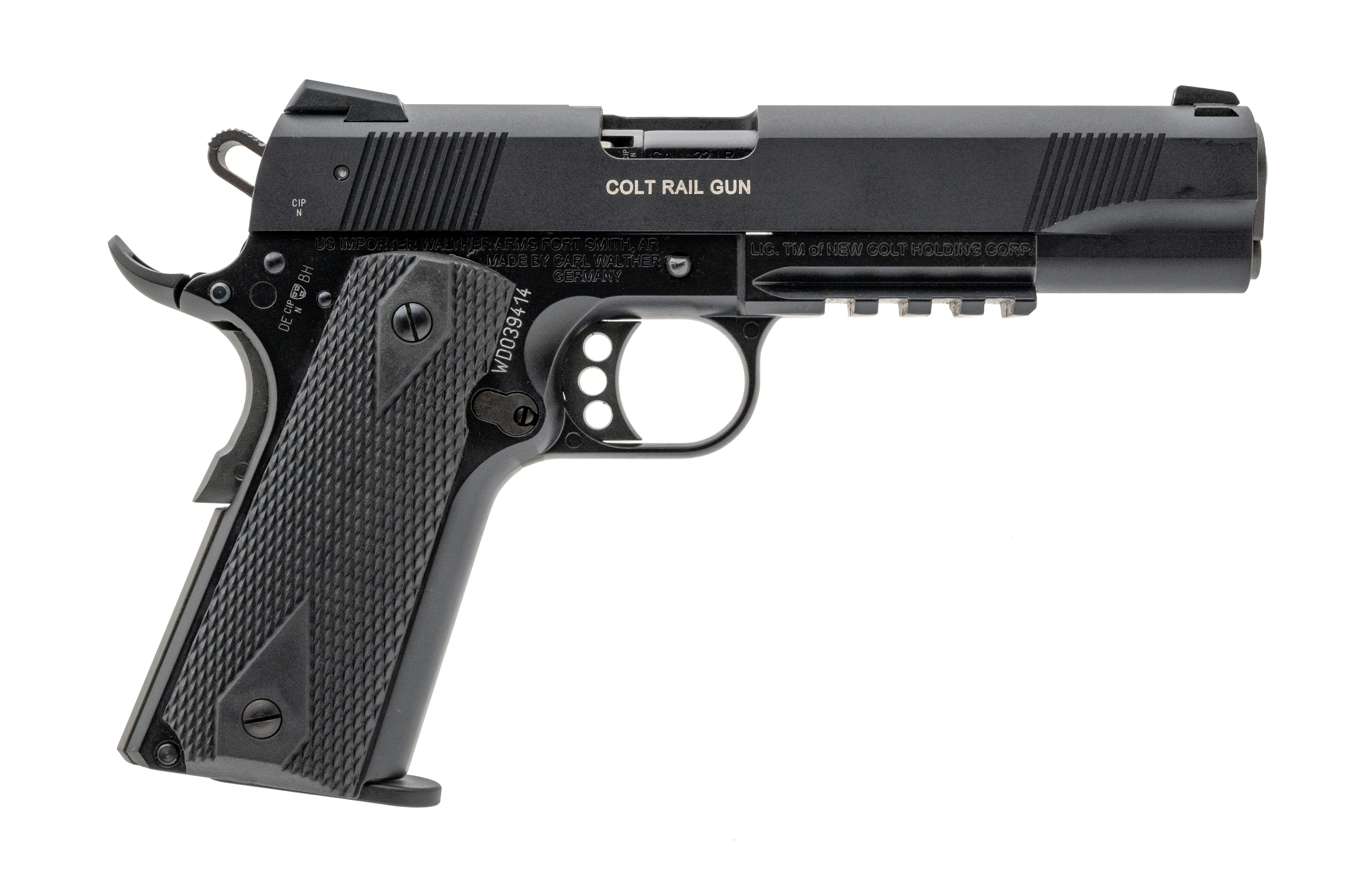 SN: WDO39414. Modern production. Chambered in .22 Long Rifle with a 5" barrel, bore is excellent. Rimfire 1911 frame handgun with black frame-slide, accessory rail, extended beavertail and black rubber grips. Overall excellent condition. Comes with box and extra magazine.