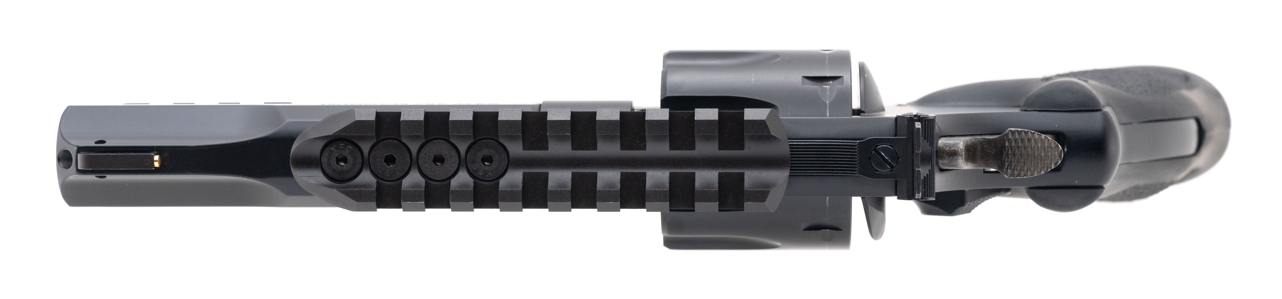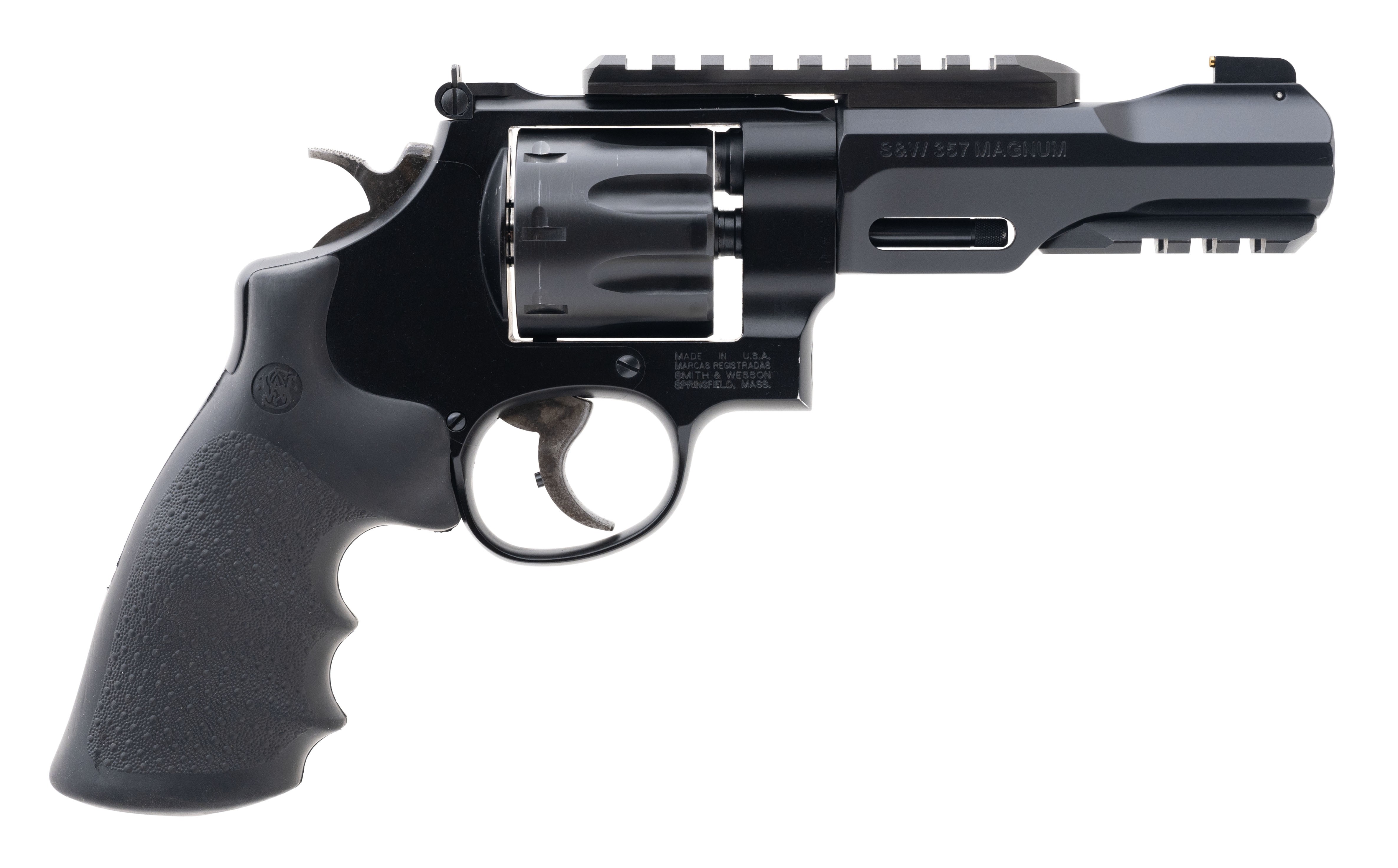 SN: DJW5561. Modern production. Chambered in .357 Magnum with a 5" barrel, bore is excellent. Double action revolver with steel frame, black finish, adjustable rear sight, picatinny optic-accessory rail. tuned trigger and black Hogue rubber grips. Overall excellent condition. Comes with box.