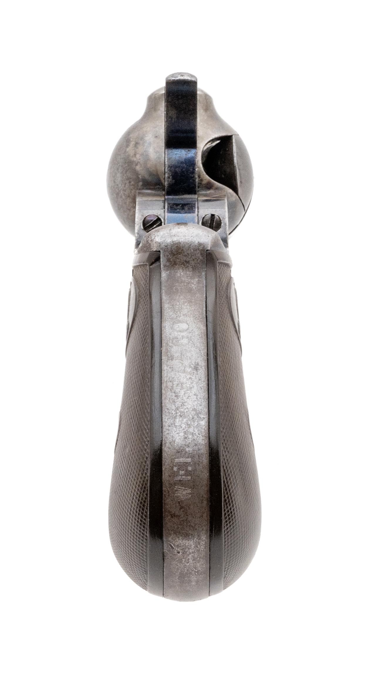 SN: 148649. Made in 1904, 38 Long Colt caliber with a 4.5" barrel. Bore is very good, bright with light etching. Double action revolver with about 60% blue finish and traces of case colors. The grips are very good with light wear. The backstrap is engraved "Wells Fargo" very lightly. There's no record that Wells Fargo every ordered Colt Lightnings so we assume the marking was added later spuriously. A good looking western Colt revolver.