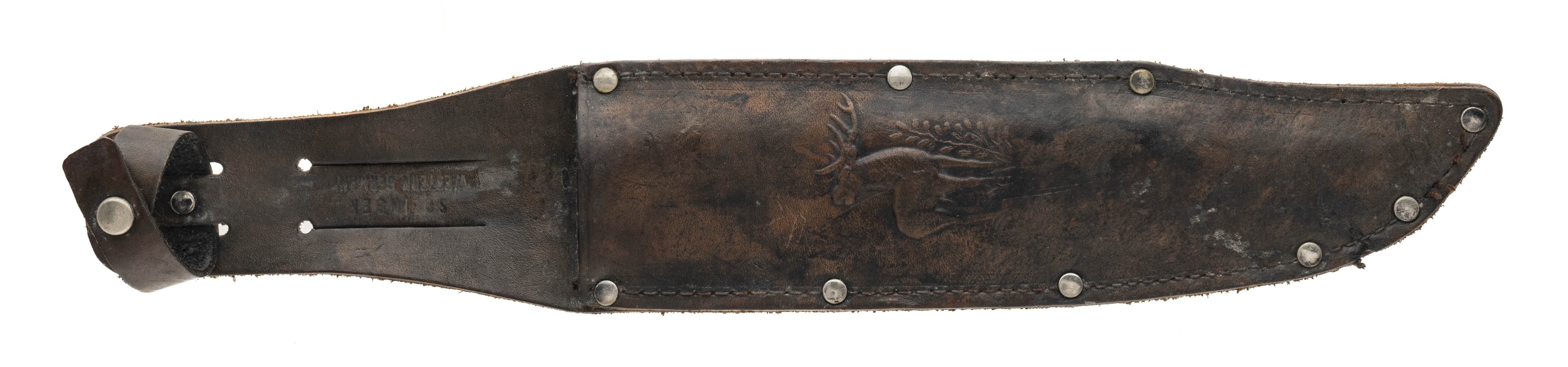 "I Cut My Way" 8" blade, 13" OAL with stag handle, aluminum pommel & brass guard. Sheath is replacement German made leather sheath. Condition very good with some light patina.