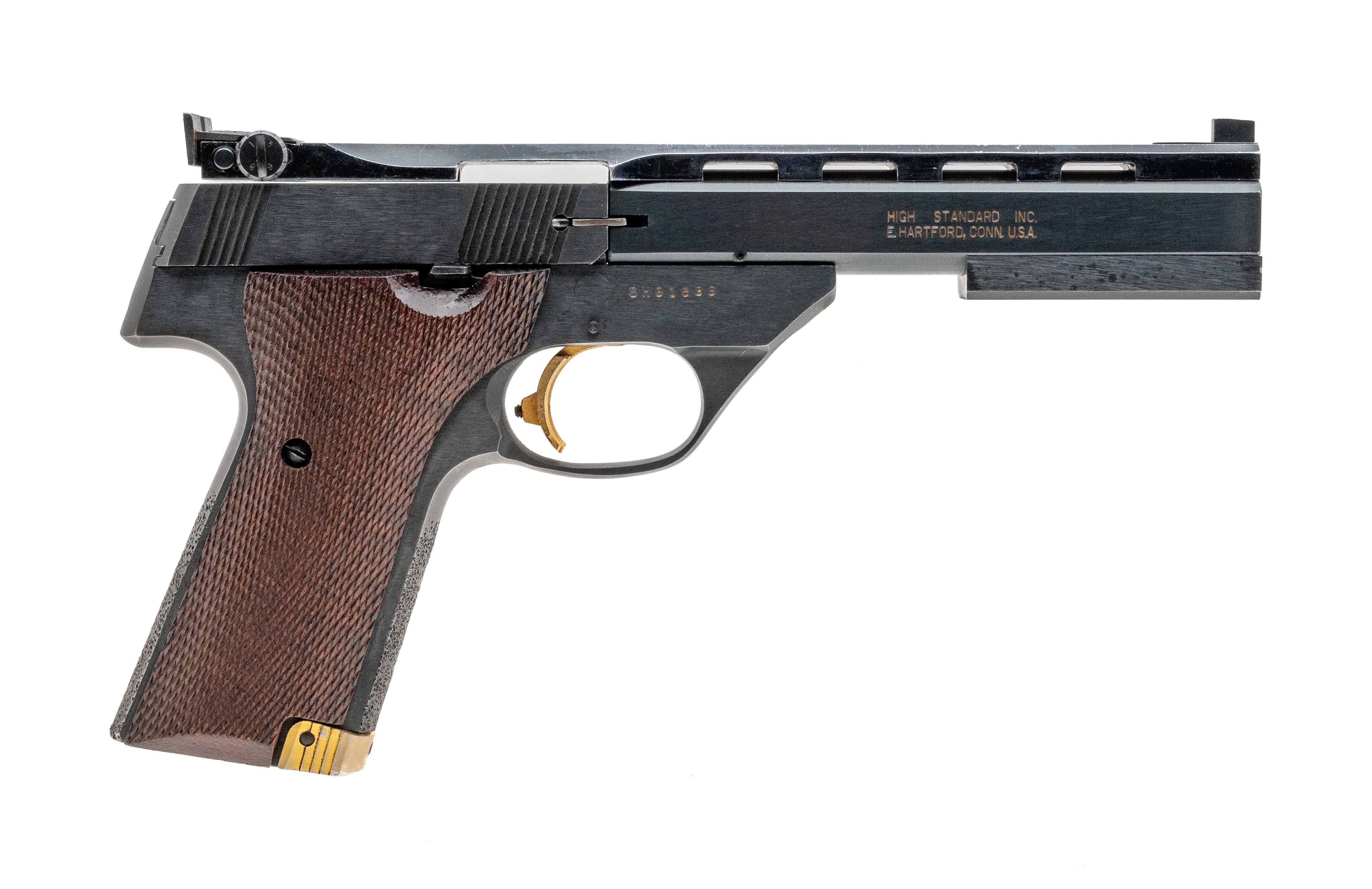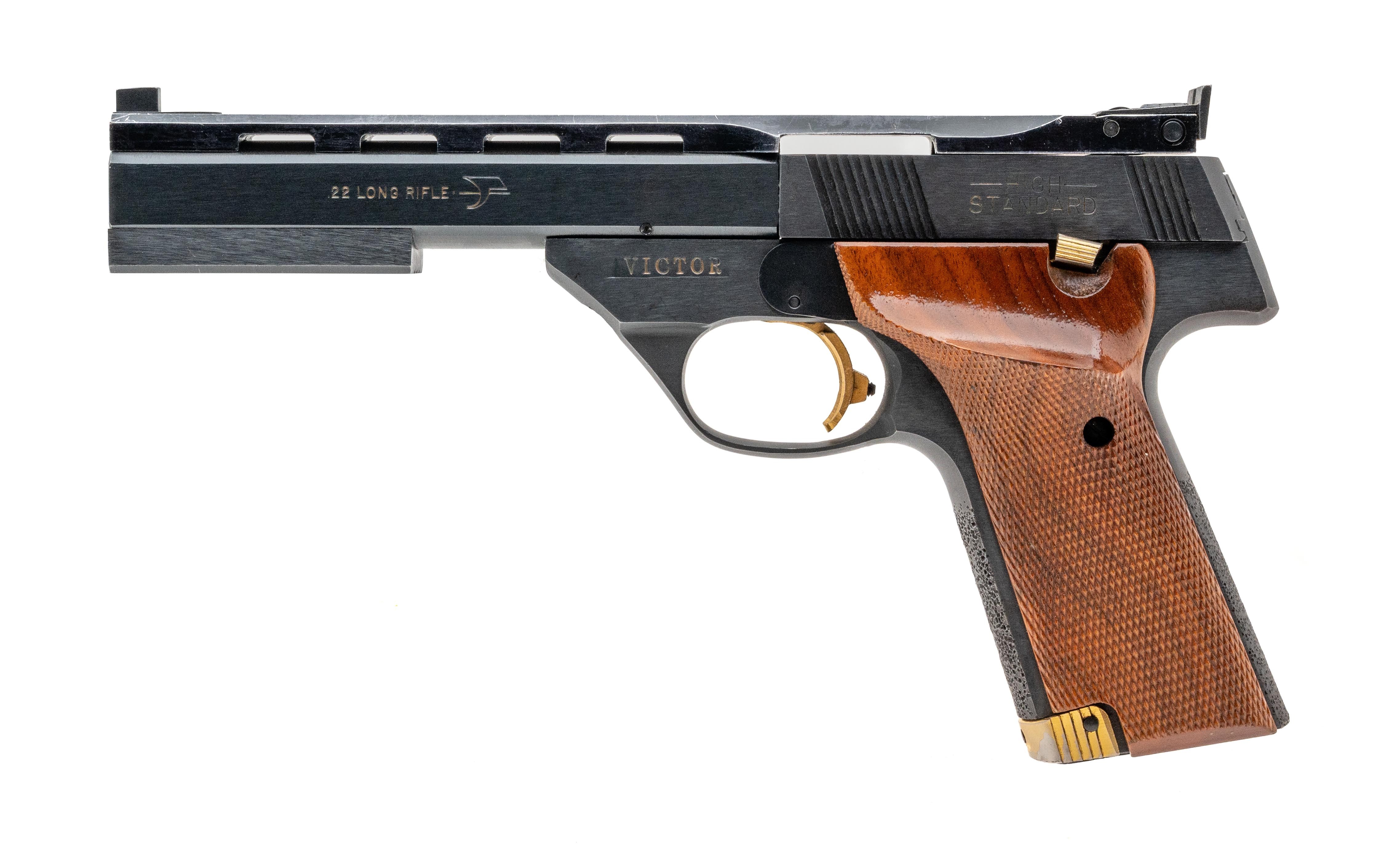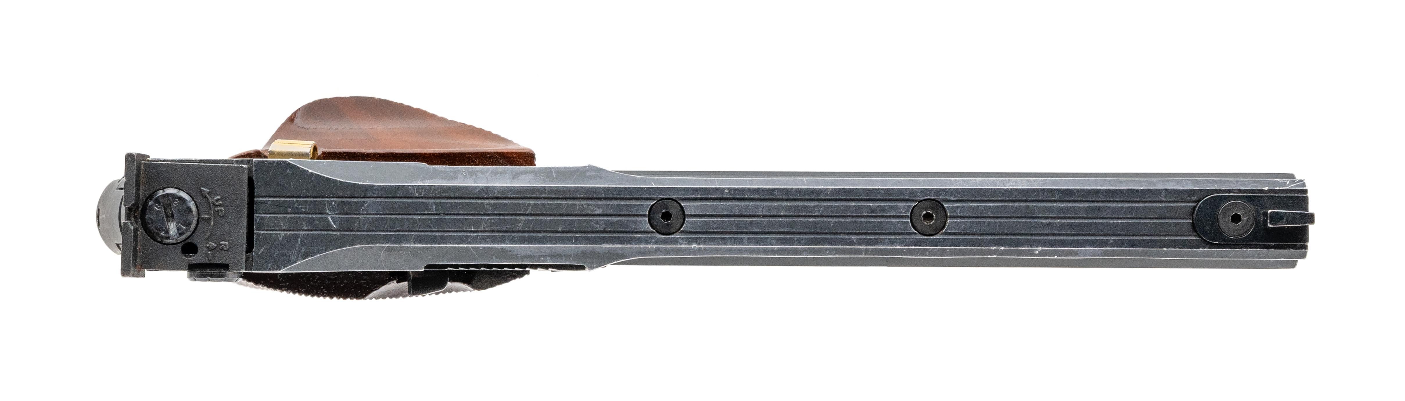 SN: SH31633. Circa 1980s. .22LR with a 5.5" barrel, bore is excellent. Rimfire semi automatic handgun with blued finish, adjustable rear sight and target wood grips. Overall very good condition.