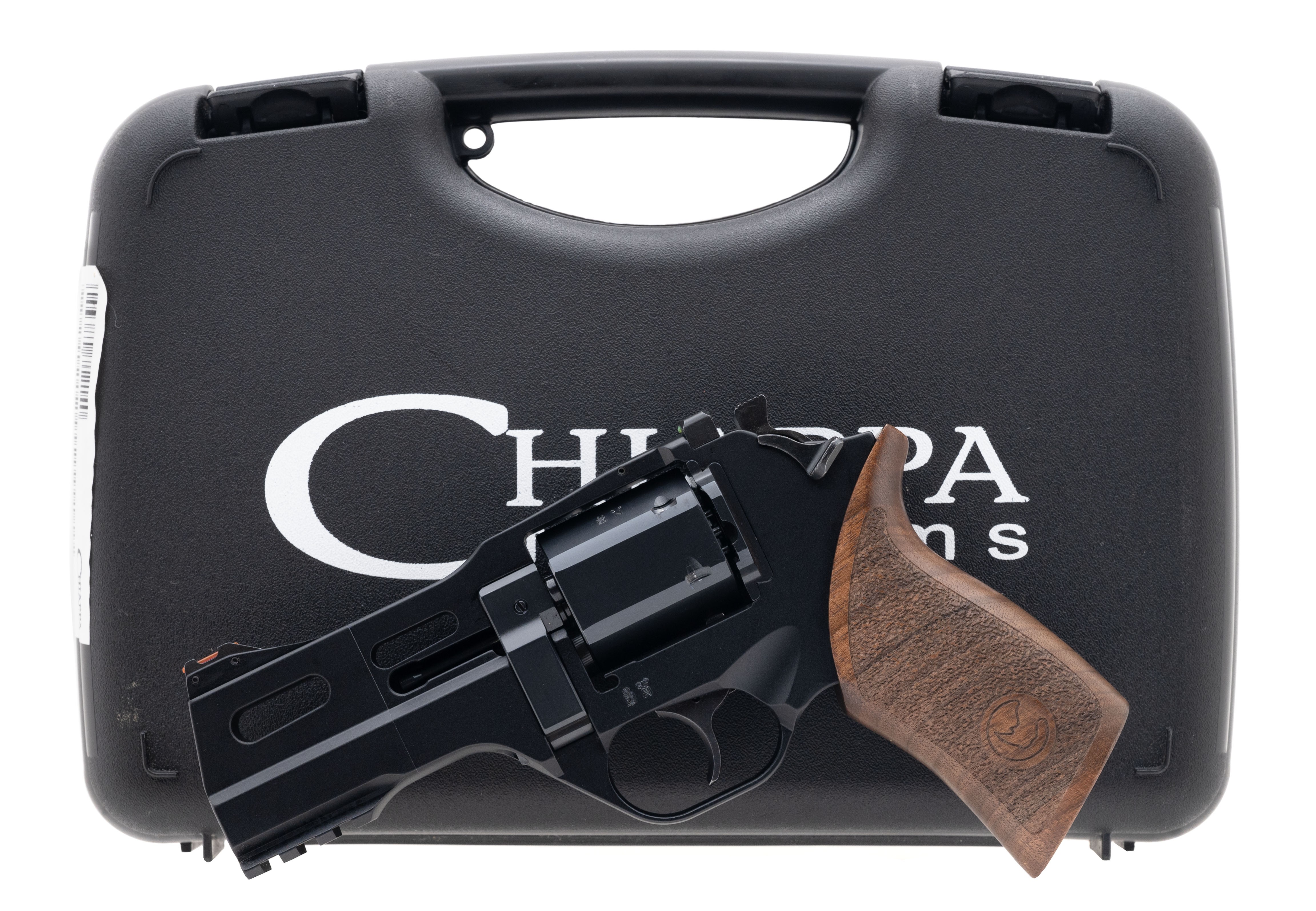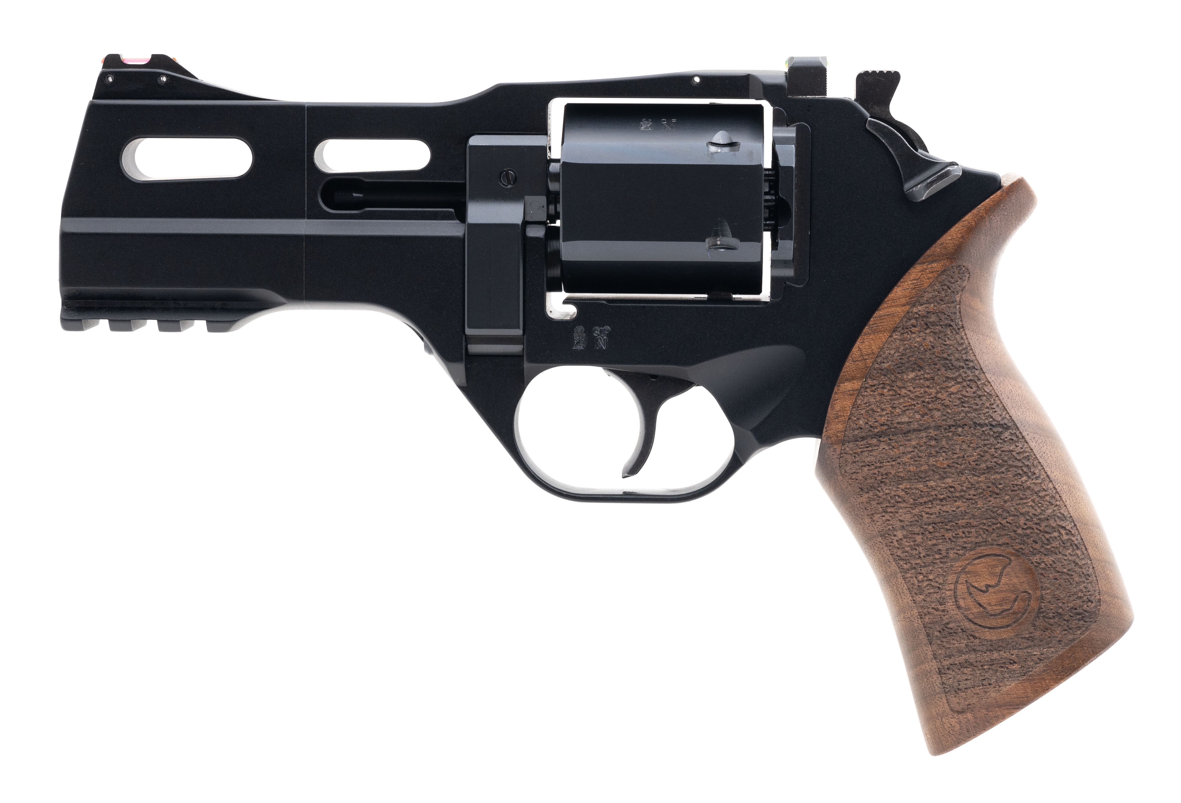 Low bore axis double action revolver with 4" barrel, black anodized frame, red fiber optic front sight, adjustable green fiber optic rear sight and walnut grip. NEW. UPC: 8053670712140.