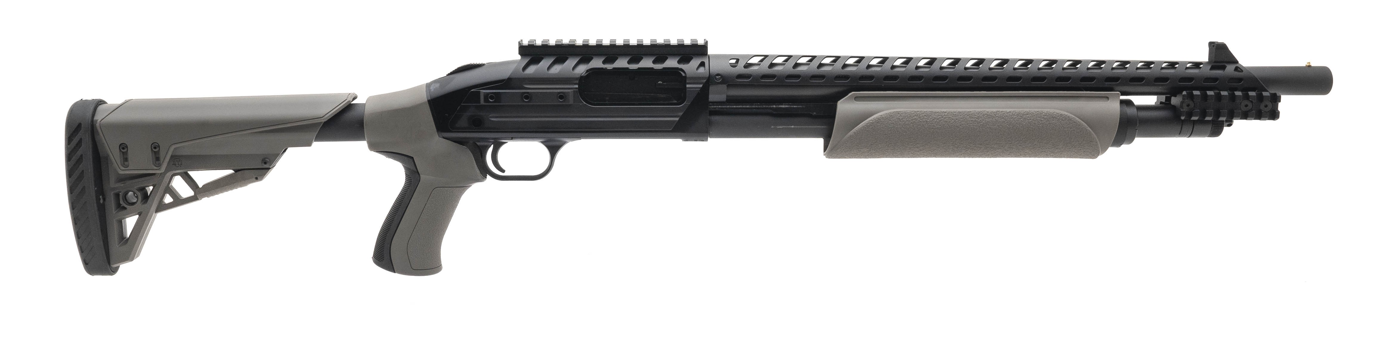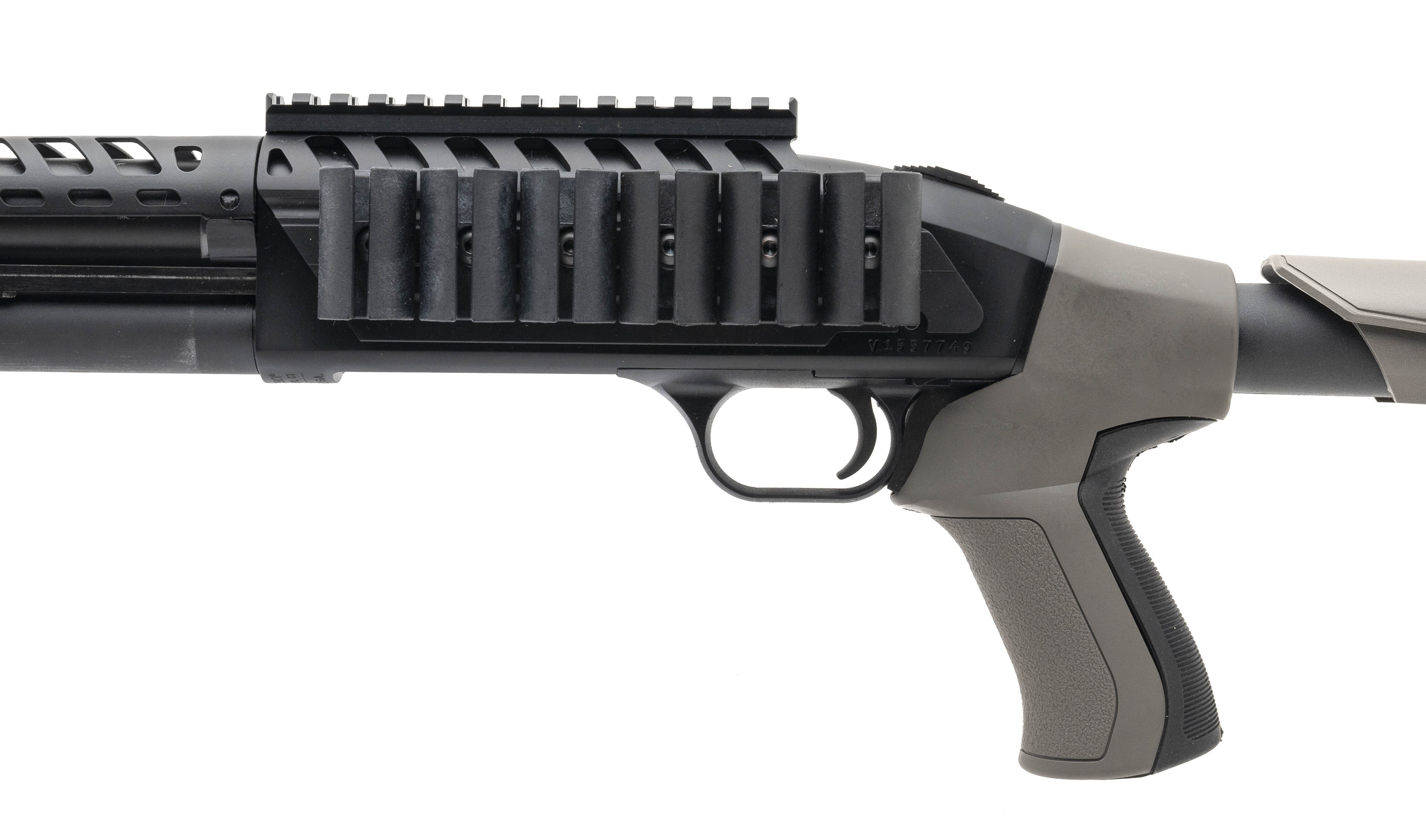 SN: V1557749. Modern production. 12 gauge with a 18.5" barrel, bore is excellent. Tactical pump action shotgun with heatshield, side mounted rails, picatinny rail, shell holder, FDE pump and ATI adjustable stock. Overall very good plus condition. Comes with box.