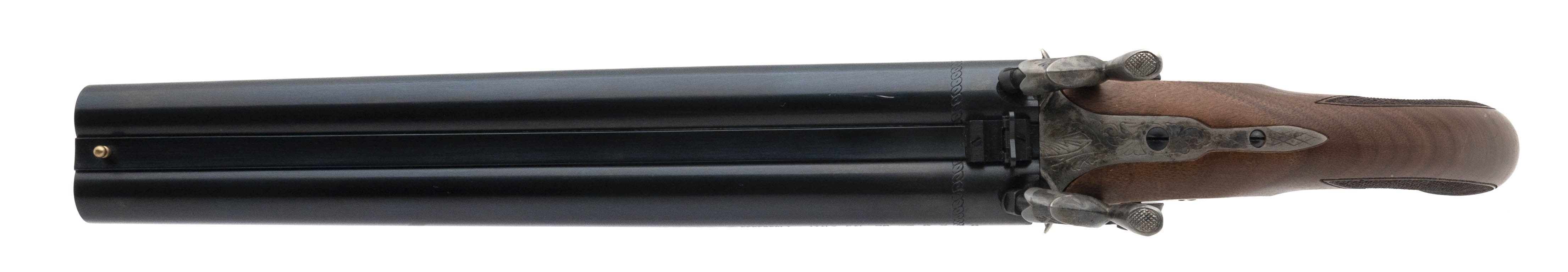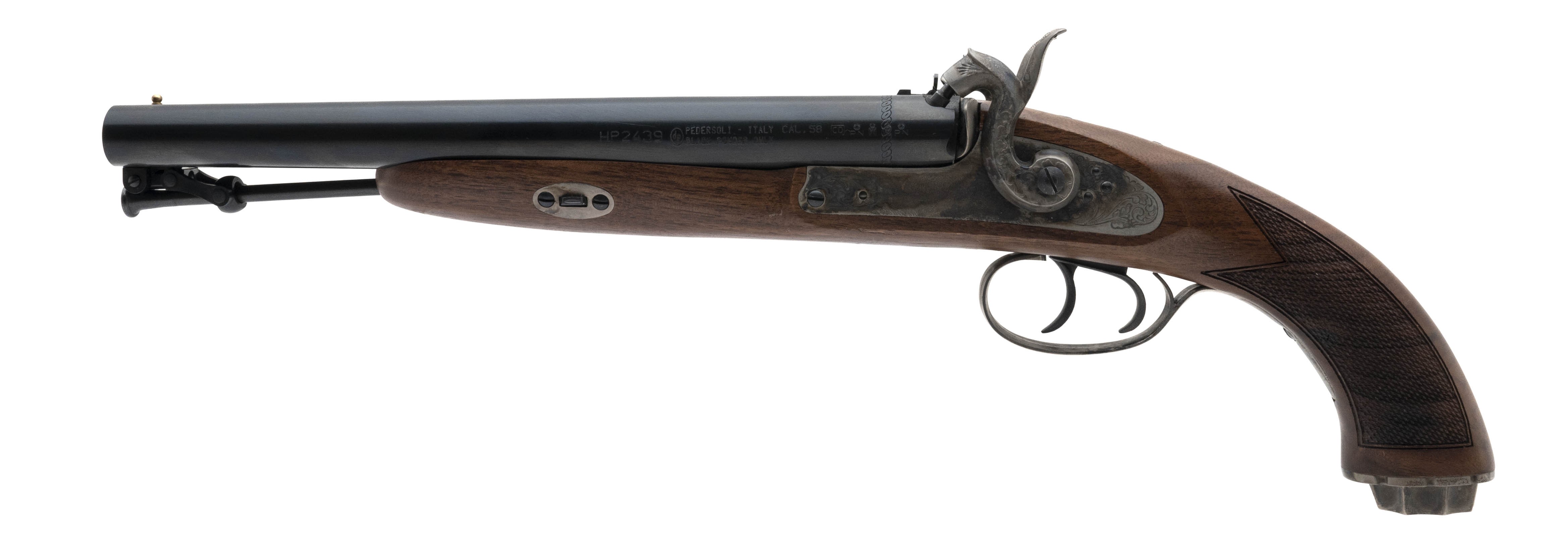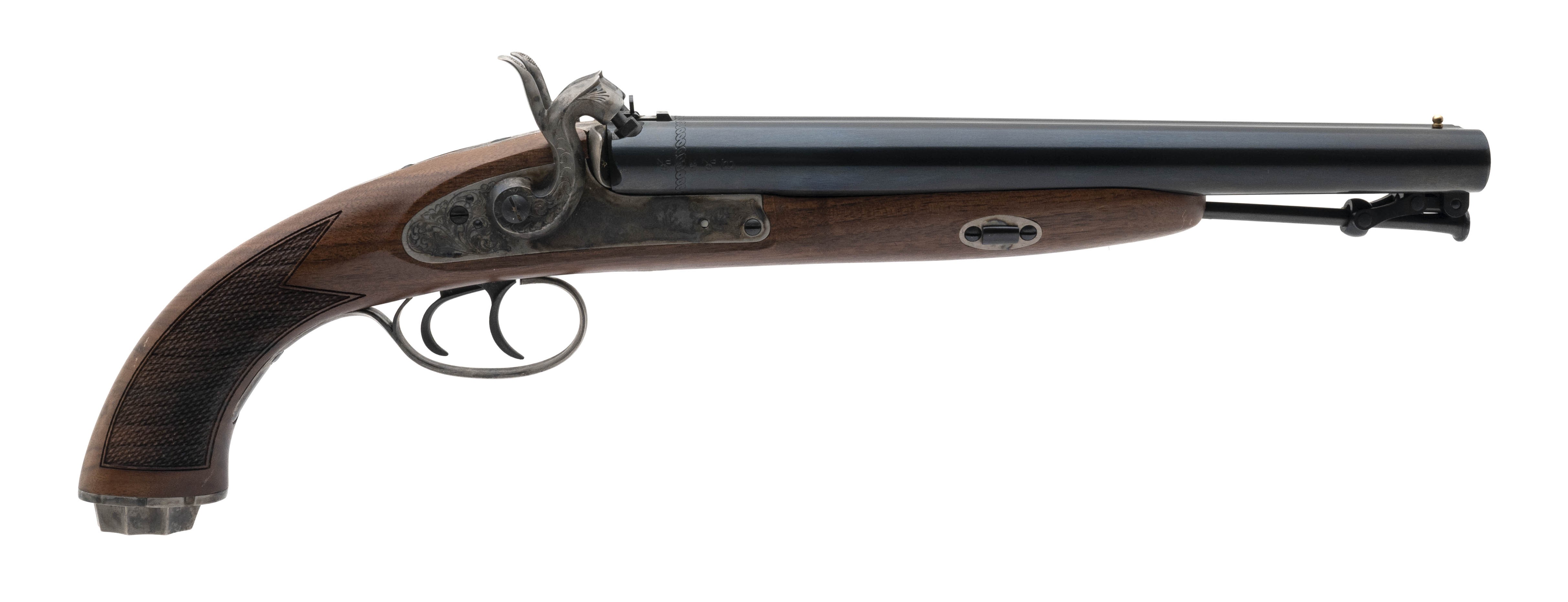 SN: BP296. Modern production. .58 Cal with 11.25" barrels, bore is excellent. Modern black powder double barrel pistol with blued finish, engraved lock plates and American walnut stock. Overall excellent condition.