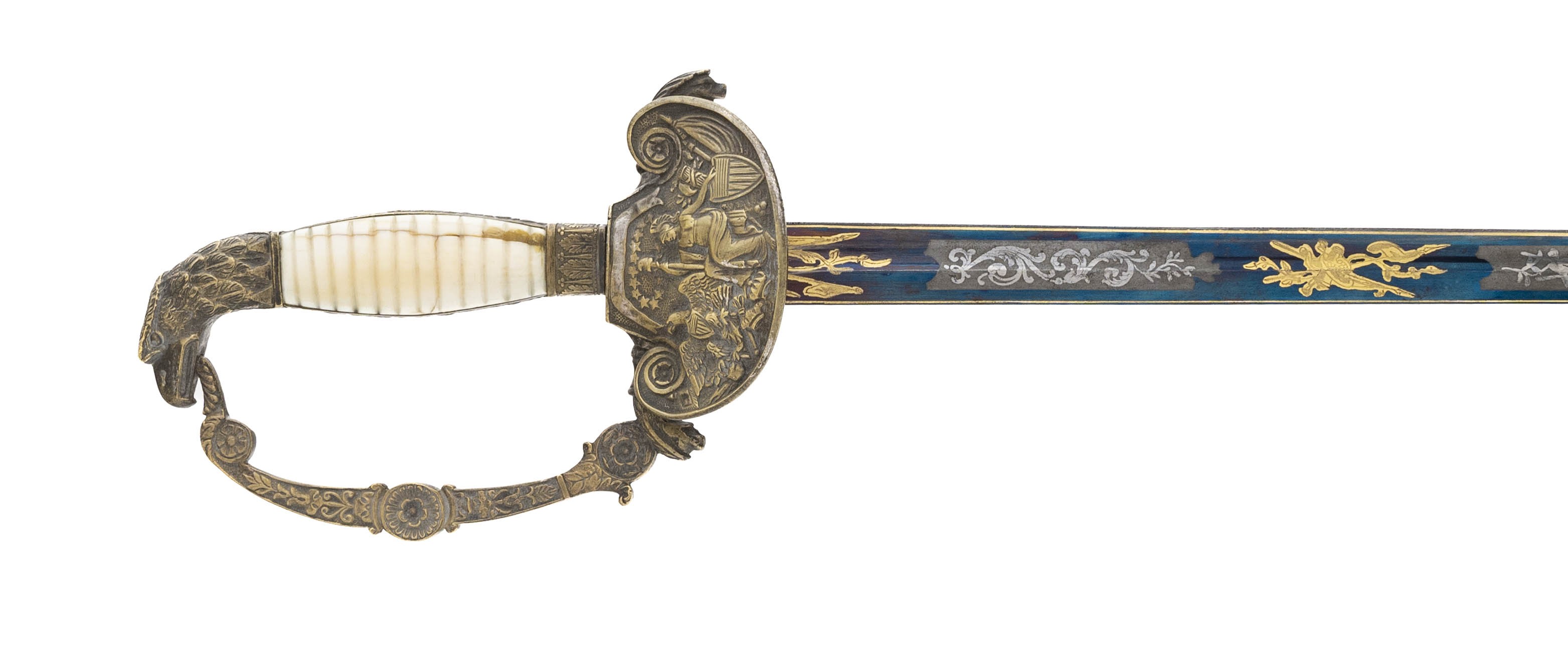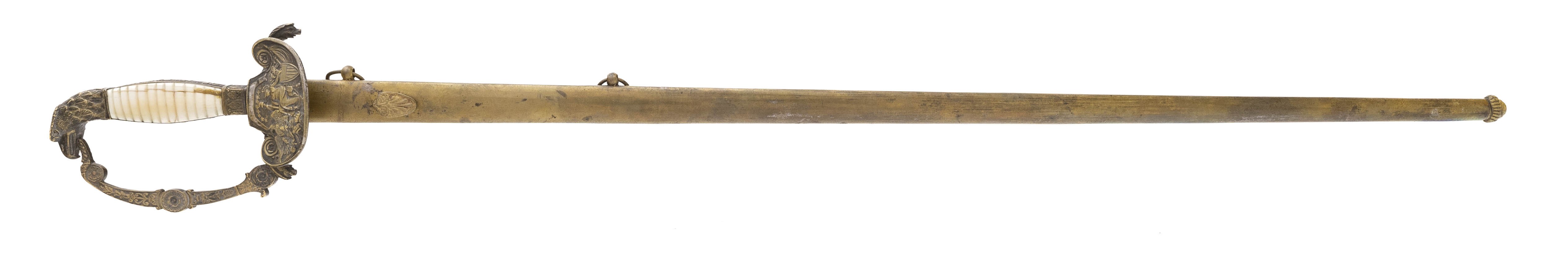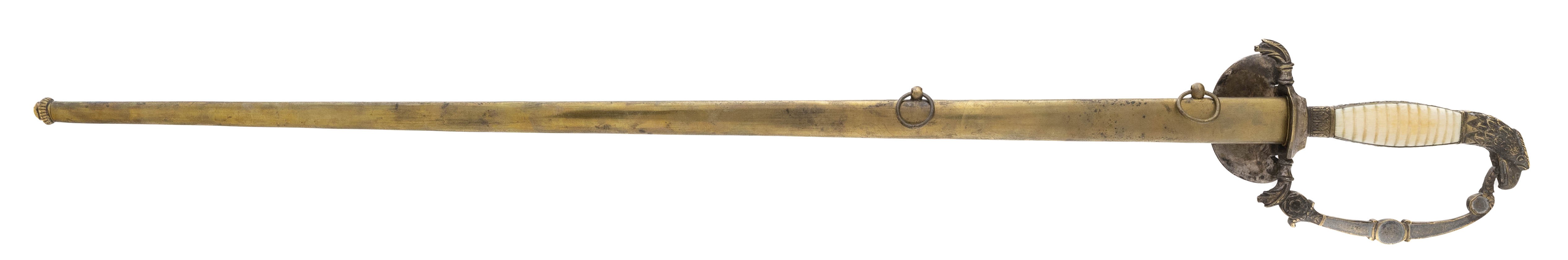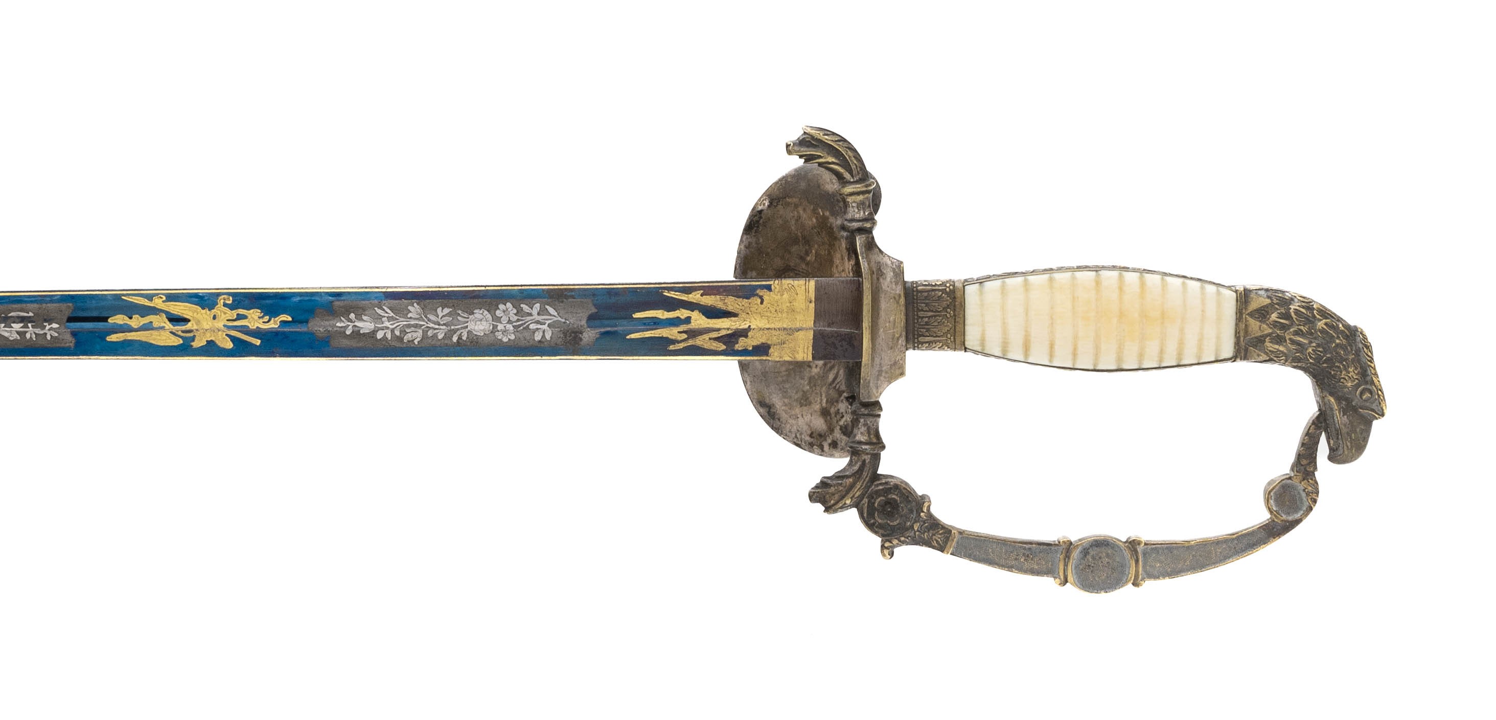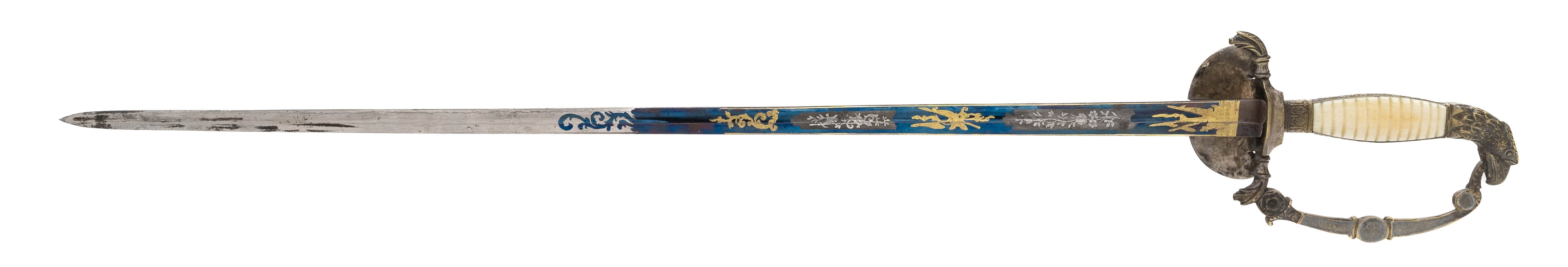 Circa 1800-1820s. Total length 38”, blade length 32”. Ivory handle with small crack. Original blue color that has thinning noted on the edges. Overall, in good condition comes with scabbard which has small pigmentations.