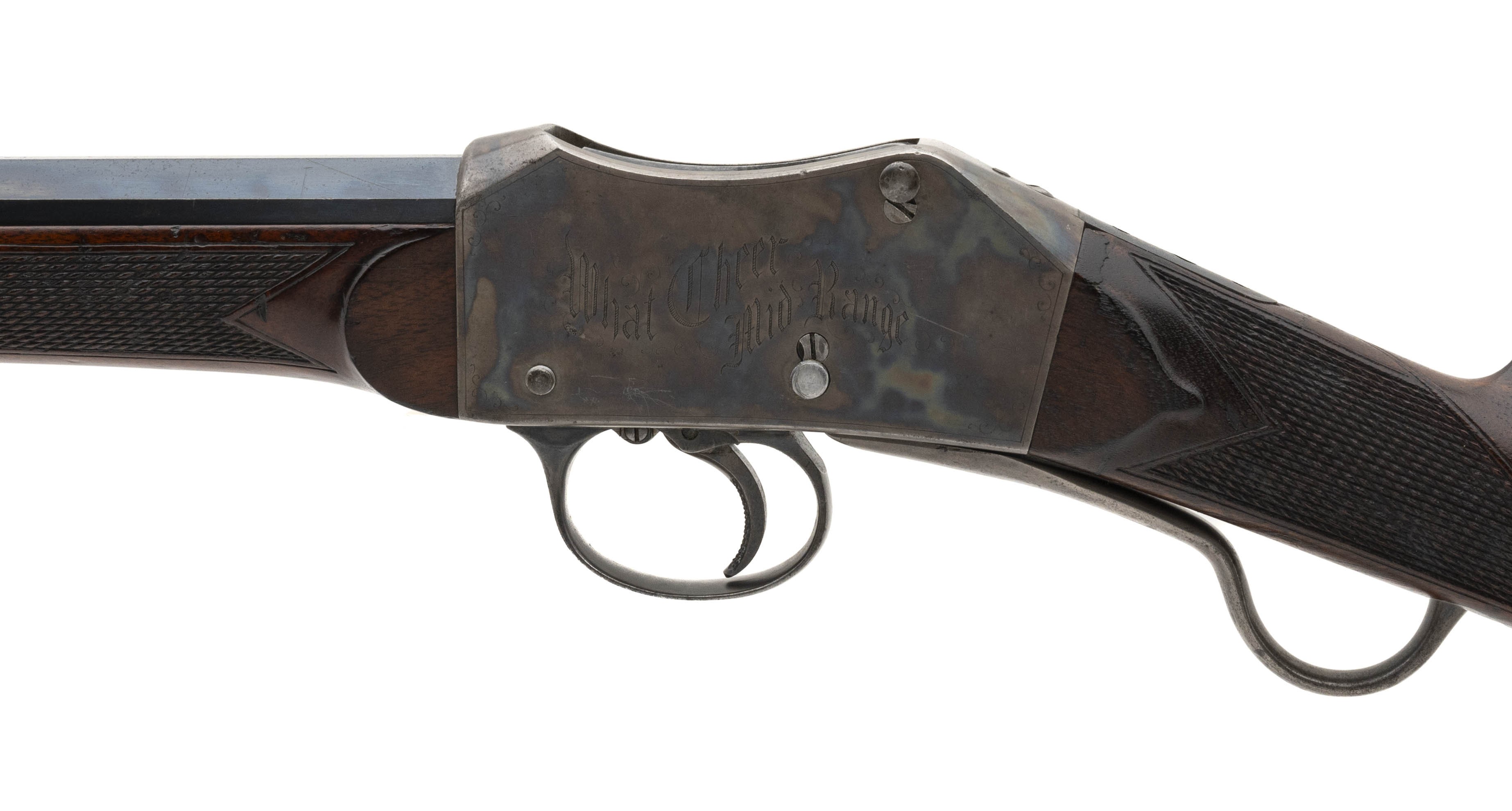 Made circa 1870s. 40-70 with a 30" barrel. Bore is excellent. Mid range Single shot rifle with 95% original blue finish and all the case colors on receiver. Receiver is engraved with "What Cheer Mid Range". Wood is very good. Overall condition is excellent.